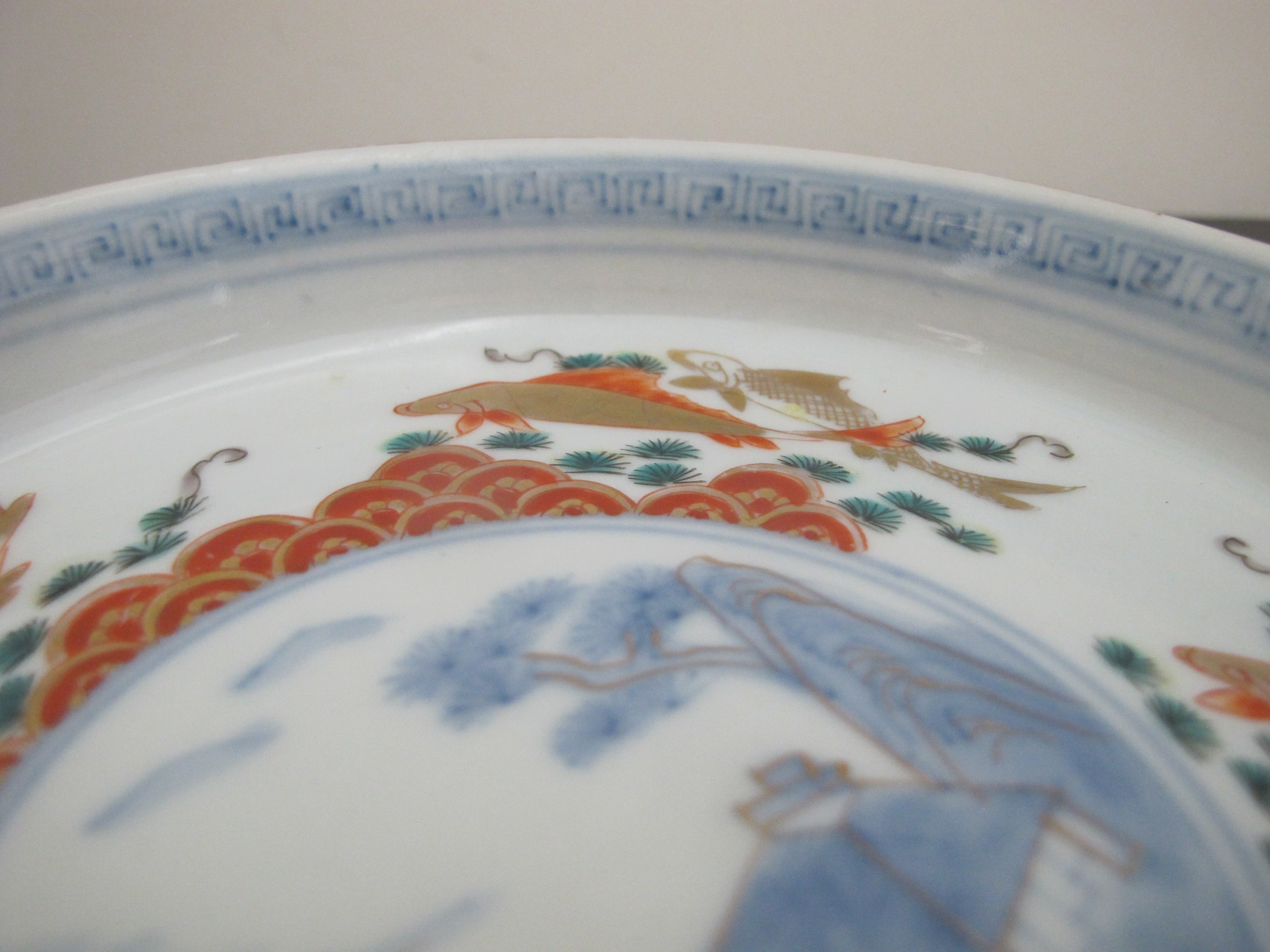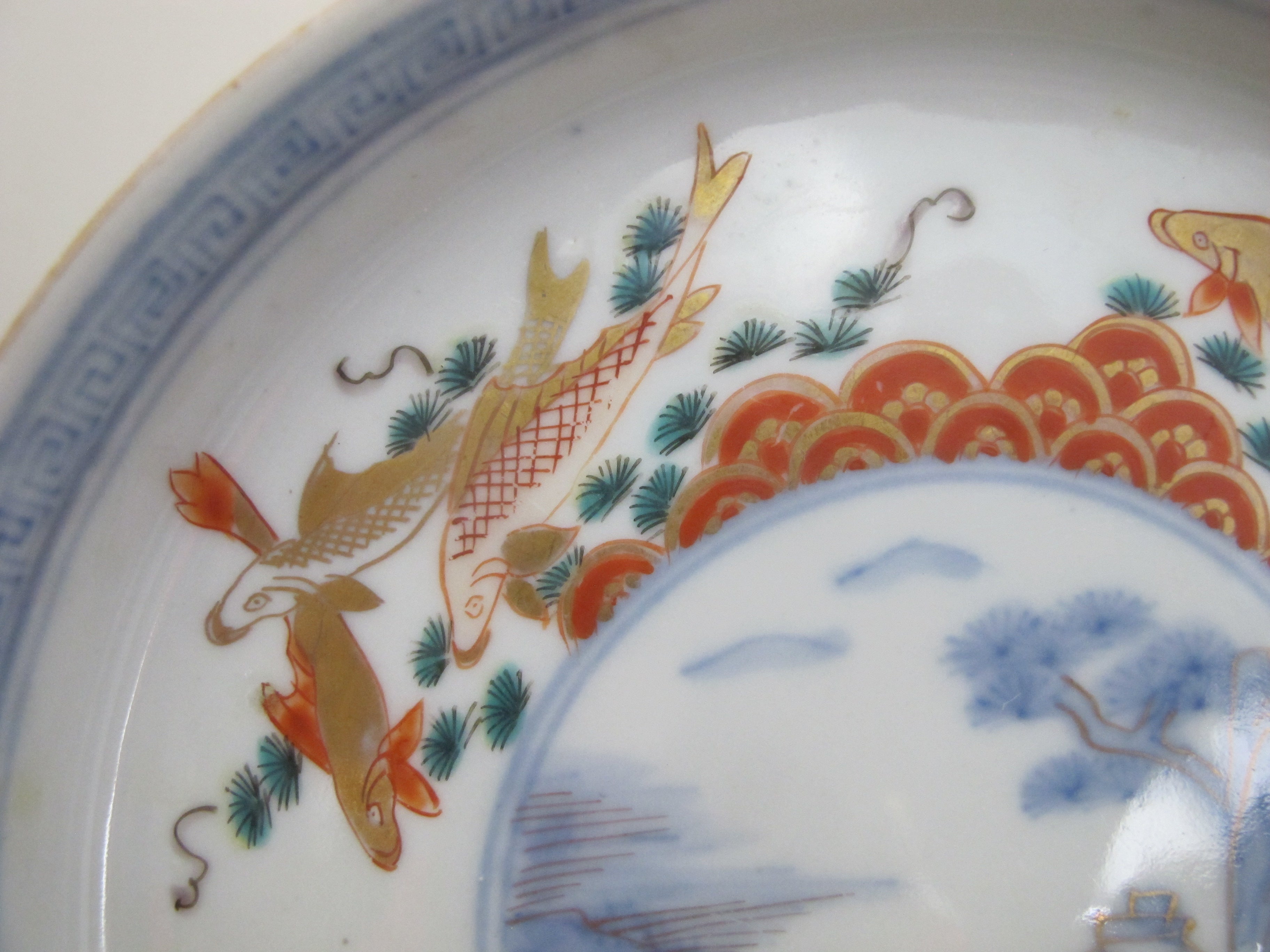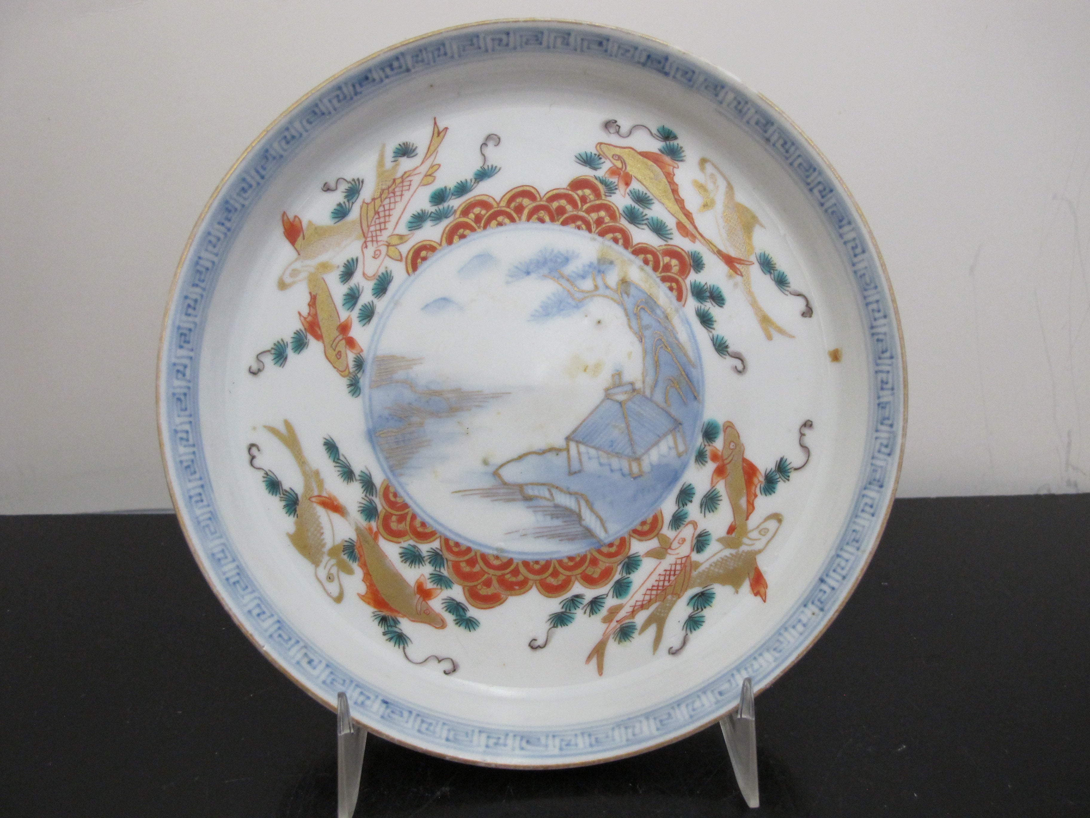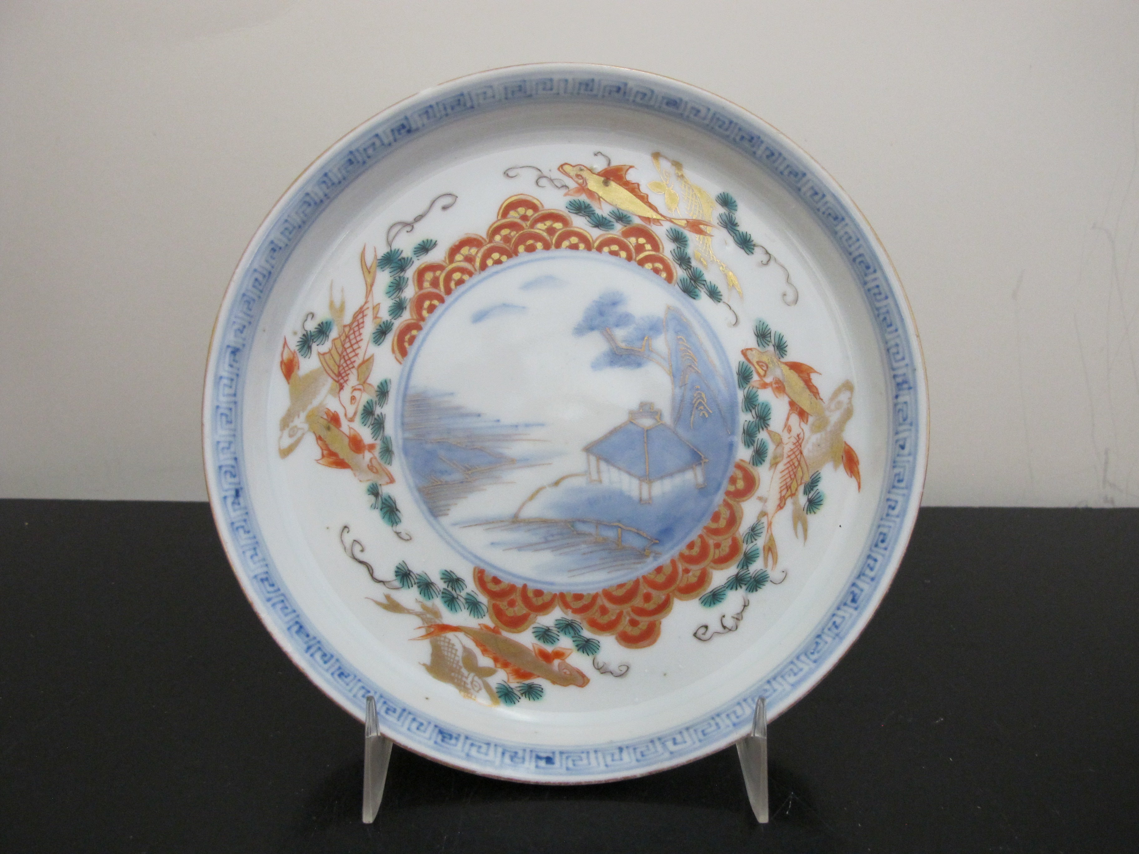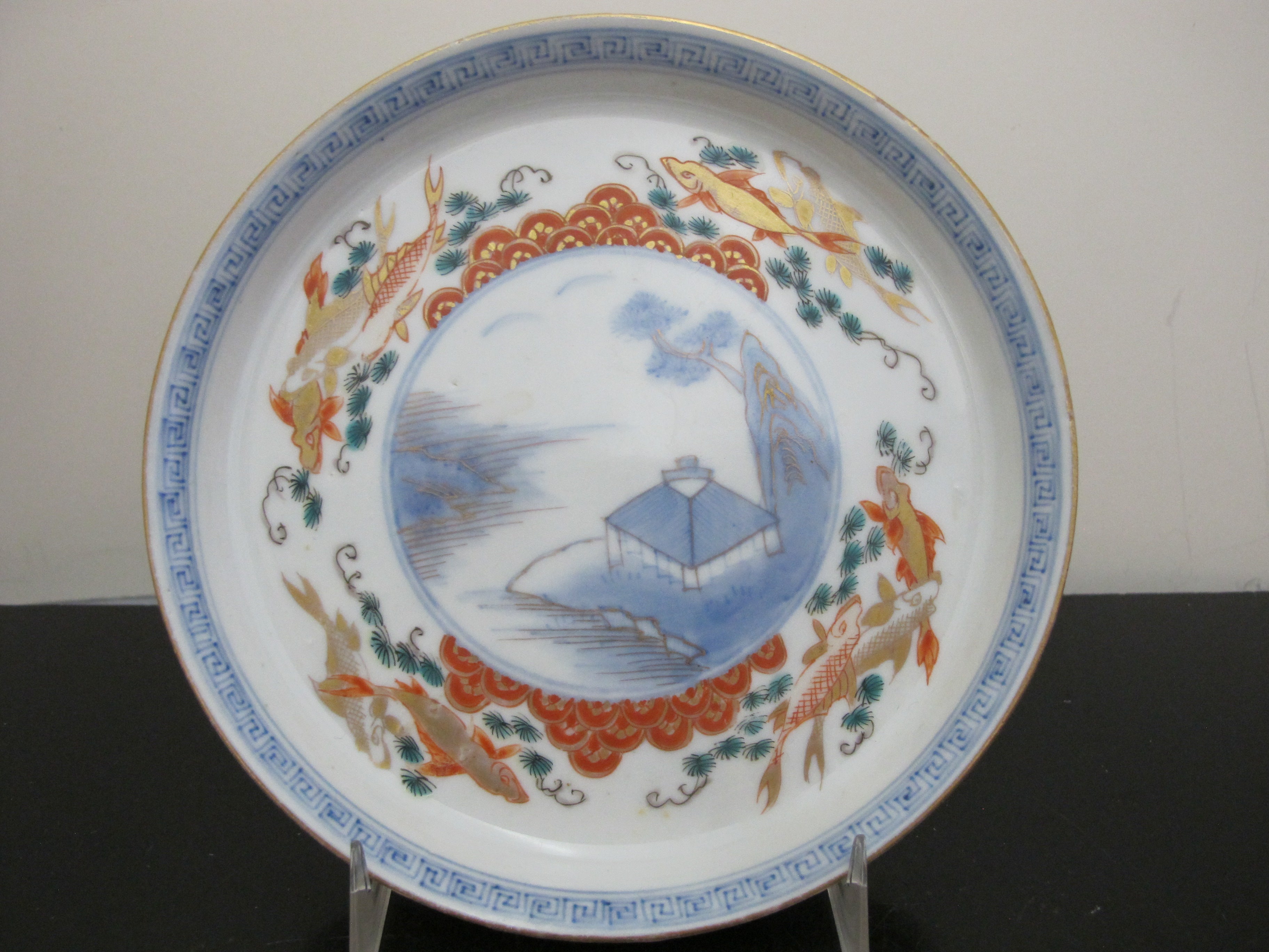 JAPANESE Gilt Arita IMARI Porcelain VILLAGE Landscape & Fish Design Plate Set