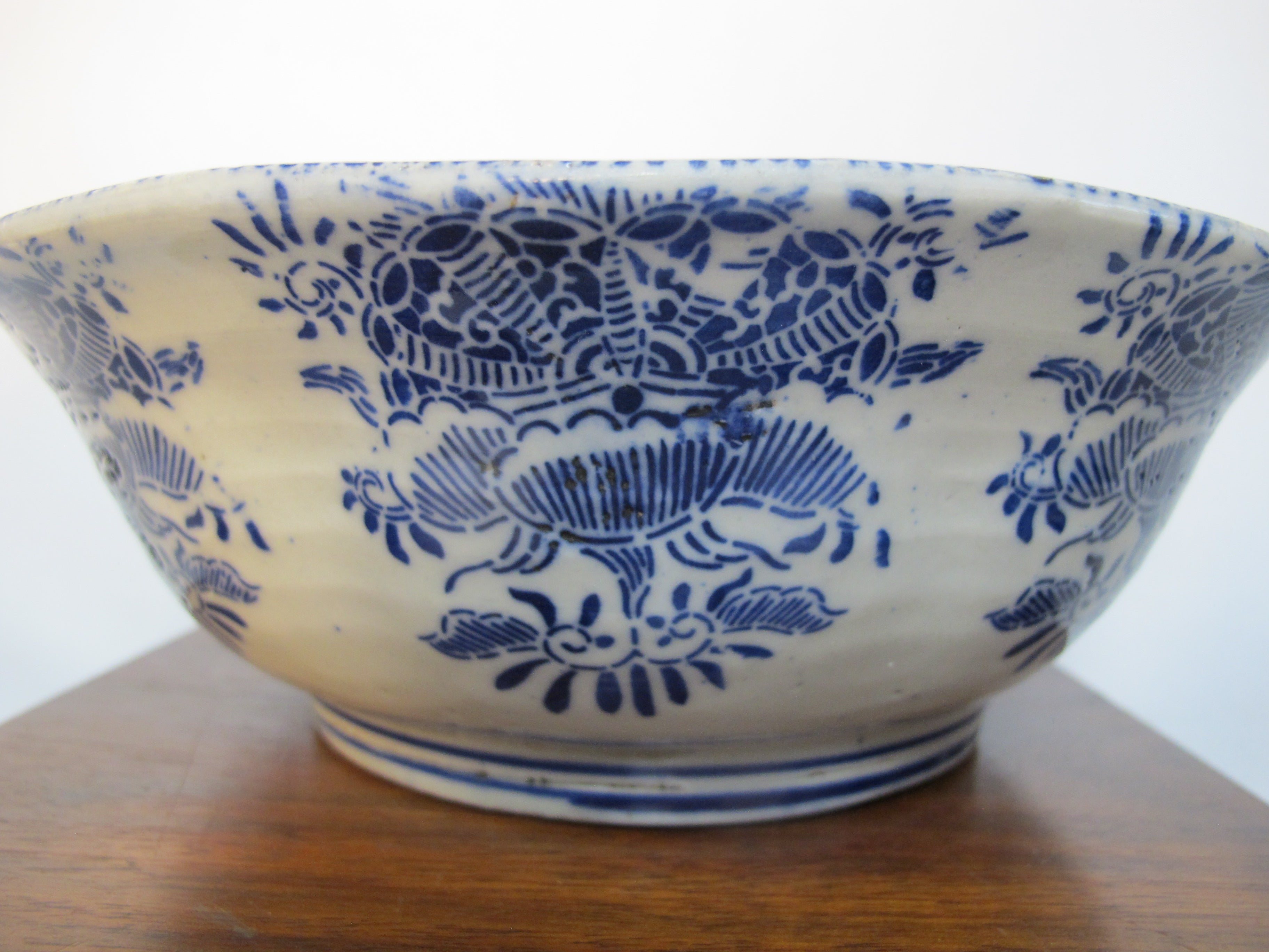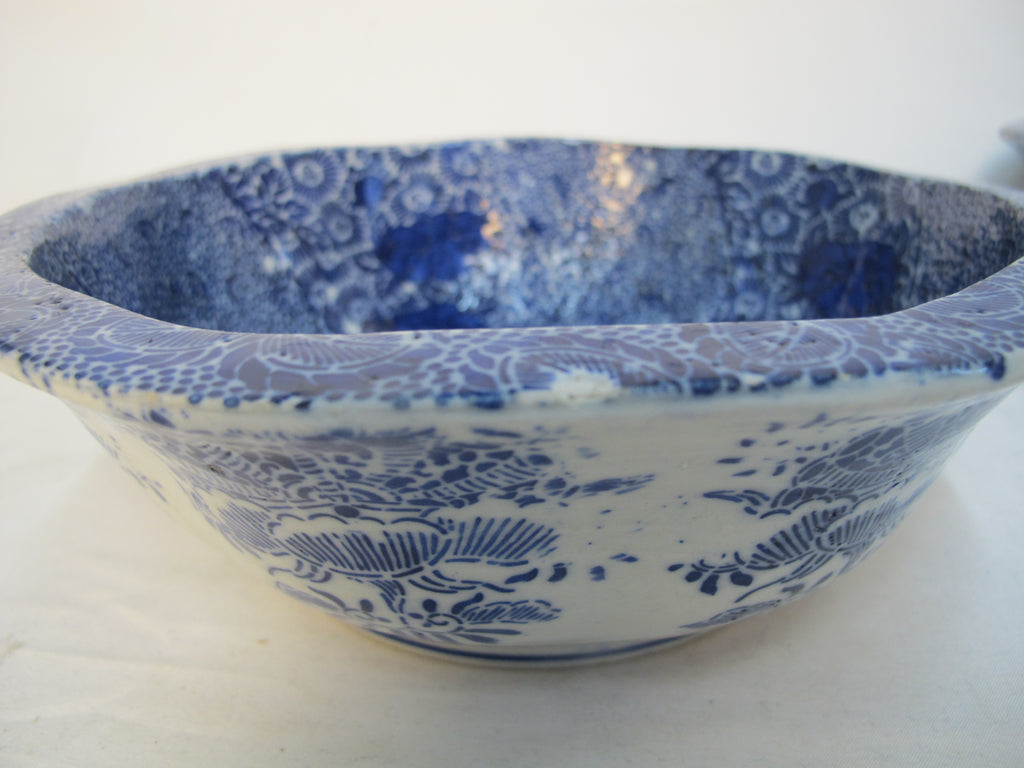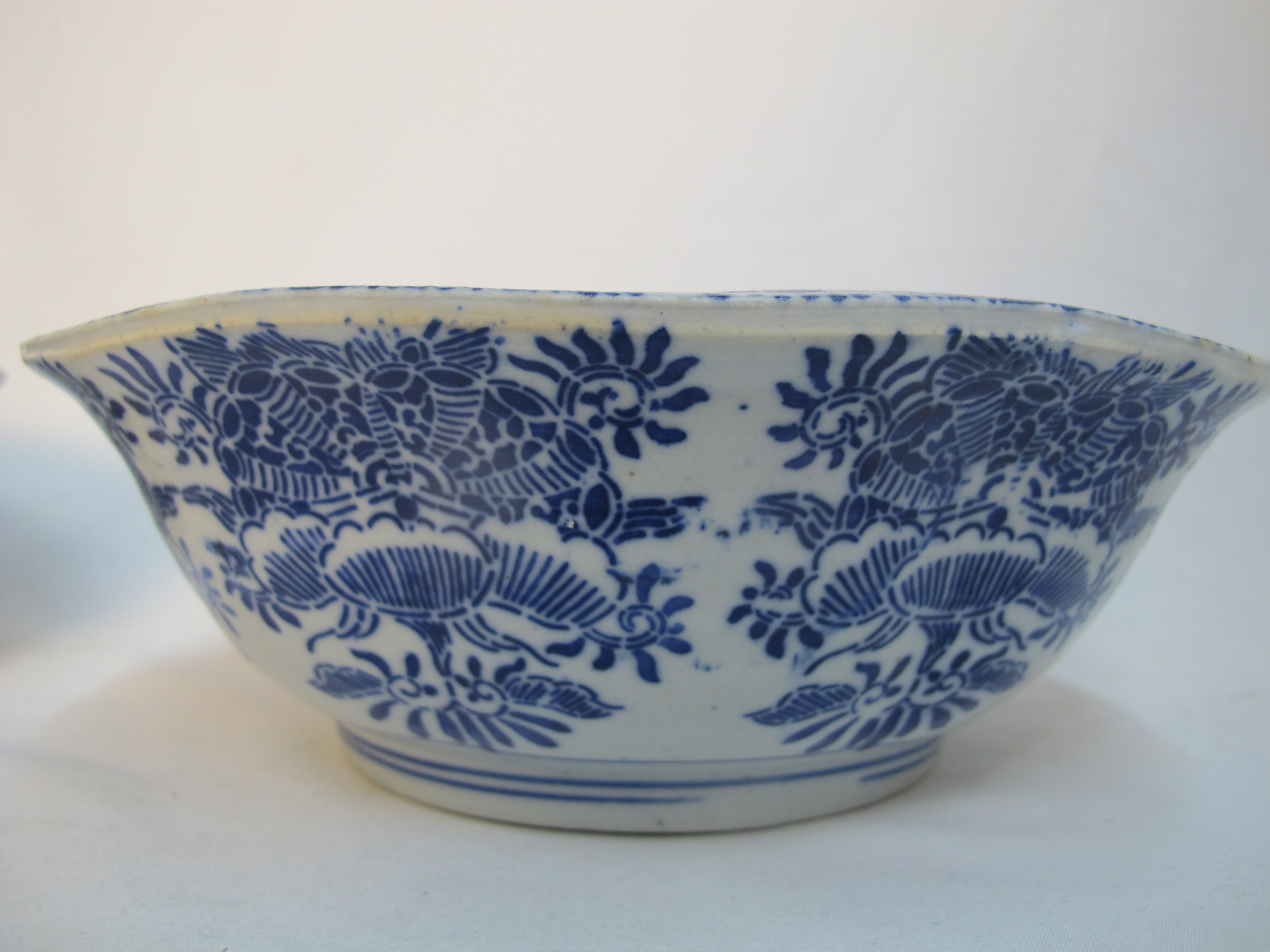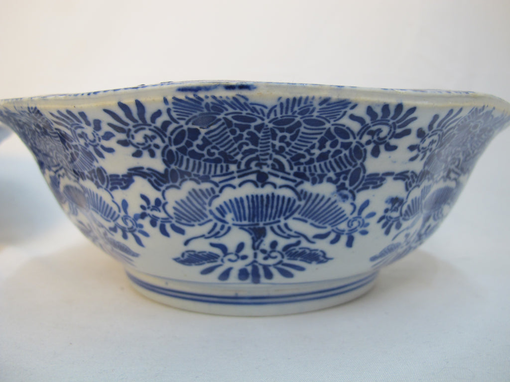 Absolutely stunning Japanese porcelain bowl set of 3. I believe these are early 20th century. Each bowl in a bold cobalt blue with white undertone showing a pinwheel type design of flowers and geometric shapes.
