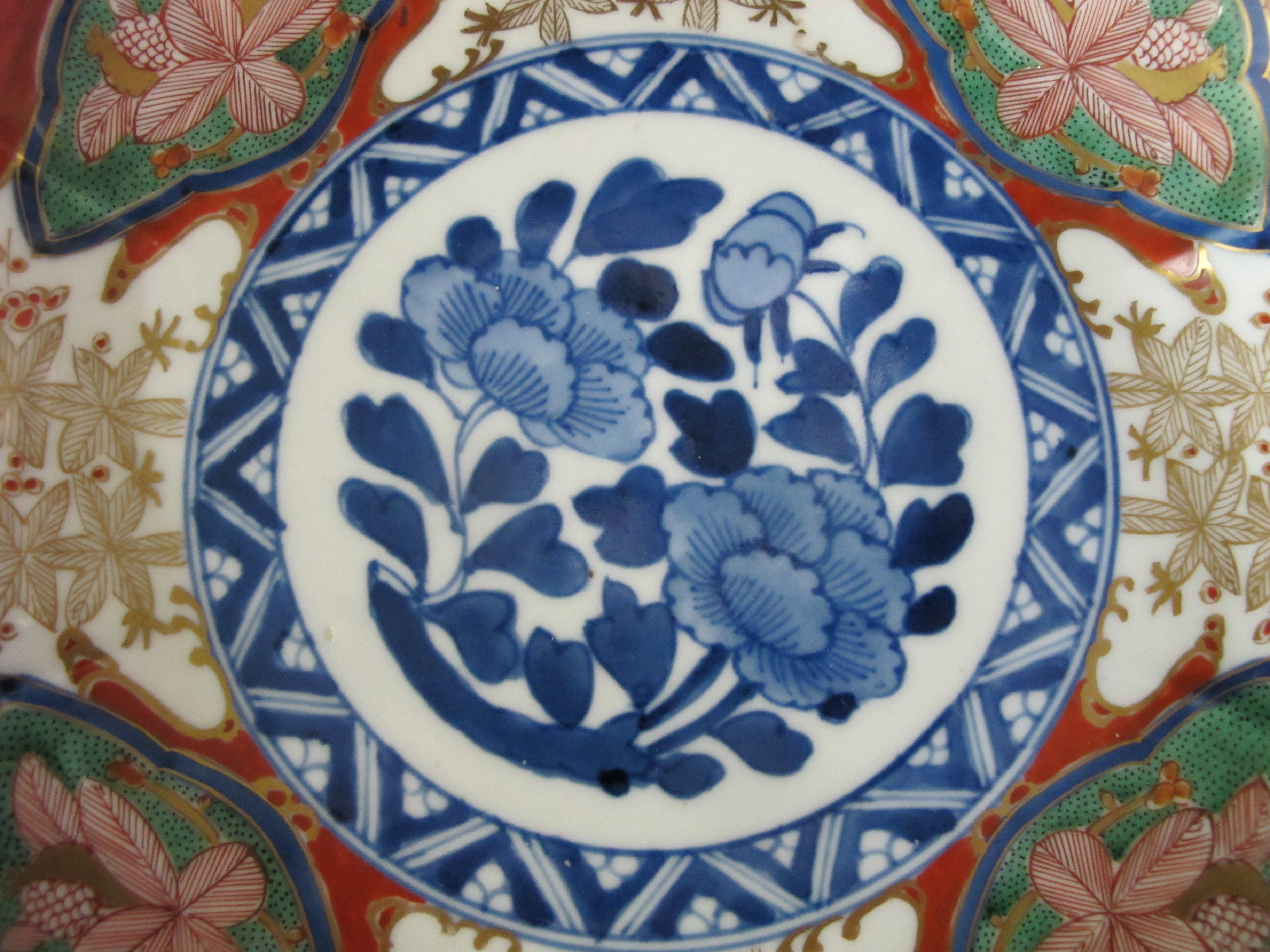 Japanese porcelain Imari plate set. Flower design in red, green, and blue with gold accents. Each measures 9.5" x 1.5" tall. Excellent condition, no chips, cracks, or repairs.