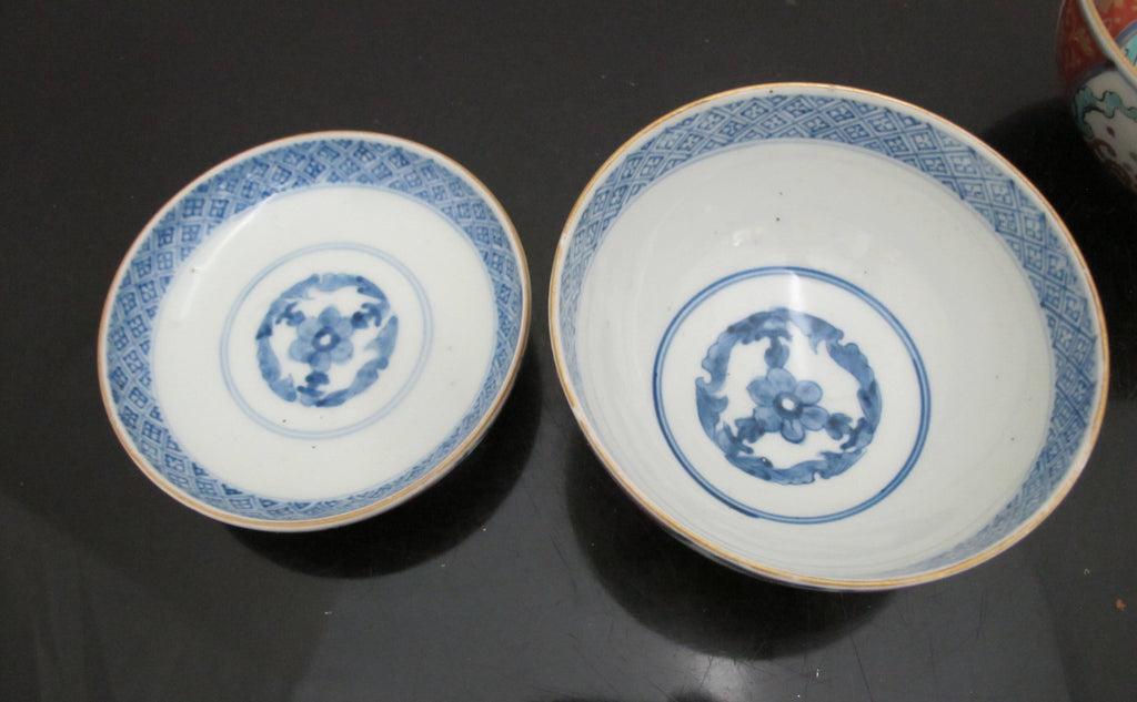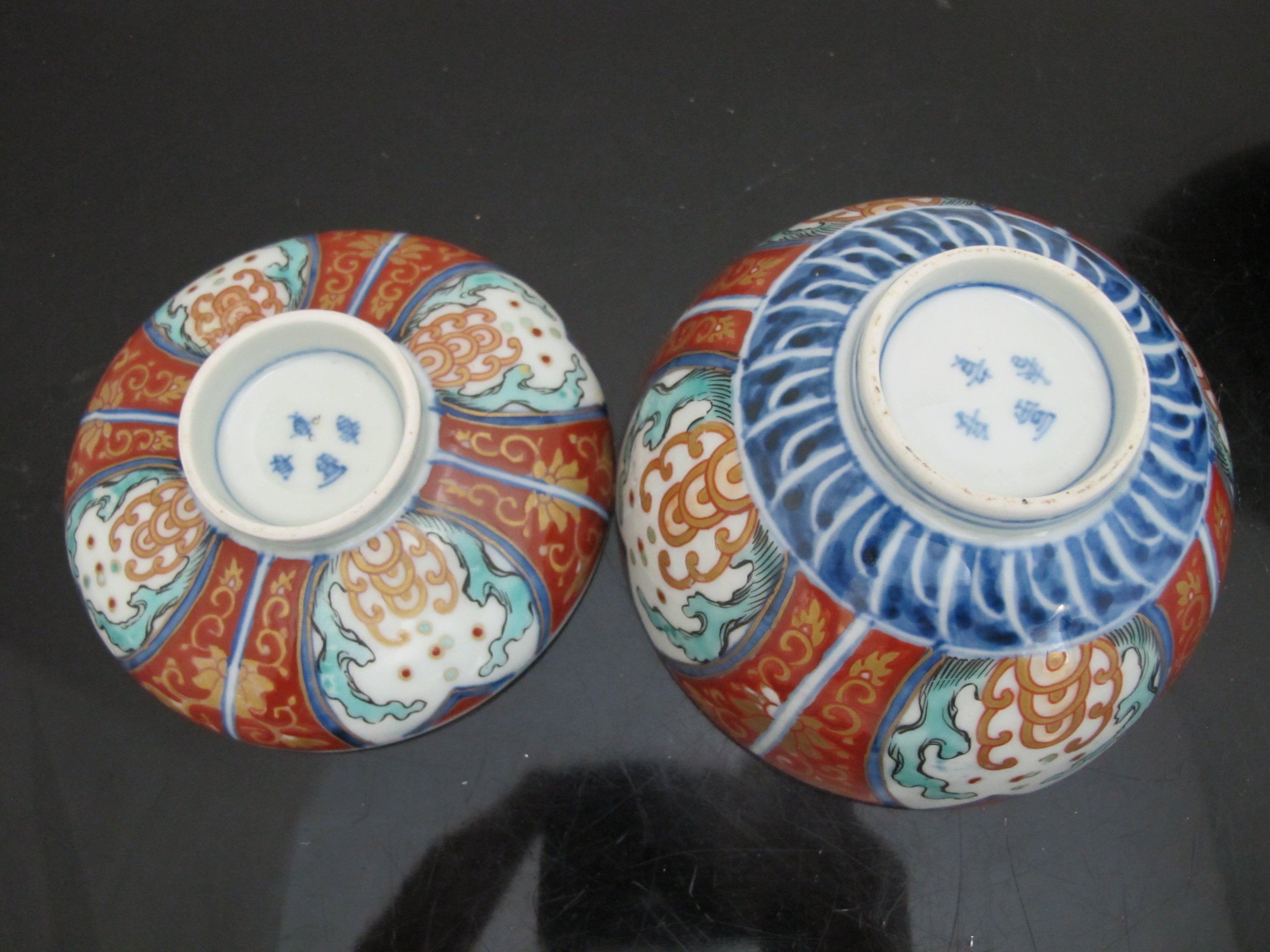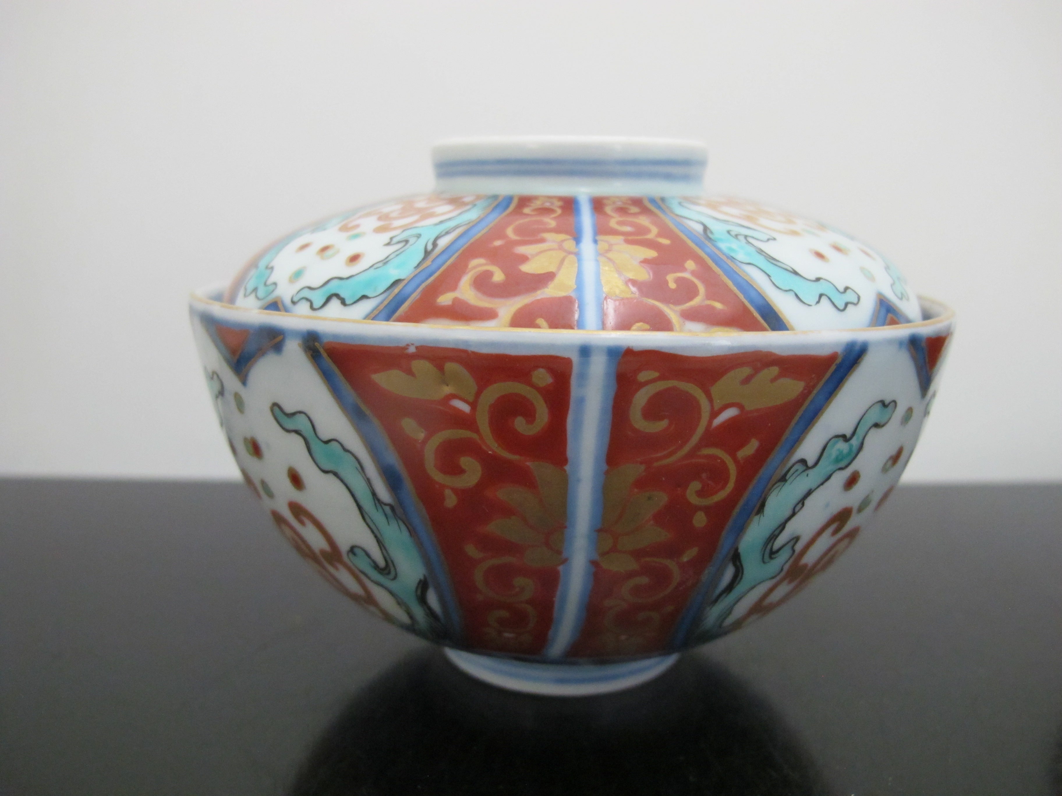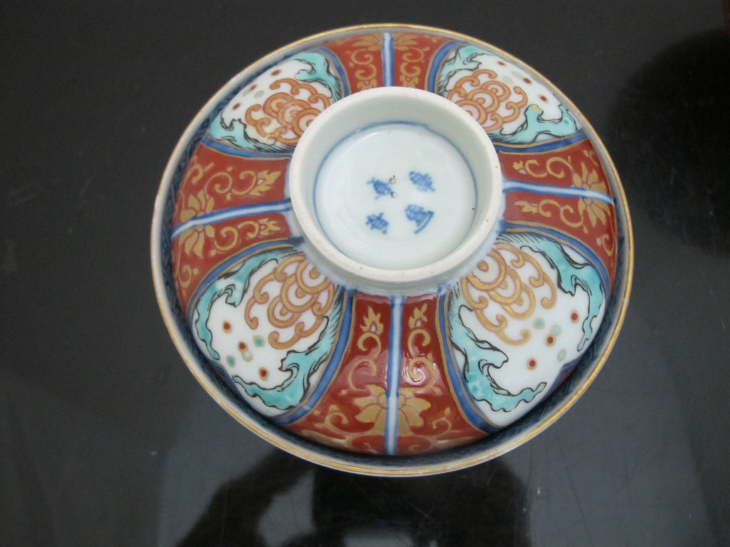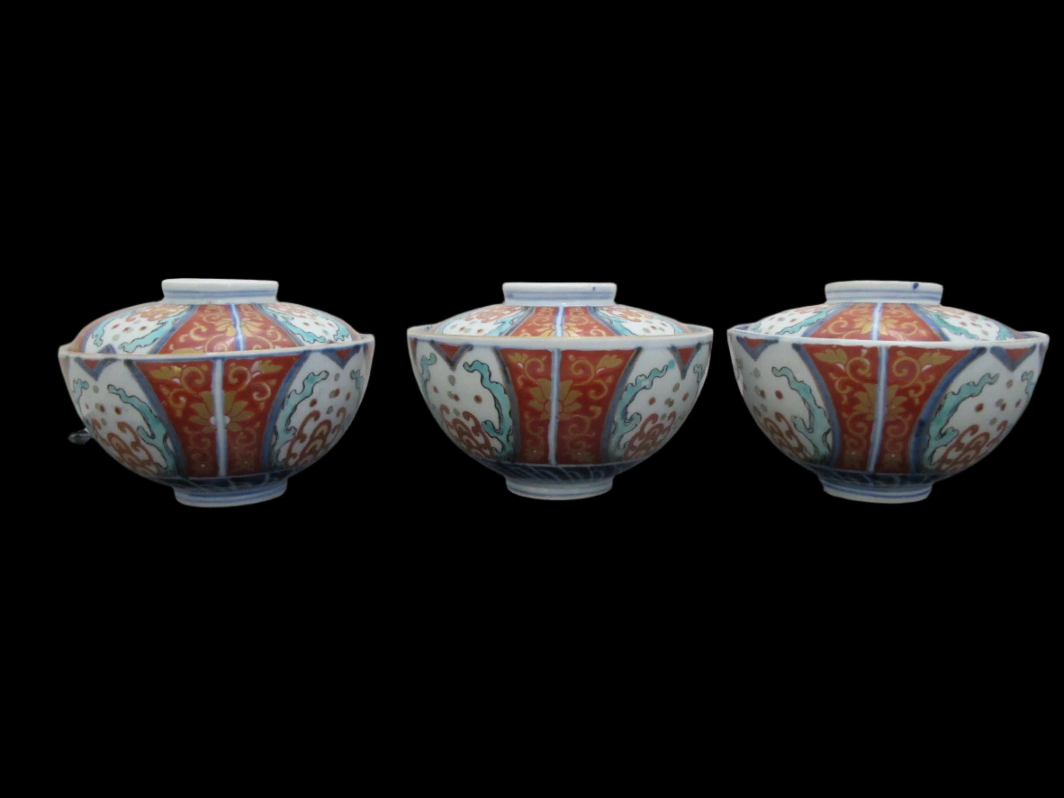 JAPANESE Old IMARI Ornate Red Porcelain Arabesque TEA Soup Bowl Cup with Lid Set of 3