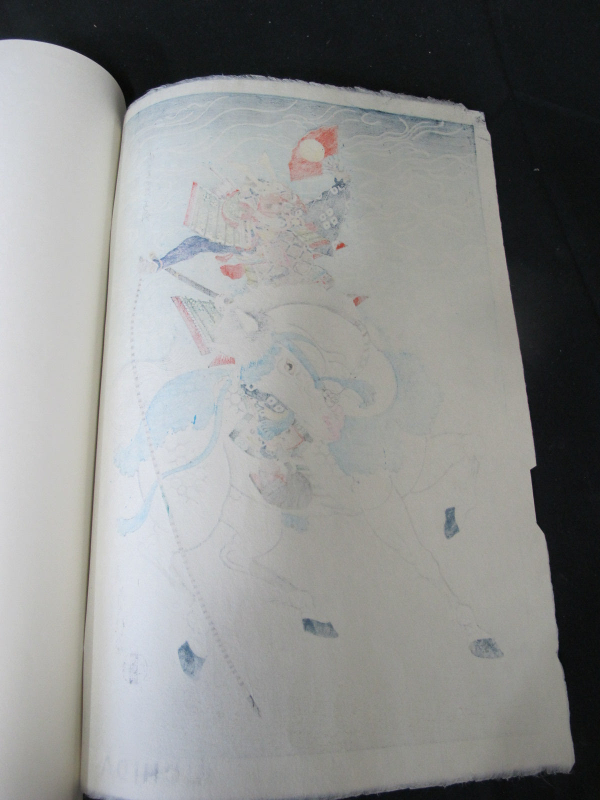 Antique Japanese woodblock print Sadanobu Hasegawa III (1881 -1963) titled Warrior Sasaki Takatsuna on a White Horse.