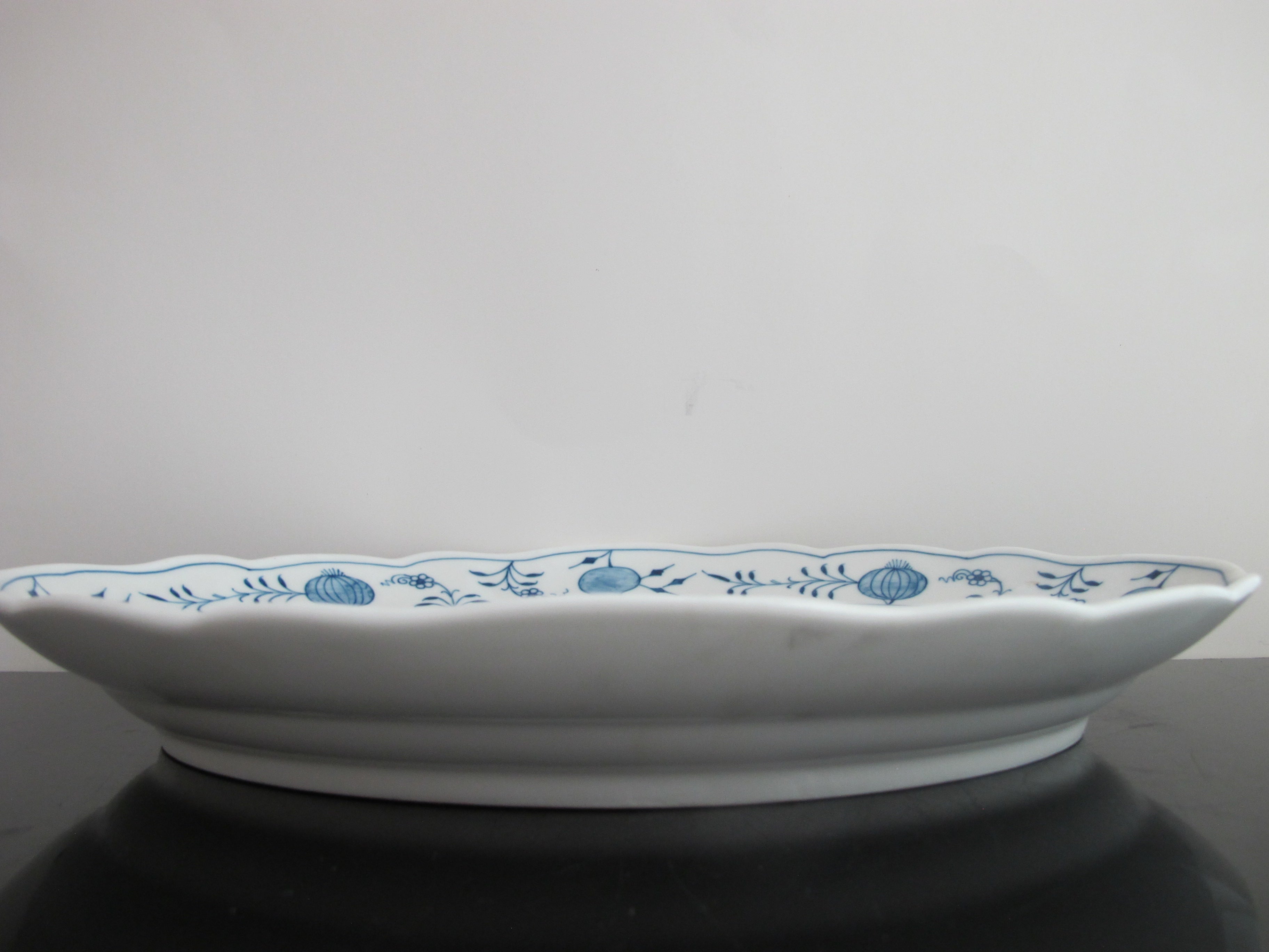 Meissen porcelain oval deep dish tray with scalloped rim in classic Blue Onion (Zweibelmuster) pattern.