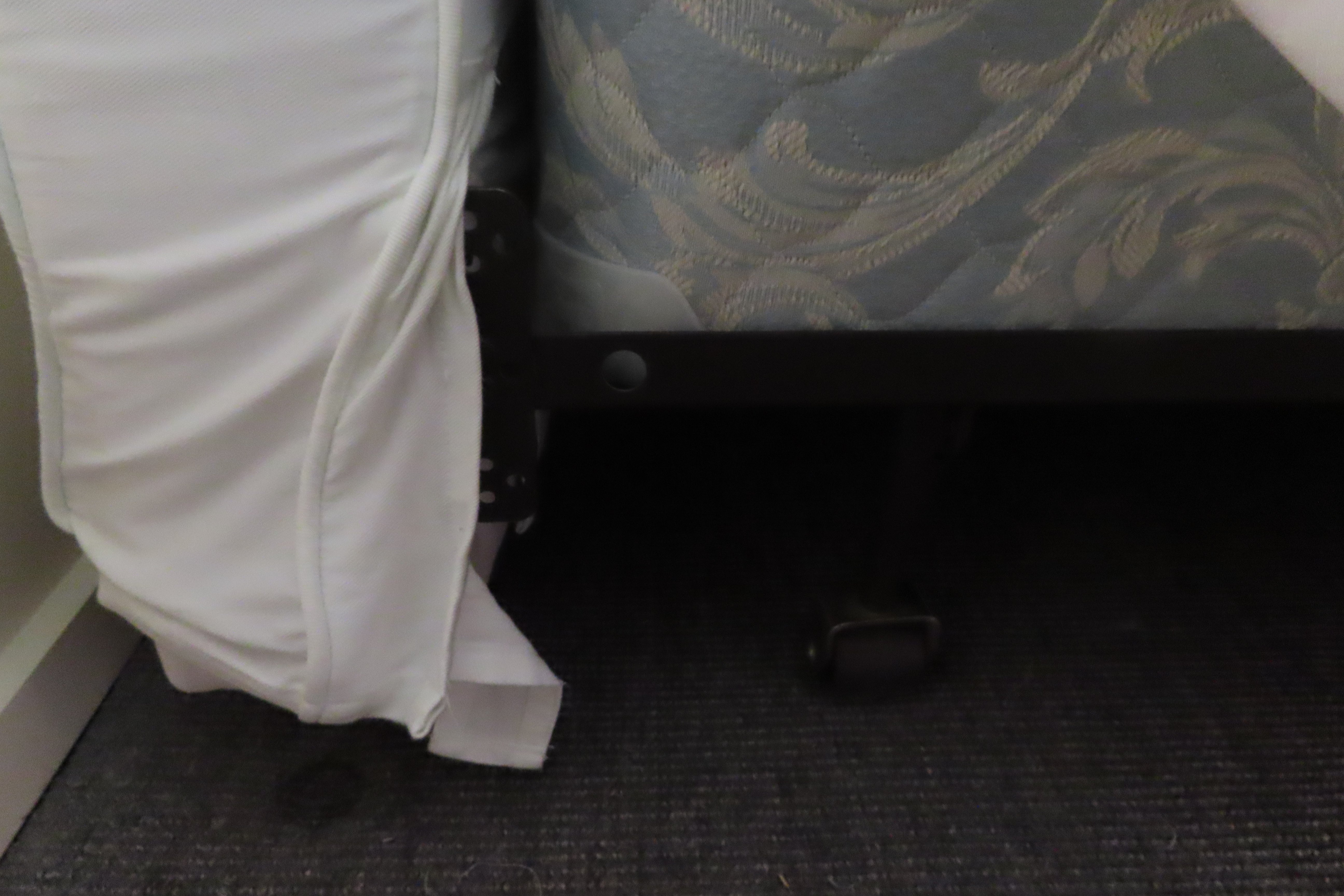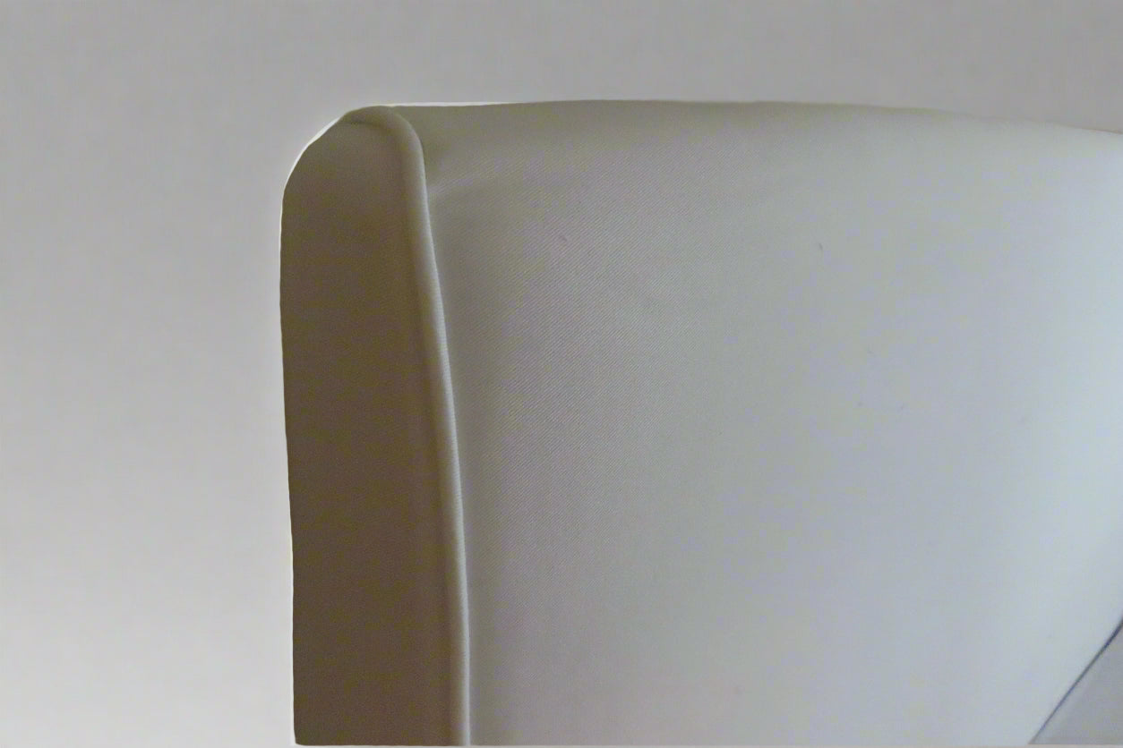 This custom made queen size headboard is bright and light, it would make any room you put it in feel softer immediately. The head board comes with a semi-matching shell patterned bed skirt. Metal bed frame is not included in the purchase.