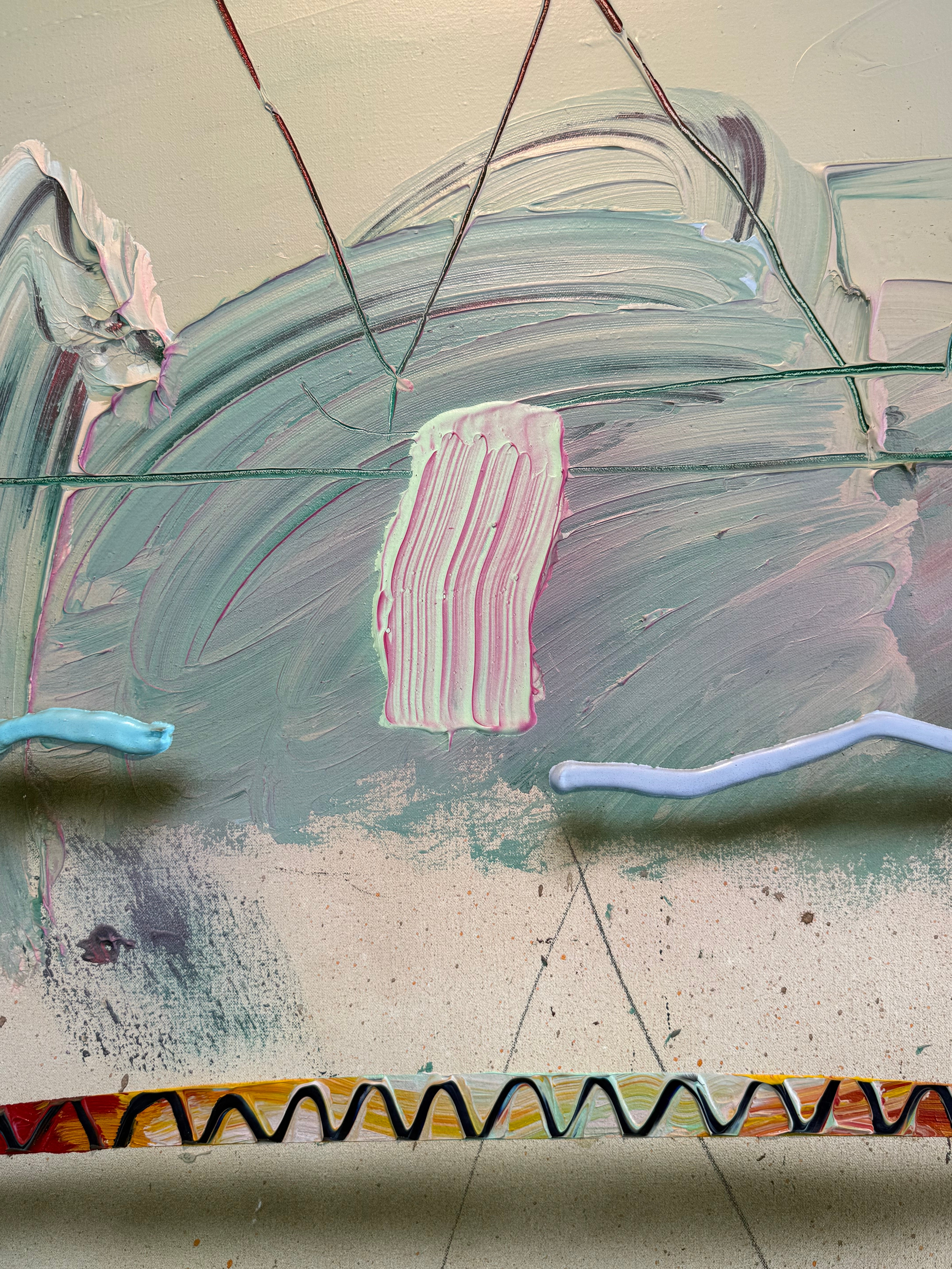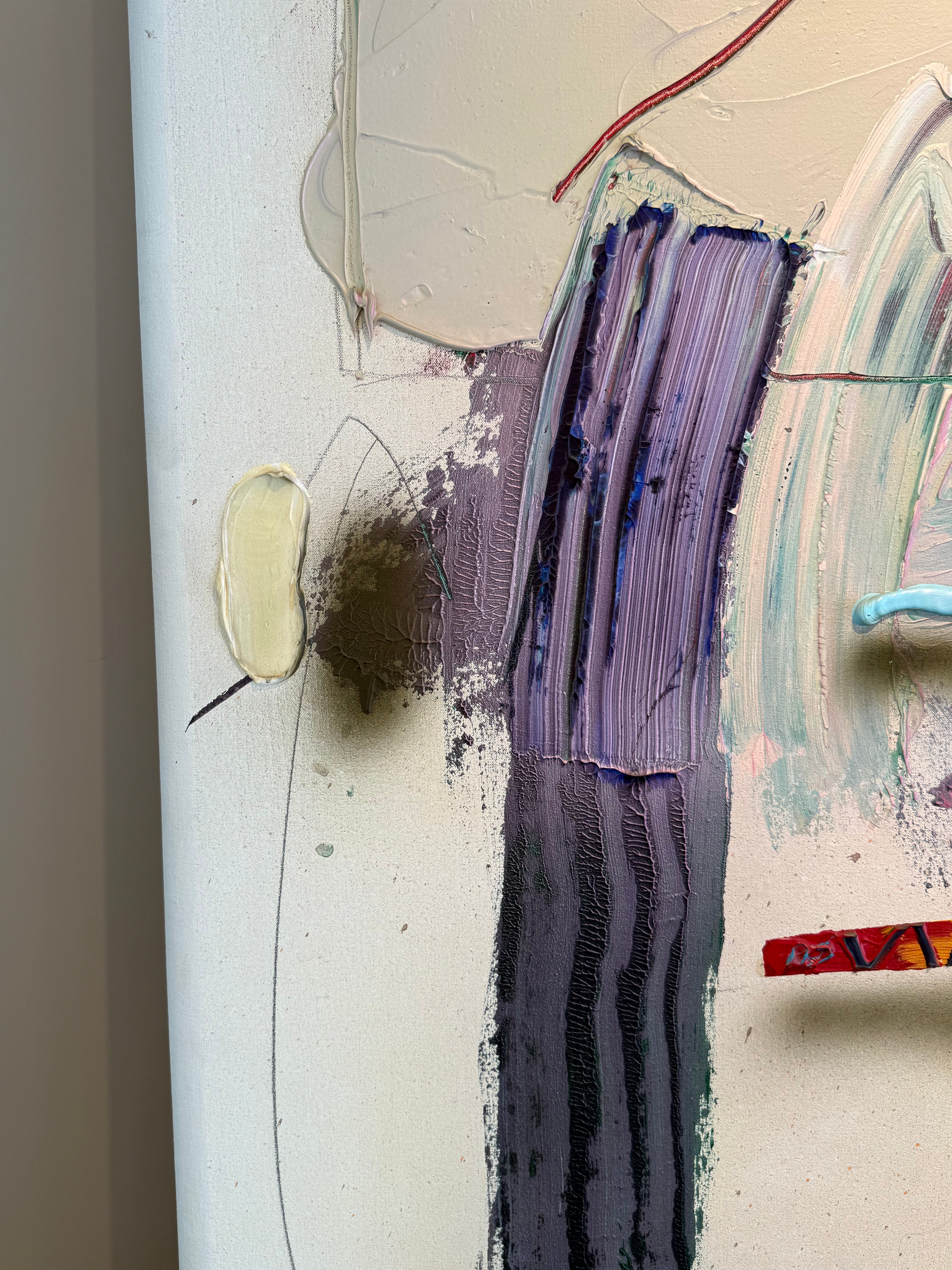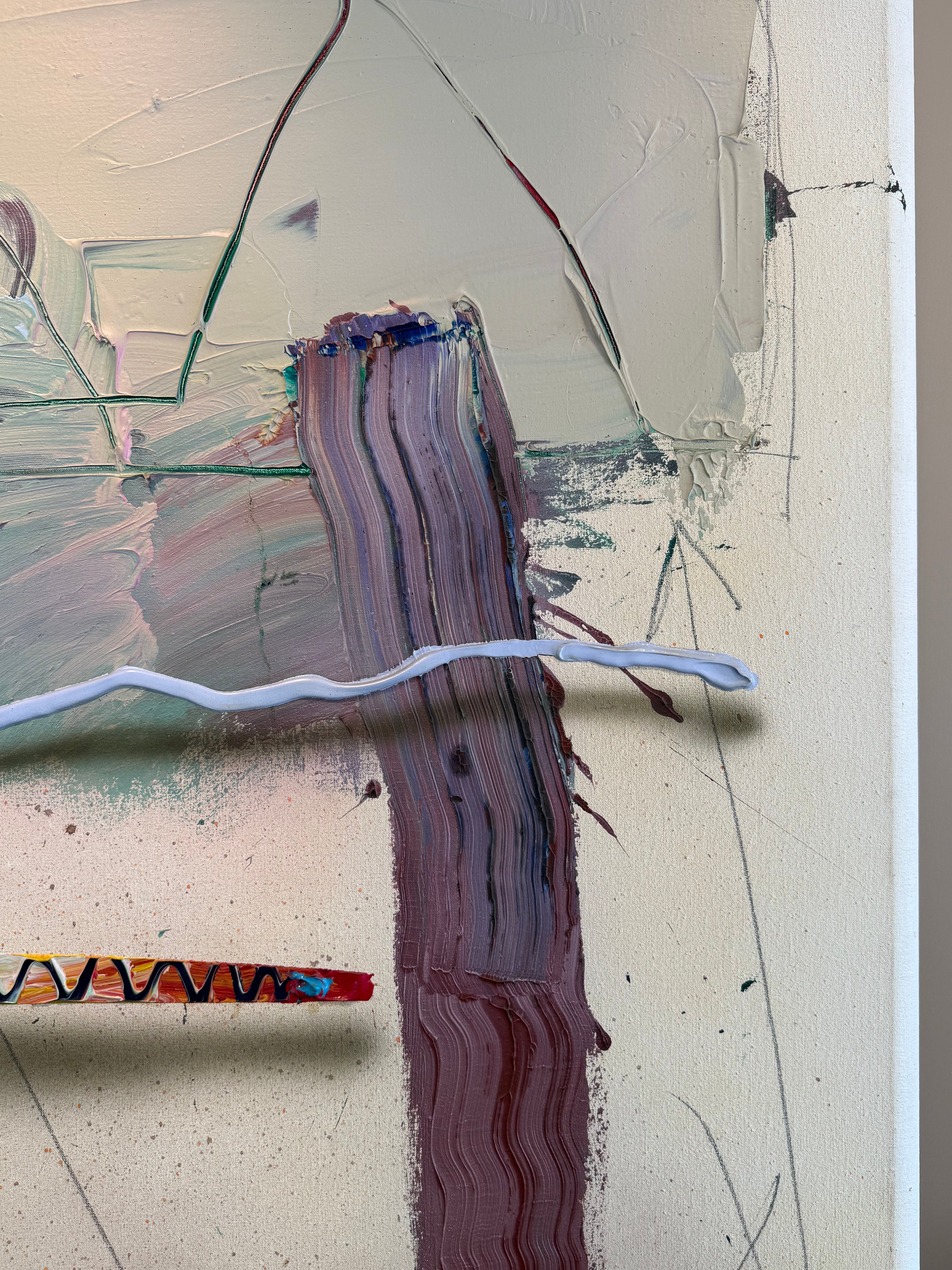 This painting uses bright and striking thick layers of paint against cream backgrounds. Havard then scratches through some of these forms to create texture and depth on an otherwise 2D surface. He also uses spray paint to create shadows that bring the forms off the canvas even more, some even appear to be floating inches away.