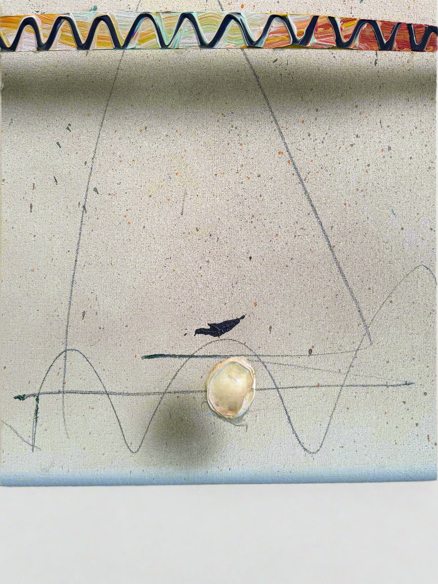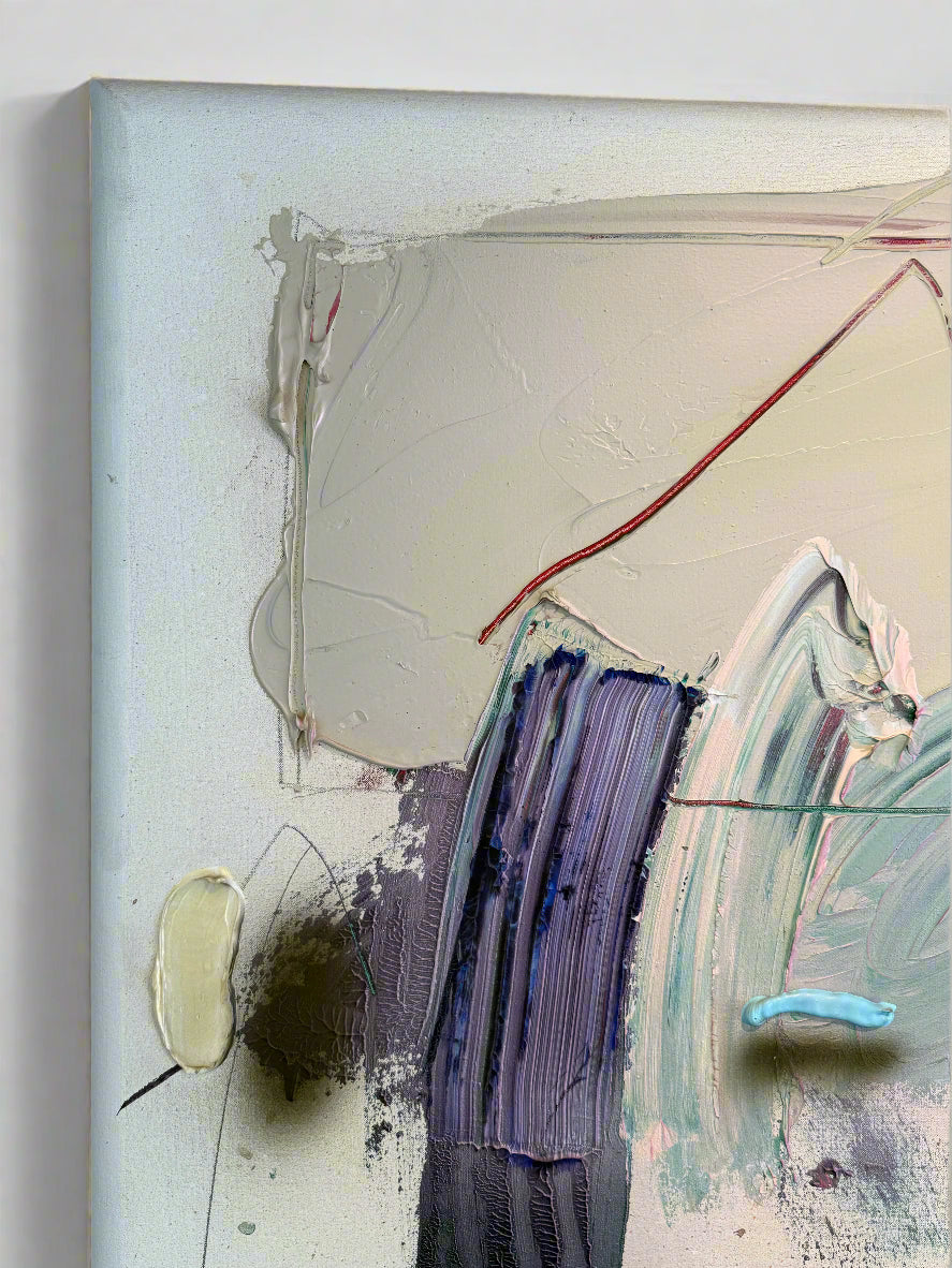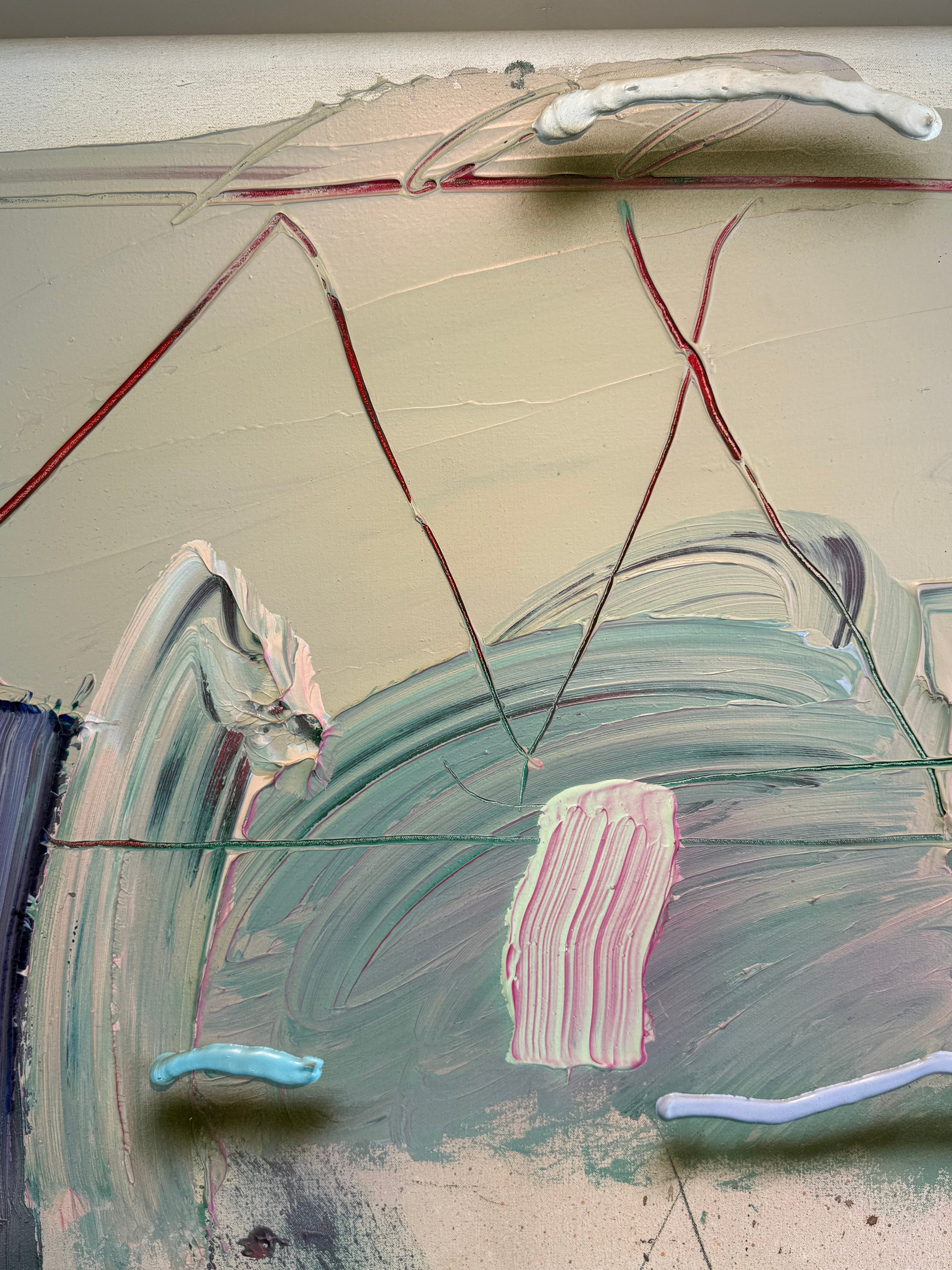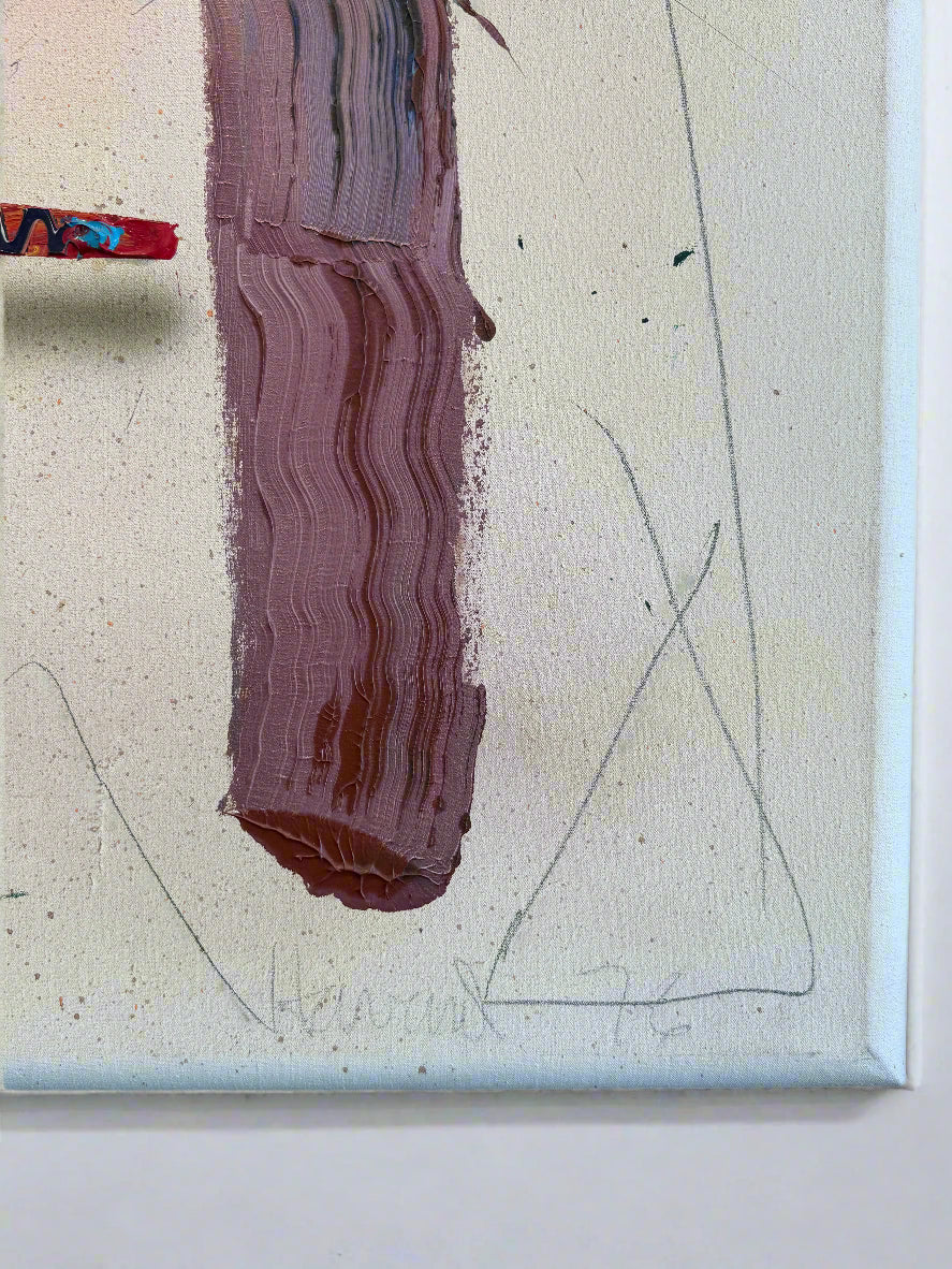 This painting uses bright and striking thick layers of paint against cream backgrounds. Havard then scratches through some of these forms to create texture and depth on an otherwise 2D surface. He also uses spray paint to create shadows that bring the forms off the canvas even more, some even appear to be floating inches away.