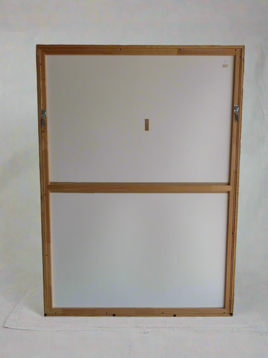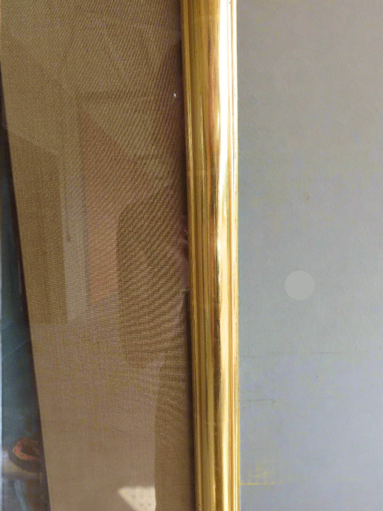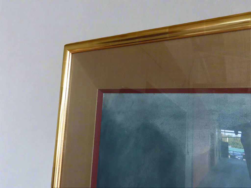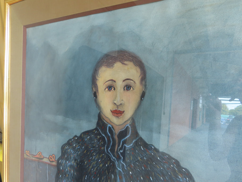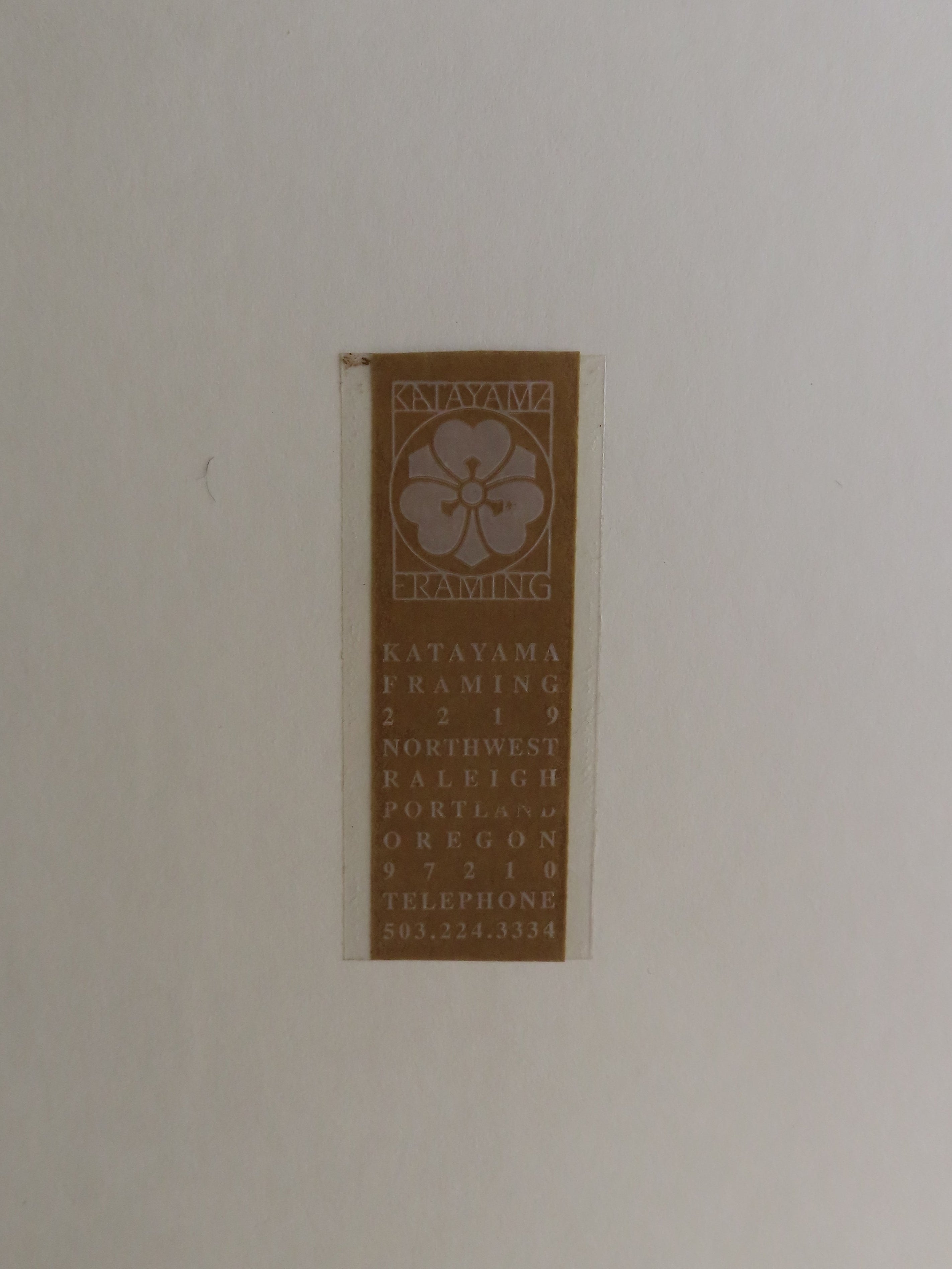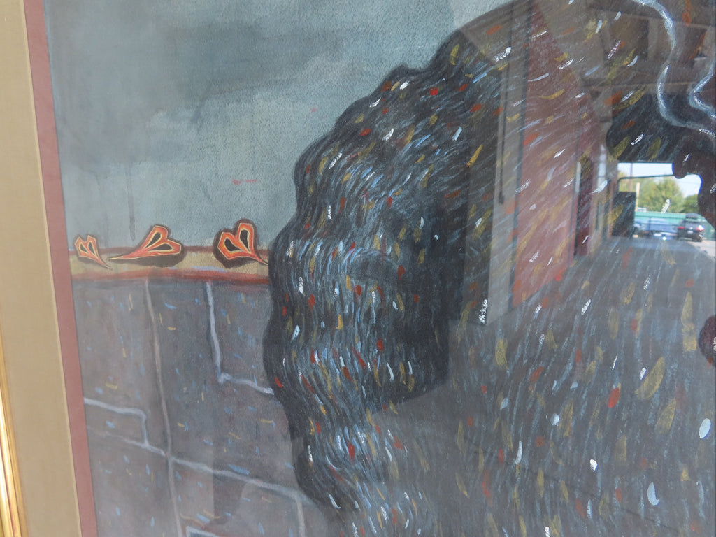 It is framed with a light brown matte, and a gold leaf frame. Watercolor and oil pastel on paper.