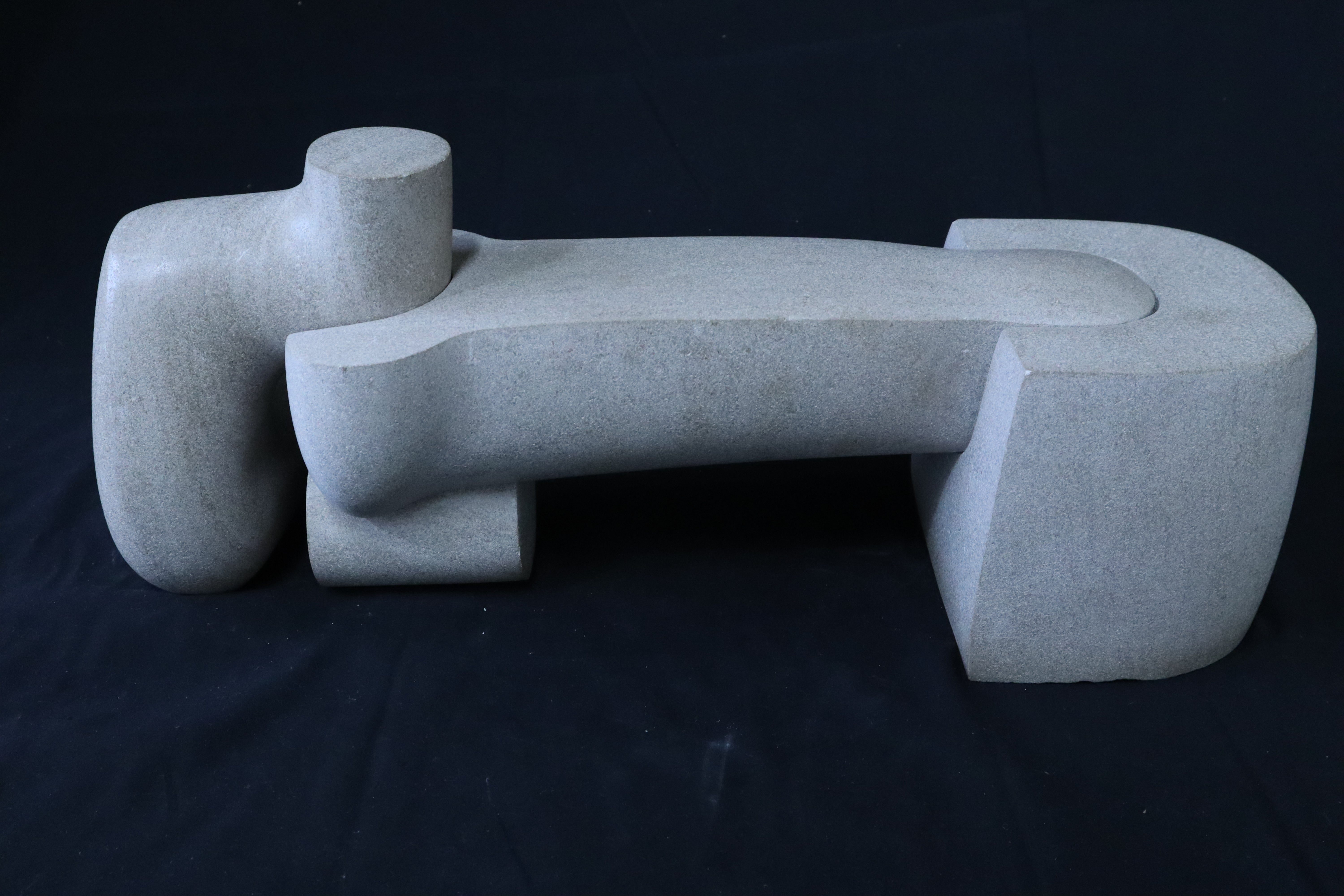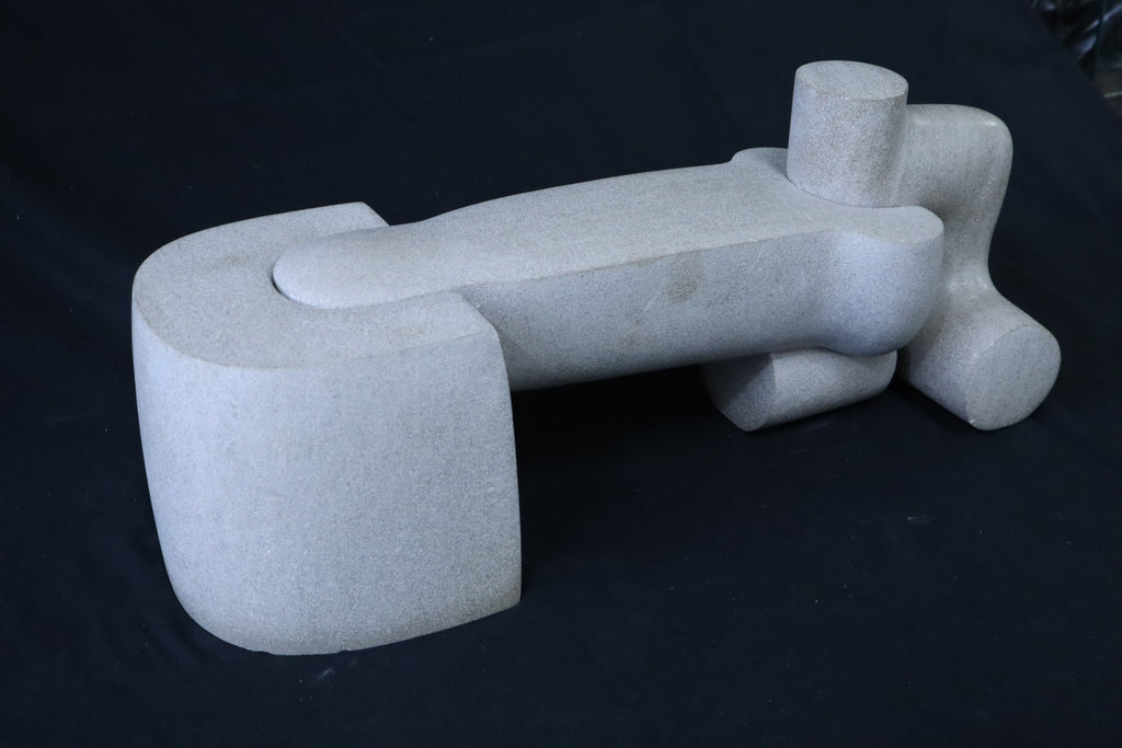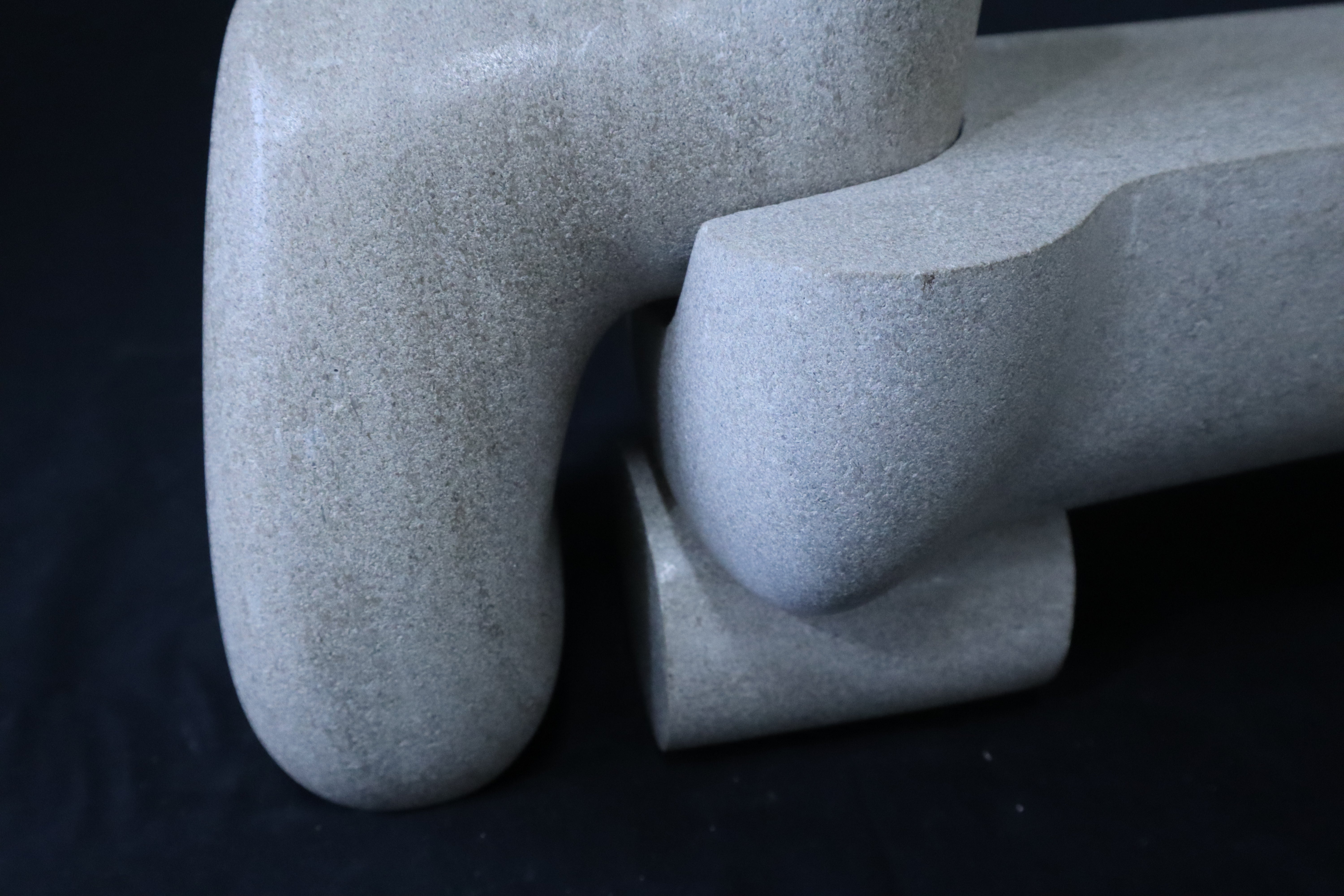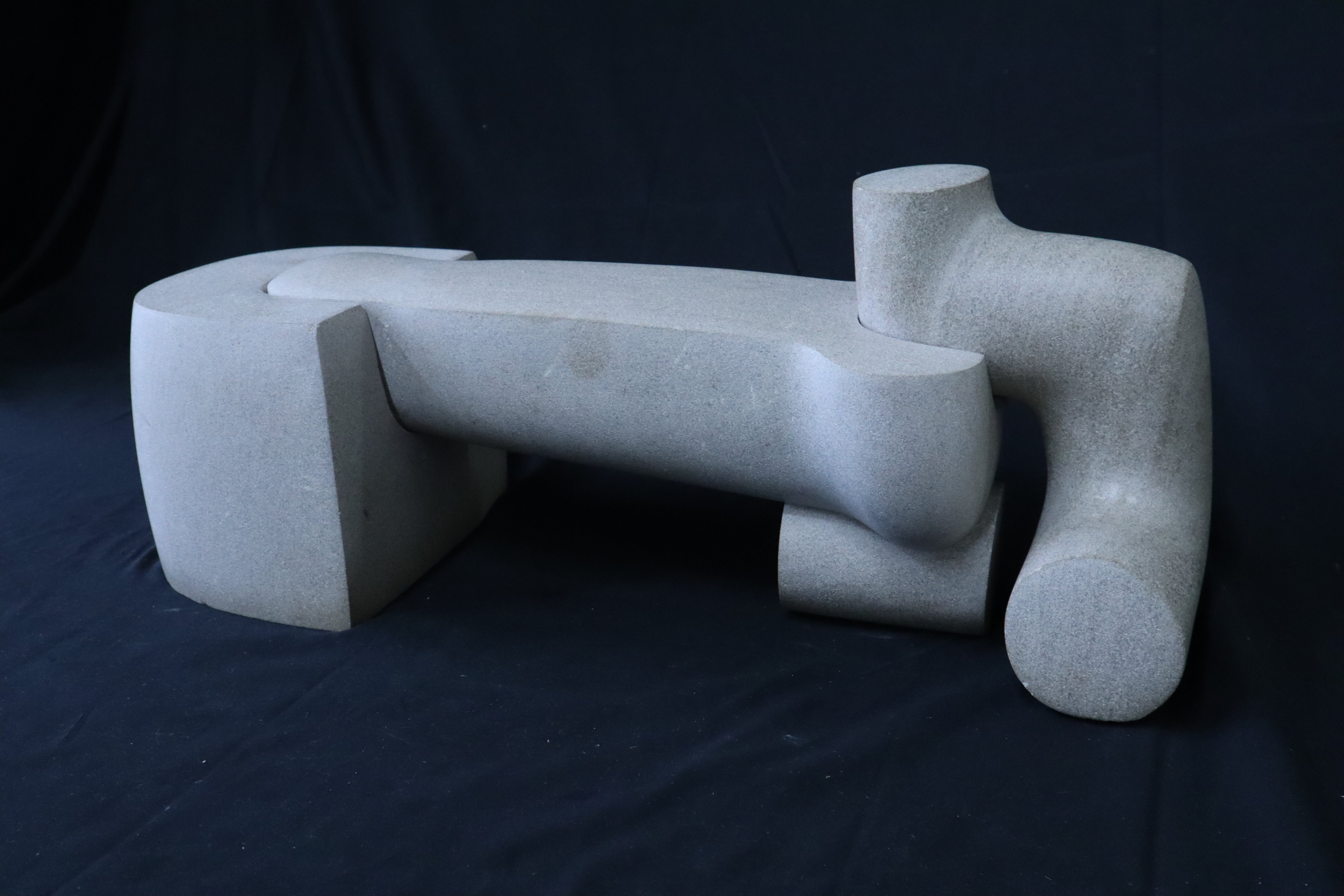 Don Wilson (1934-2008) an Oregon Artist with works that have been on display at the Portland Art Museum. This sculpture has four interlocking pieces that balance with each other to make an abstract horizontal shape. Made from soft hand carved light gray soapstone.