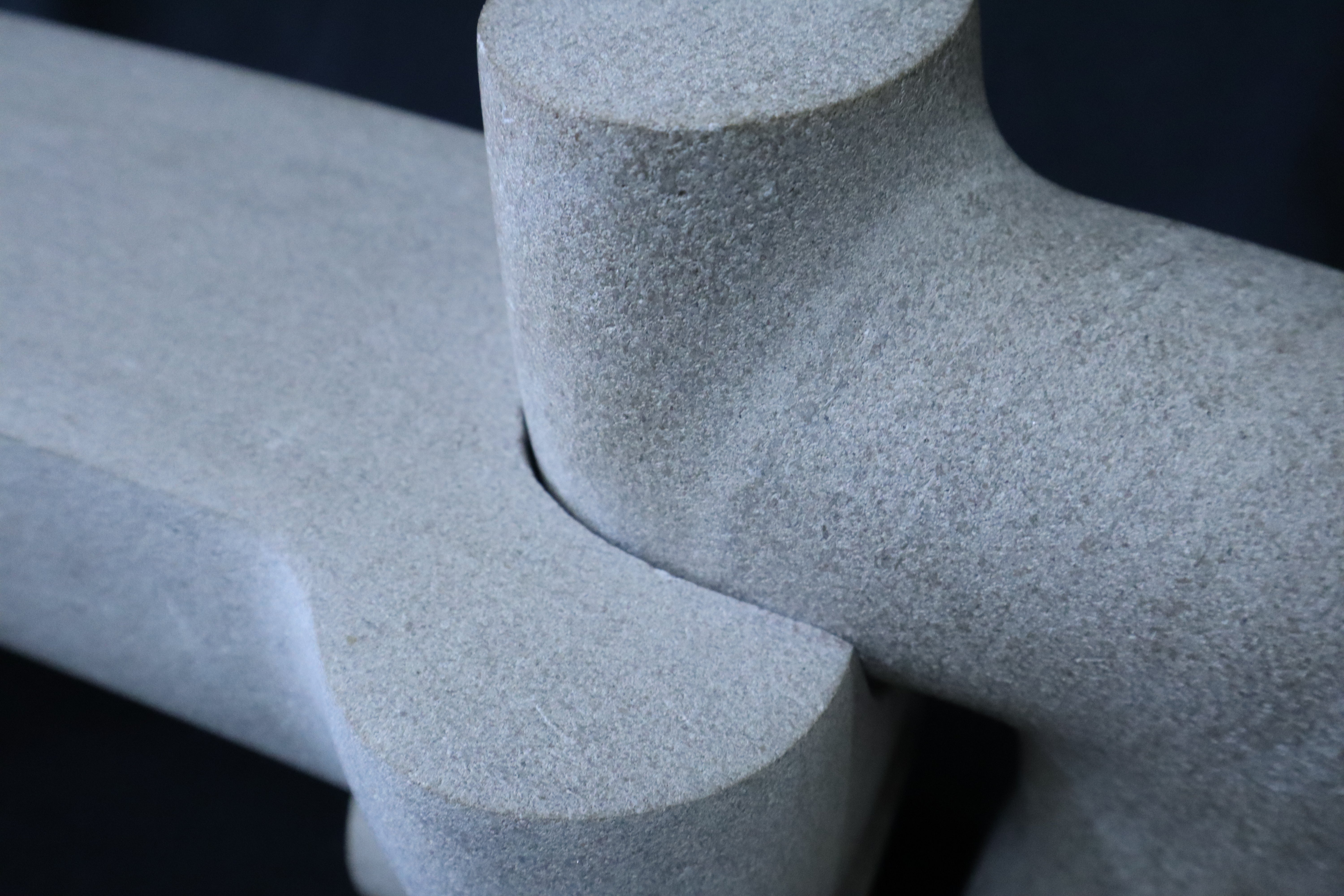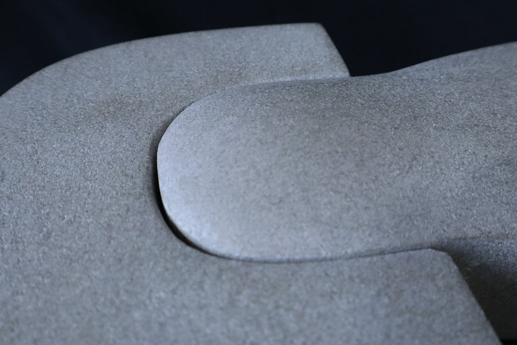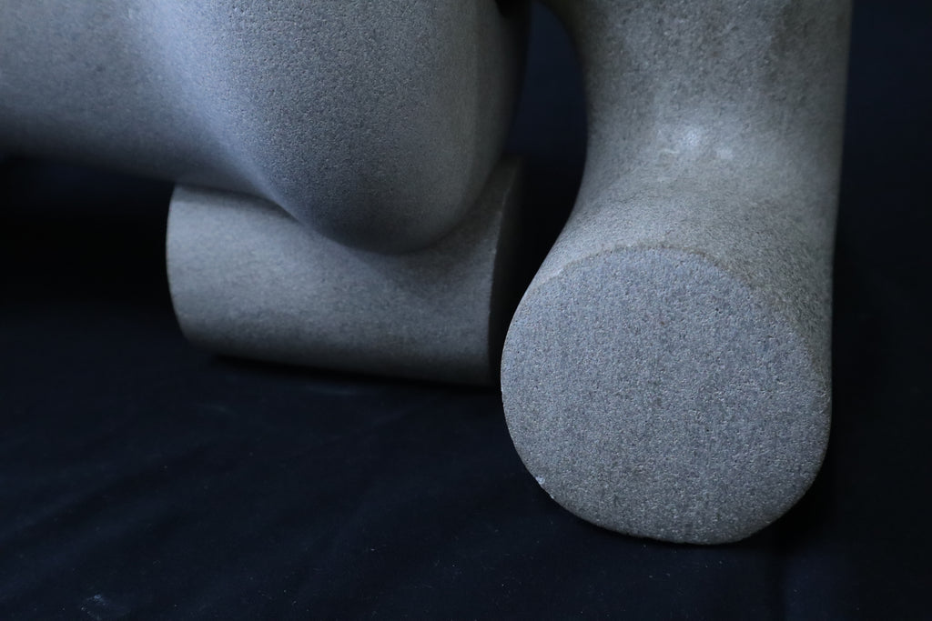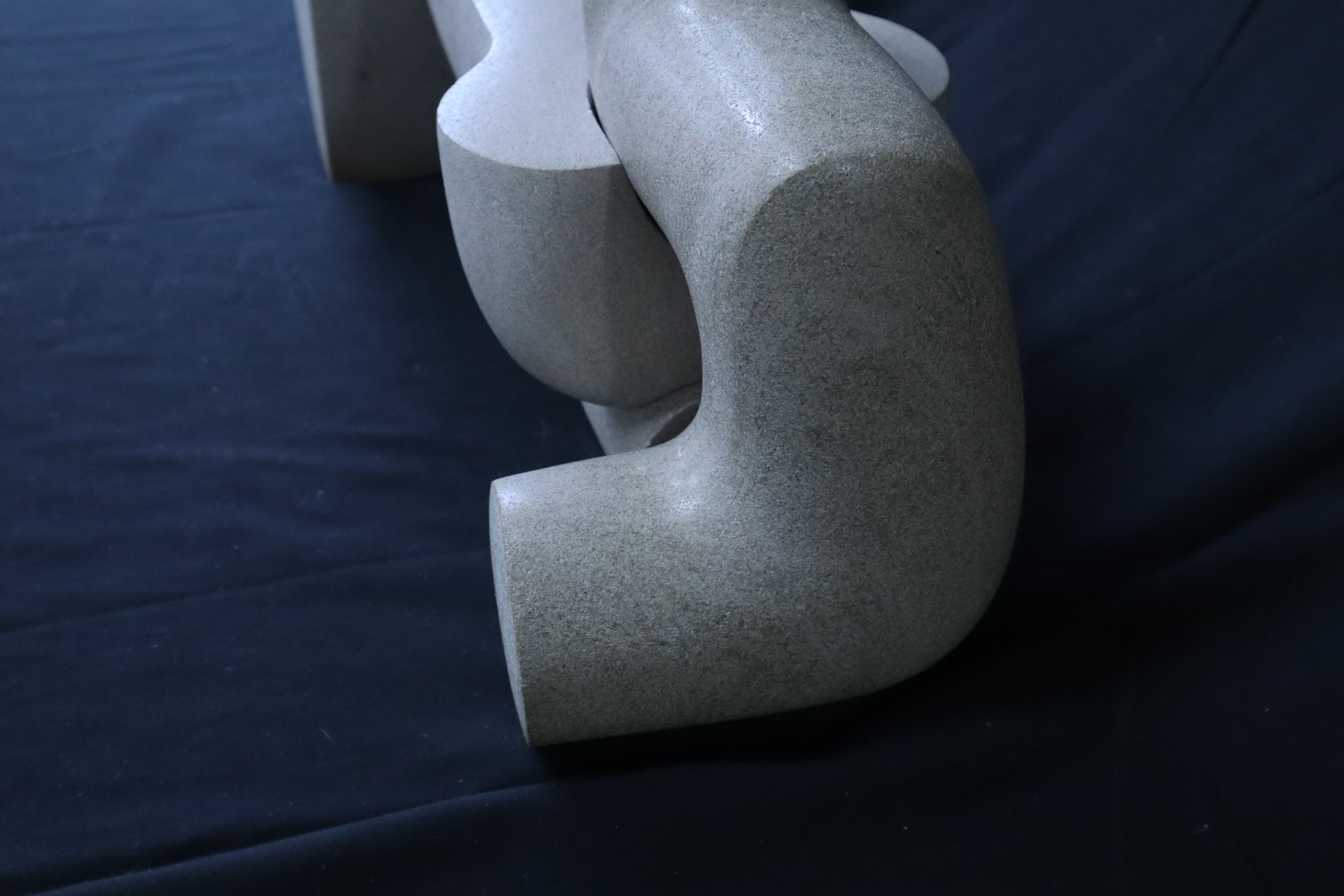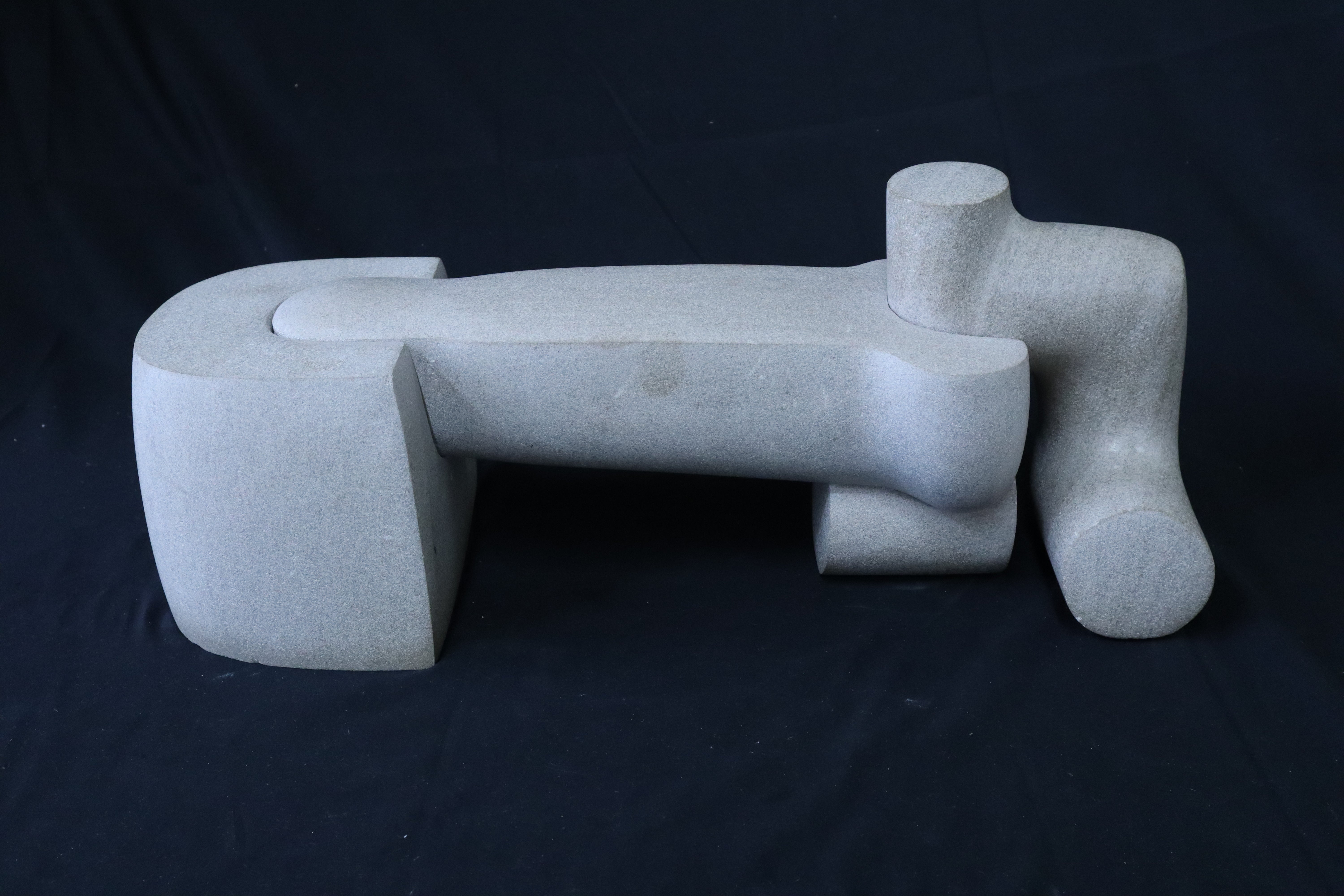 Don Wilson (1934-2008) an Oregon Artist with works that have been on display at the Portland Art Museum. This sculpture has four interlocking pieces that balance with each other to make an abstract horizontal shape. Made from soft hand carved light gray soapstone.