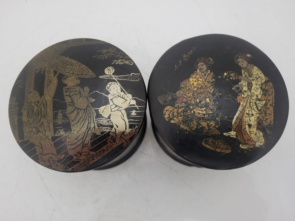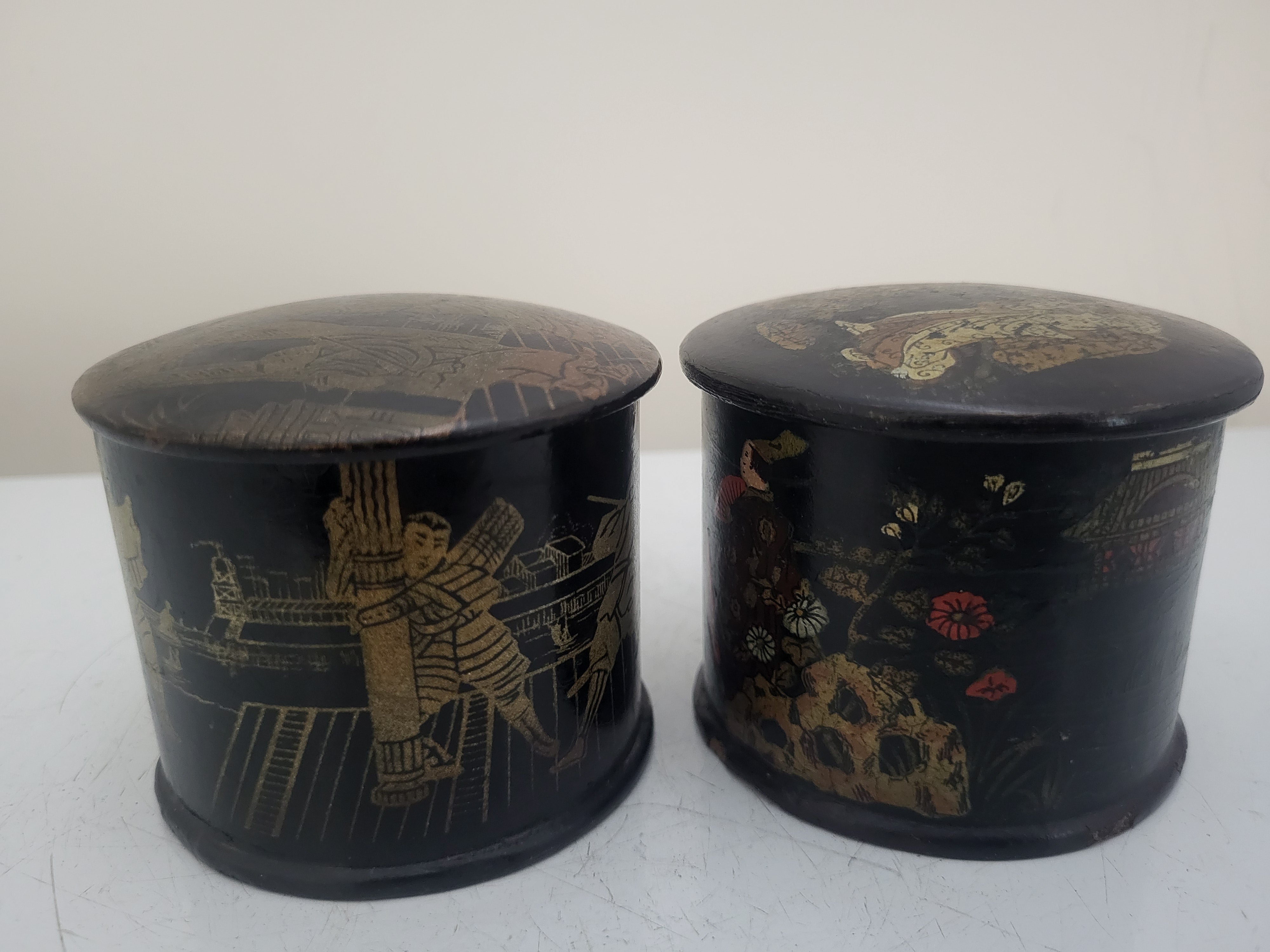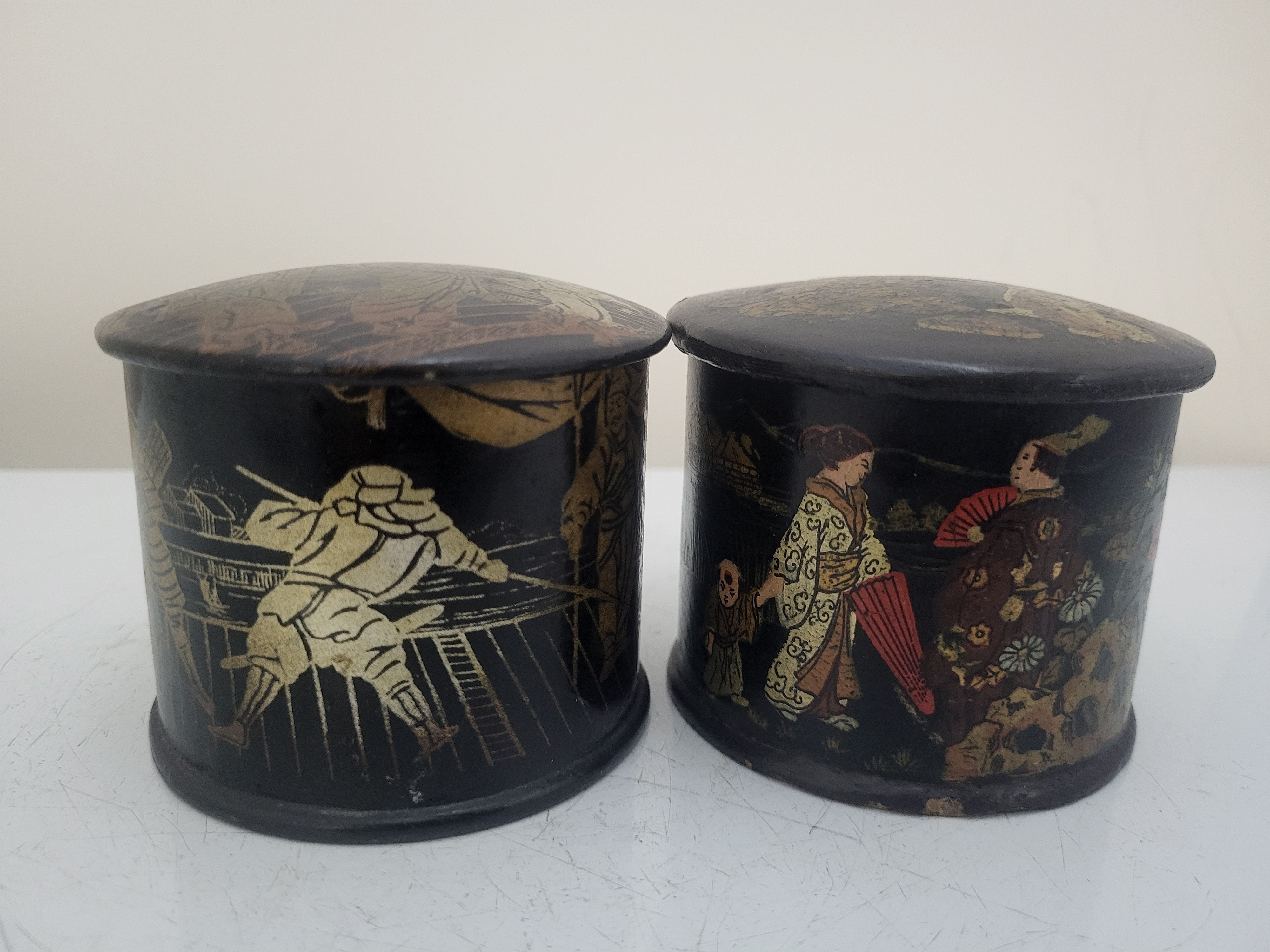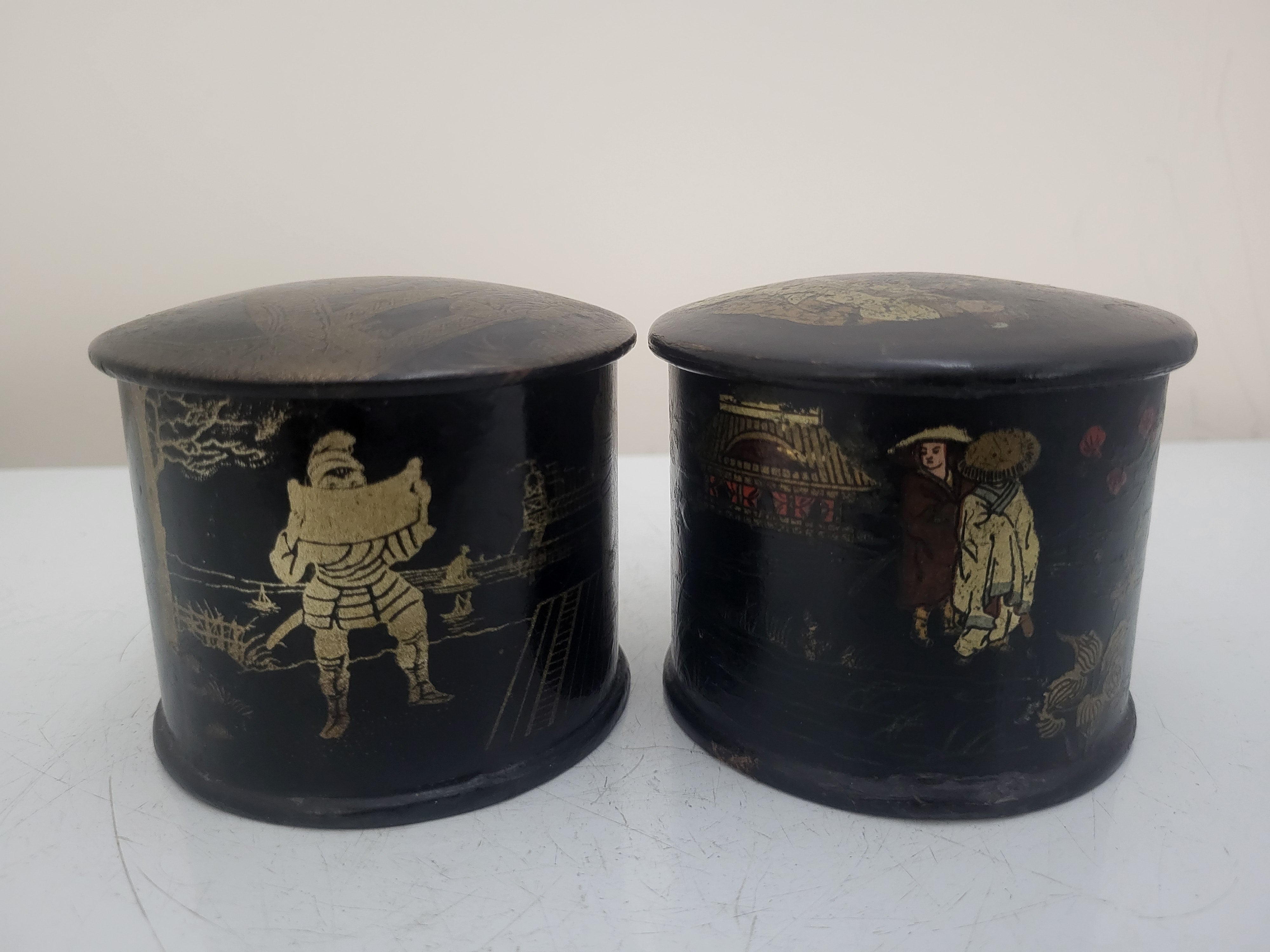 Antique JAPANESE Figural Black LACQUER Round TEA Box with Lid Pair