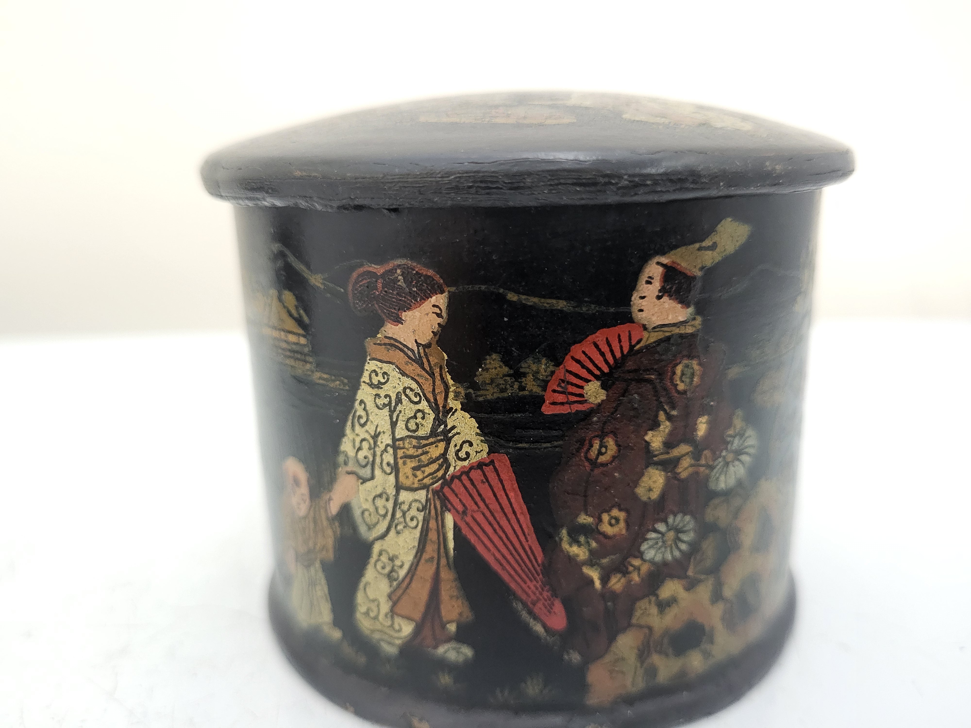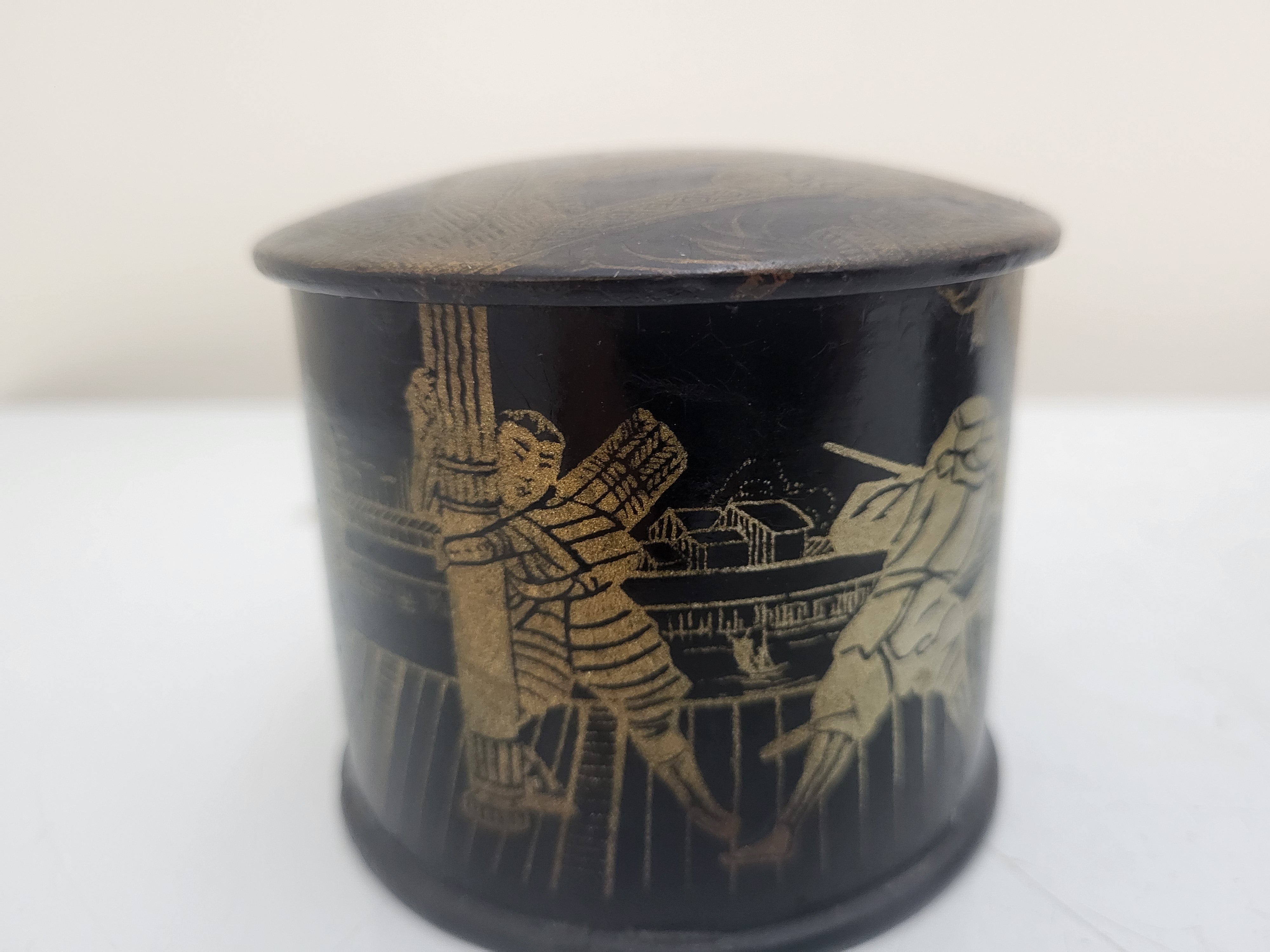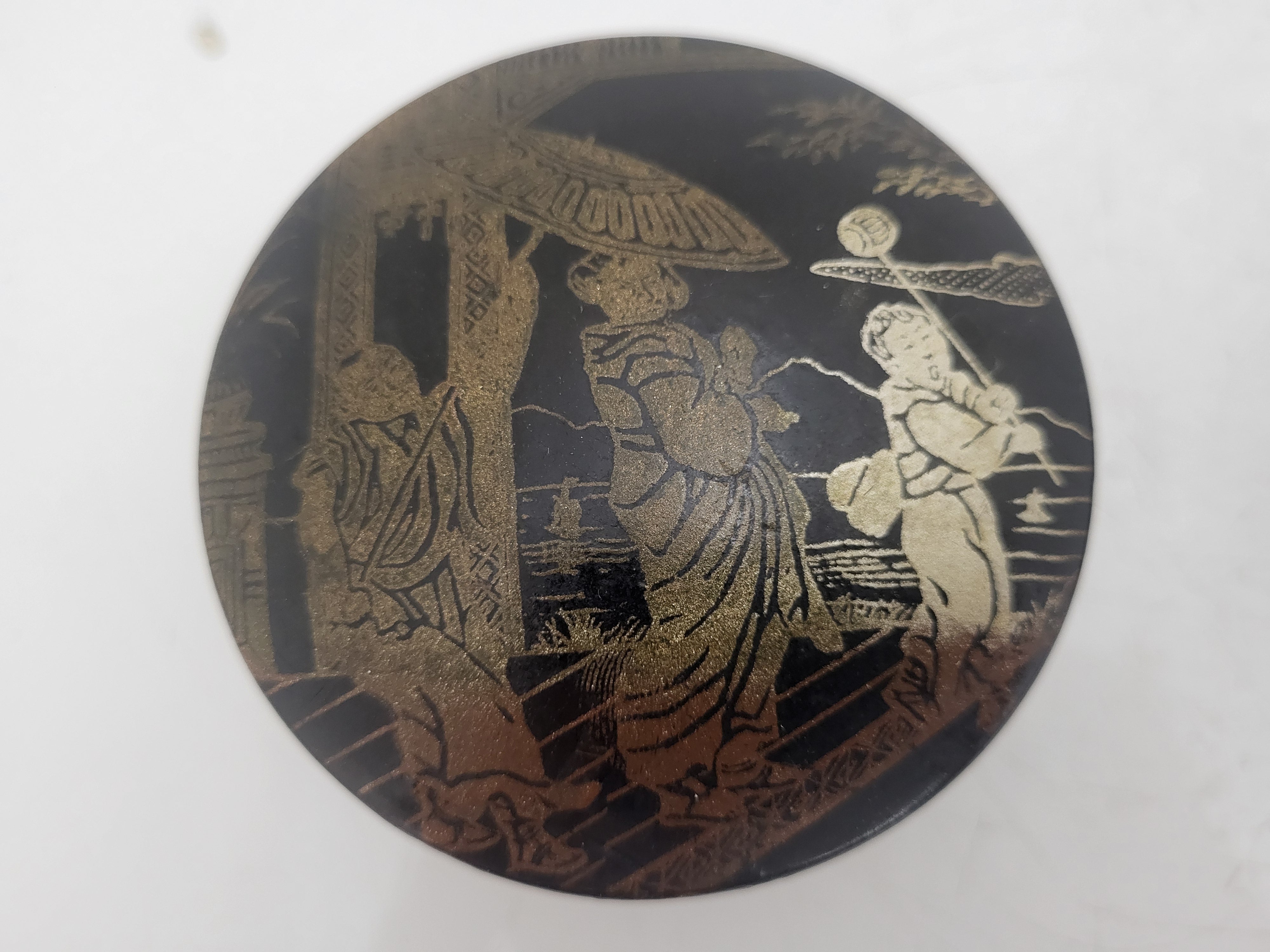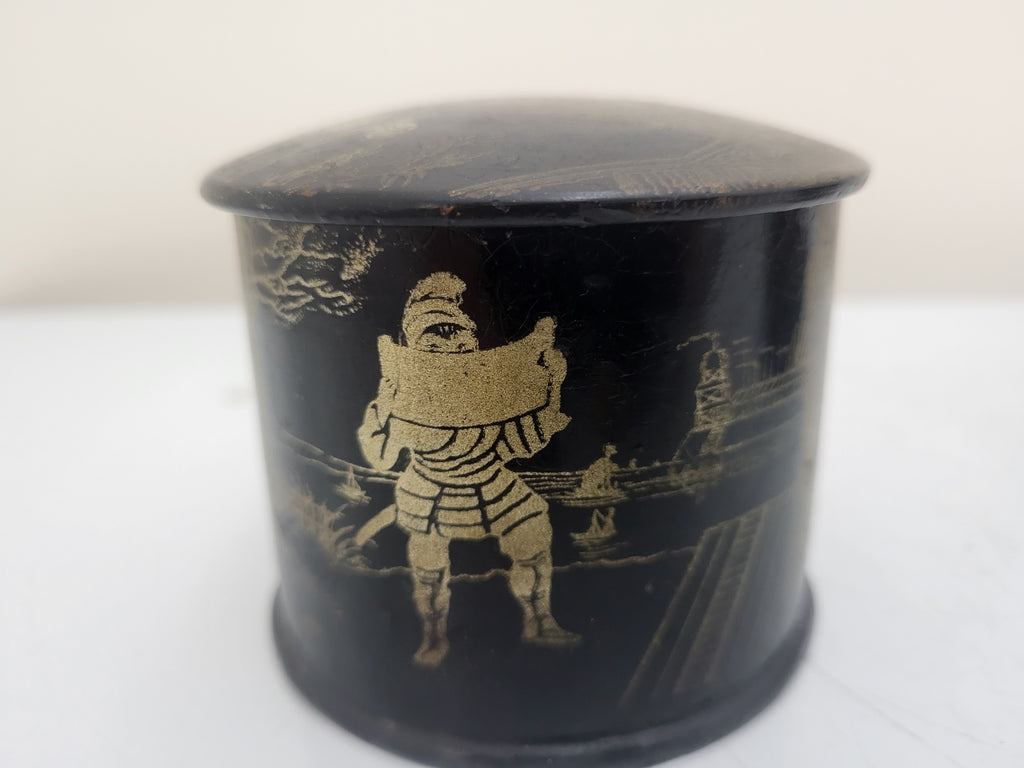 Antique JAPANESE Figural Black LACQUER Round TEA Box with Lid Pair