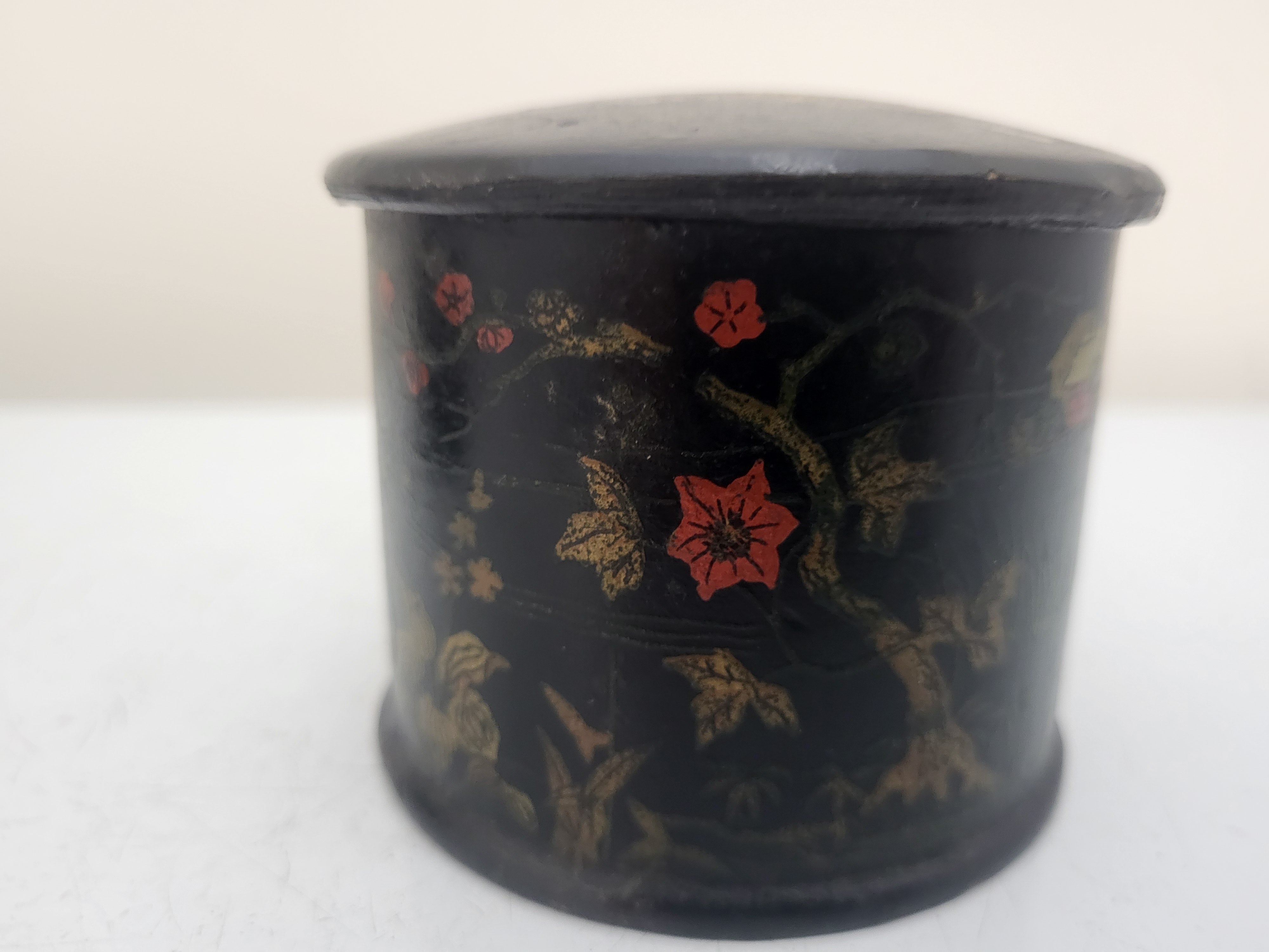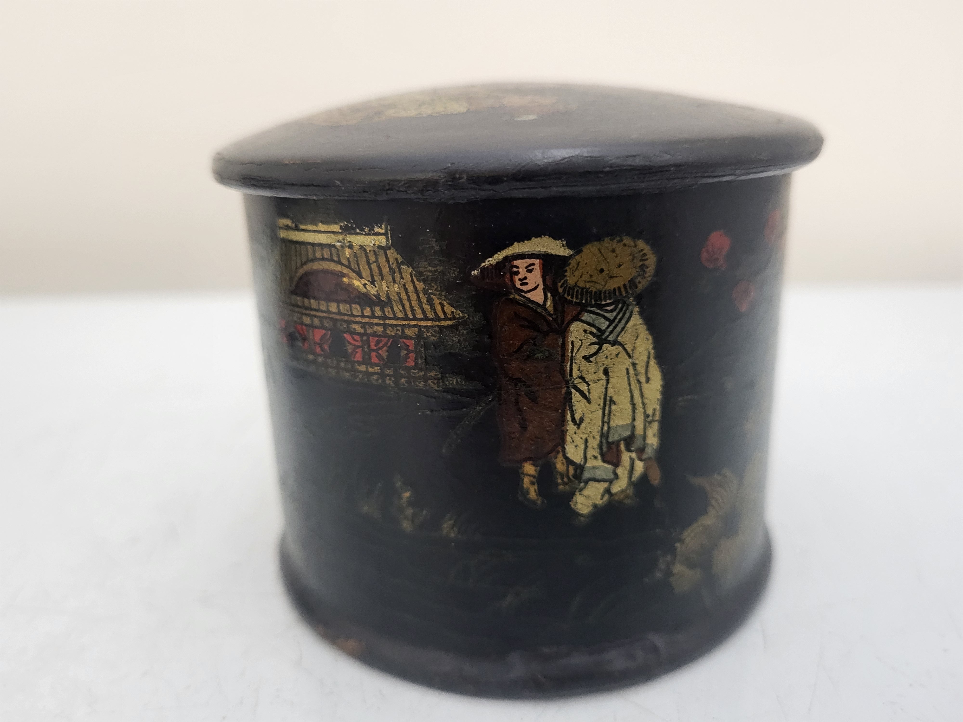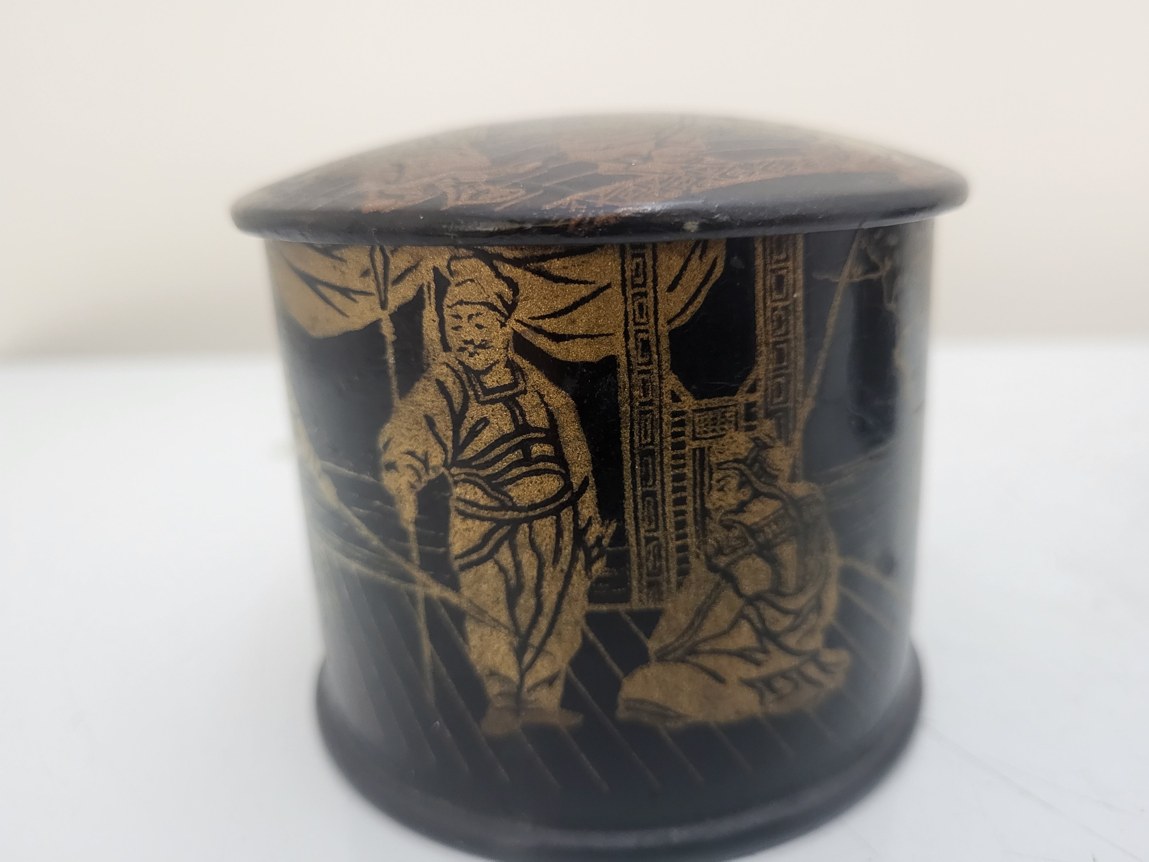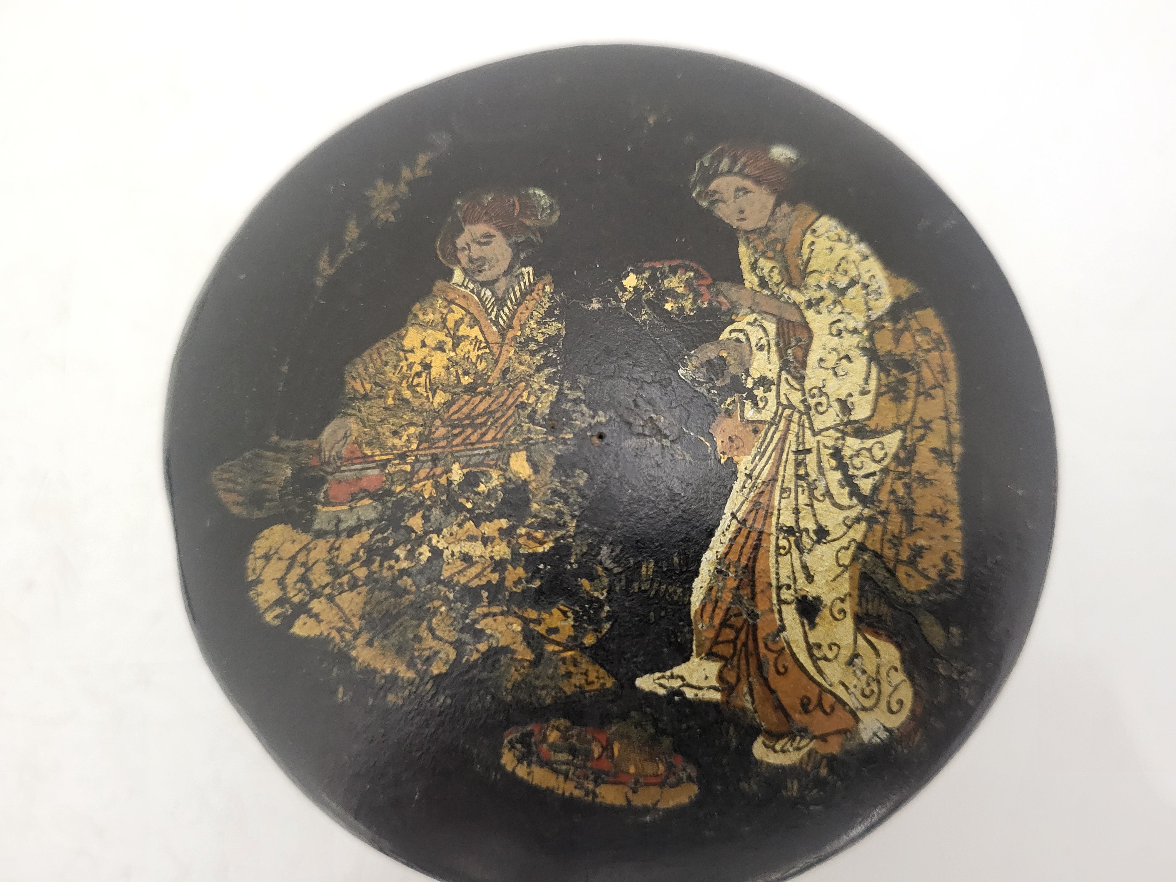 Antique JAPANESE Figural Black LACQUER Round TEA Box with Lid Pair