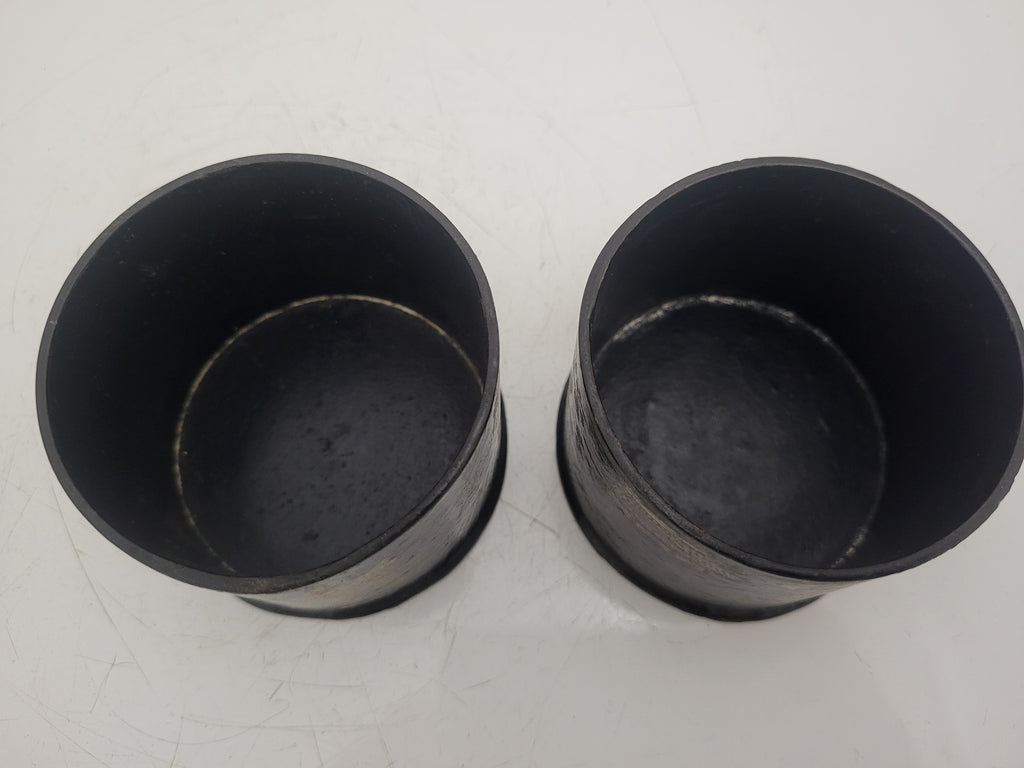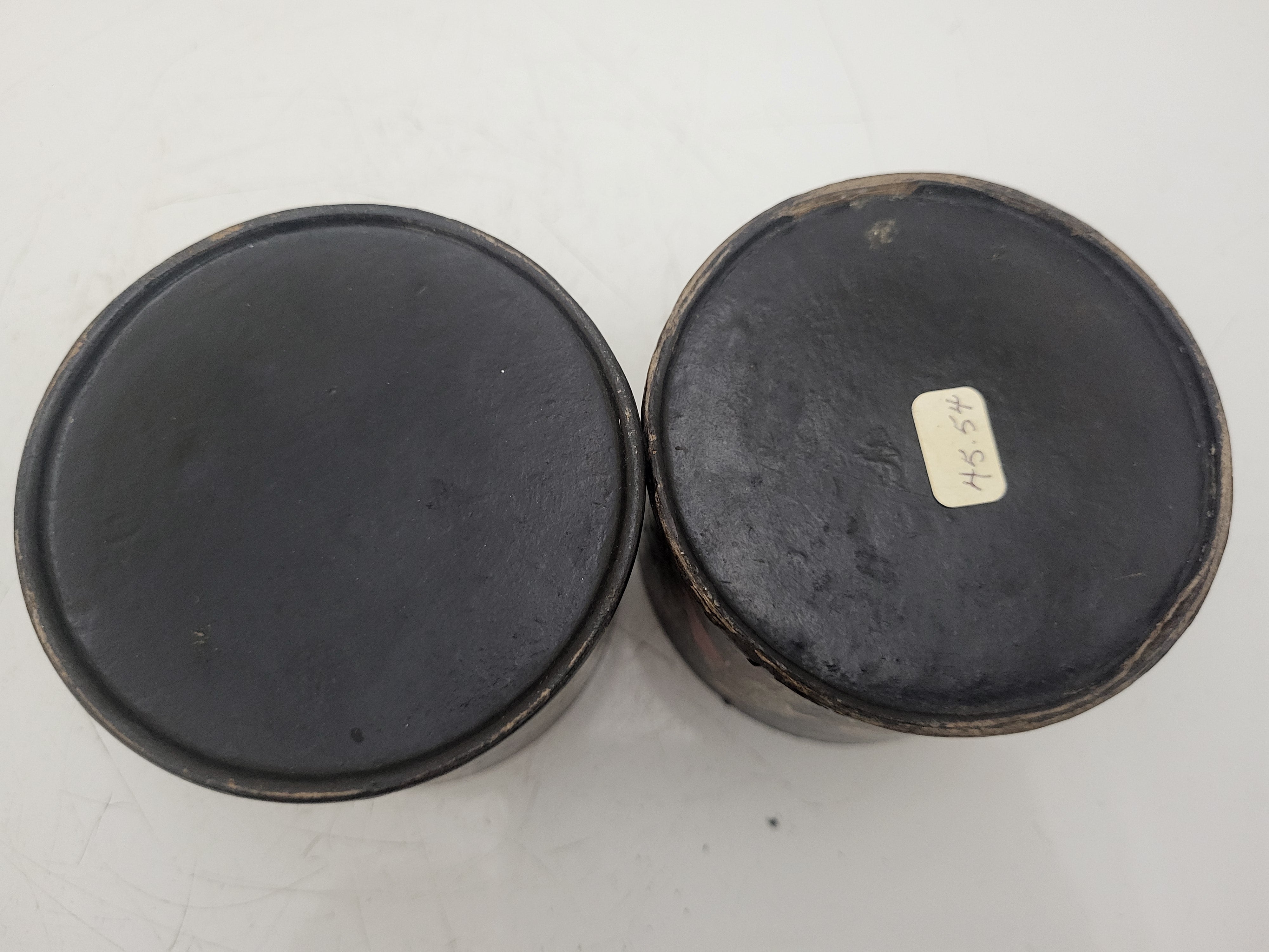 Each measures approximately 3" x 2 1/2" tall. Overall, both are in very good condition. One of them has a dent at the lid, one has a slight hairline at rim, both have light loss of paint.