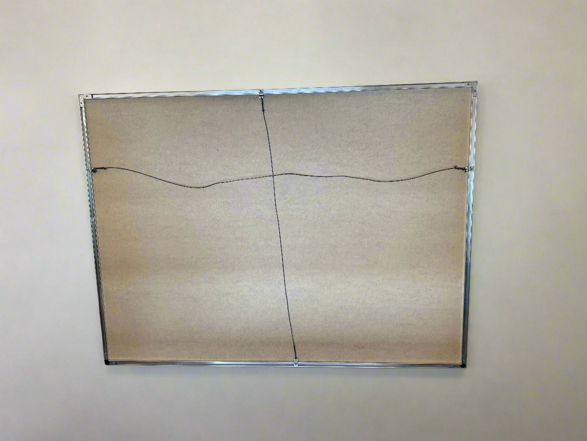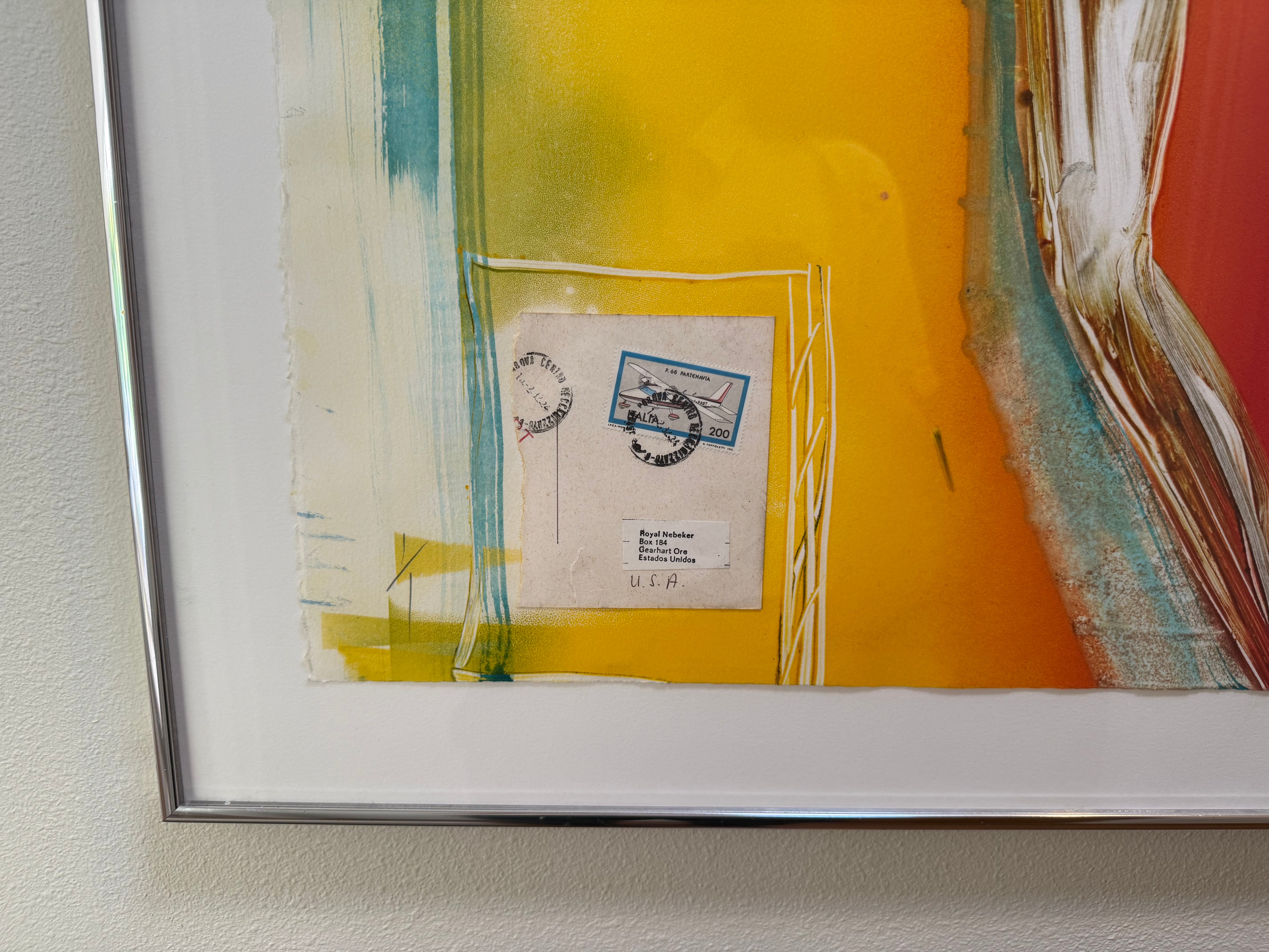 This painting shows two blank figures on top of a gradient background going from yellow to red to black. Nebeker uses some of his personal envelopes that were mailed to him, addressed with his name and general location in the U.S. at the time of this works conception.
