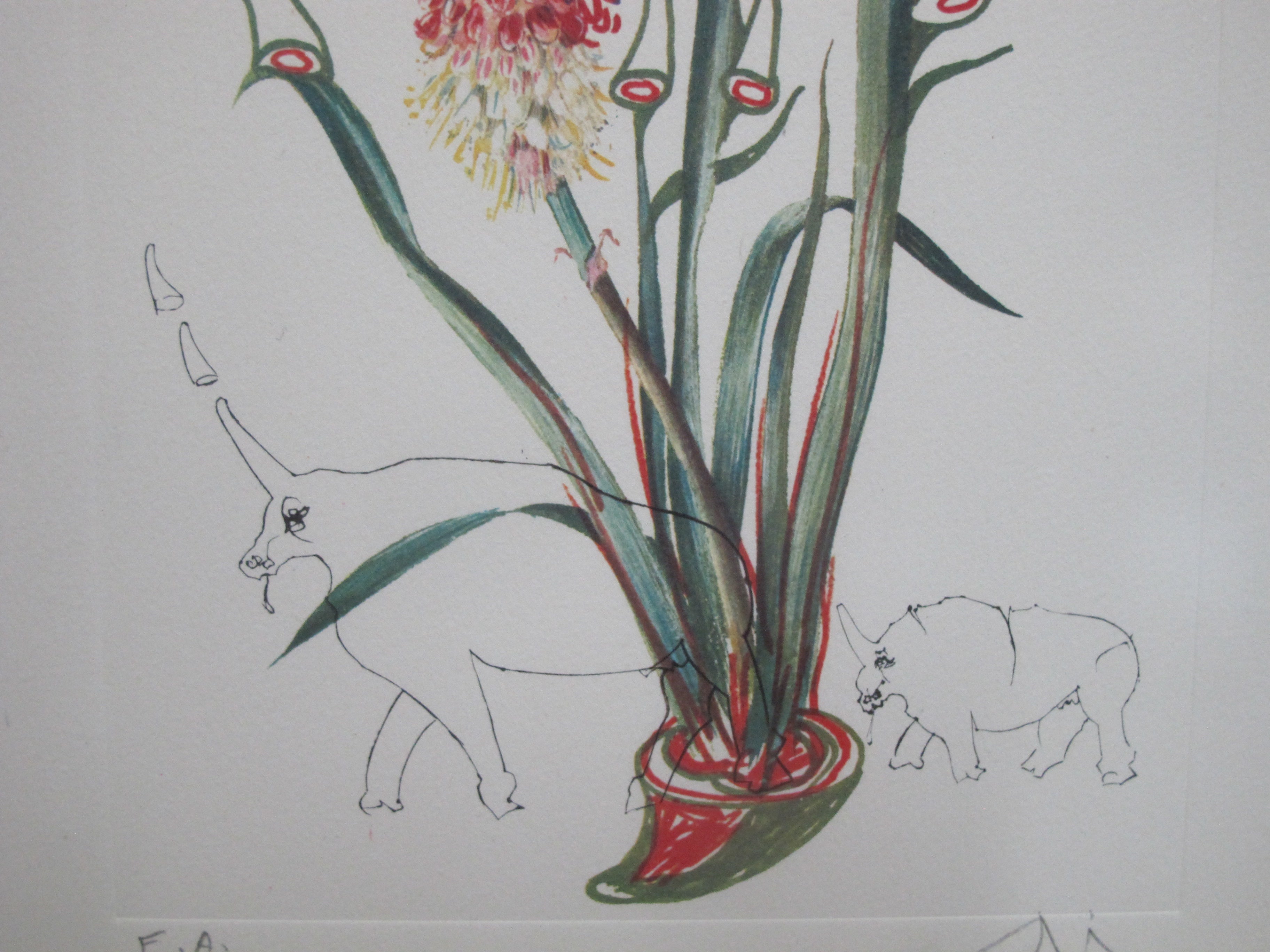Framed lithographic print, Kniphofia Aphrodisiac with Rhinos from Surrealistic Flowers. Signed in pencil at lower right, EA at lower left.