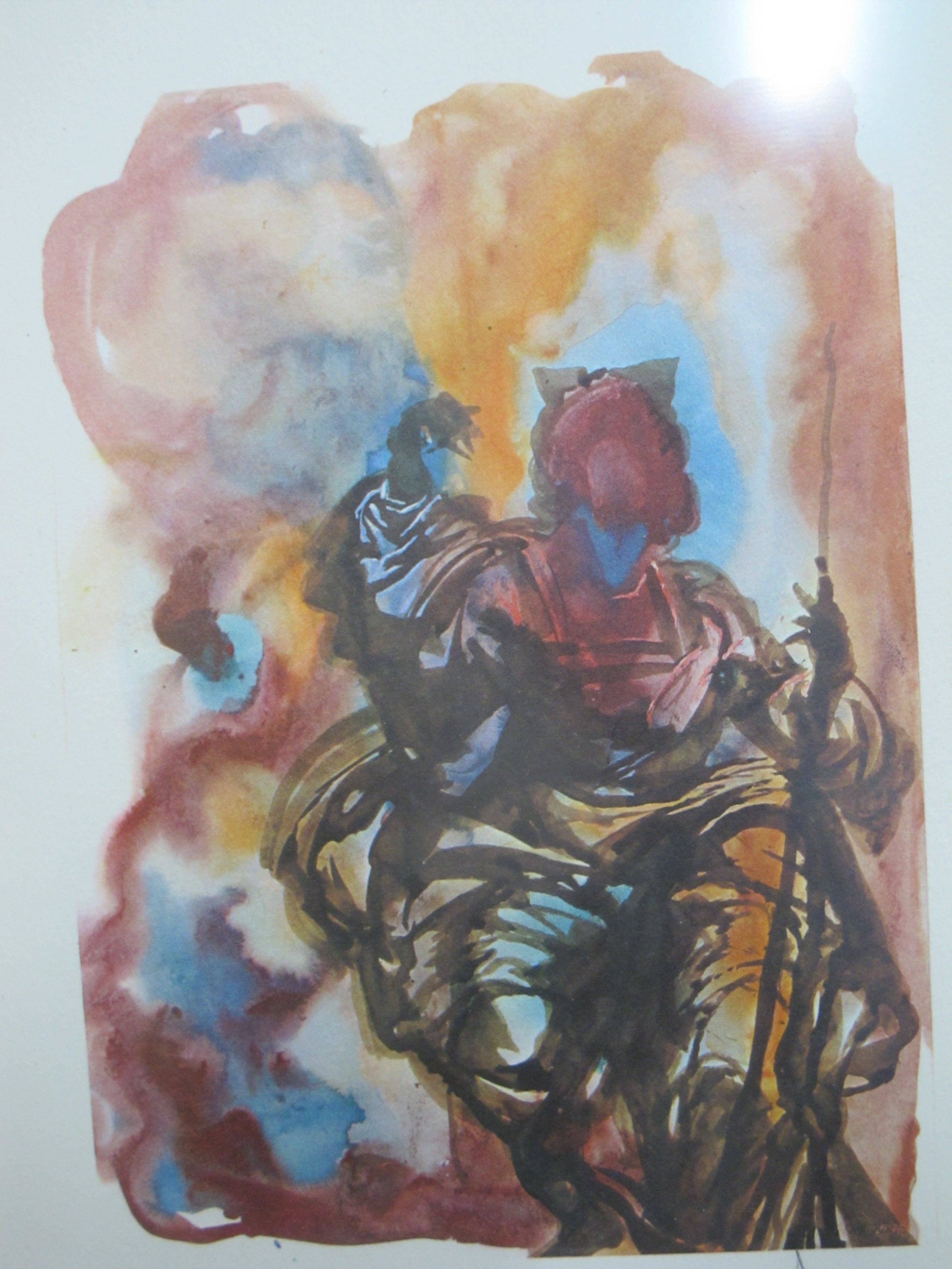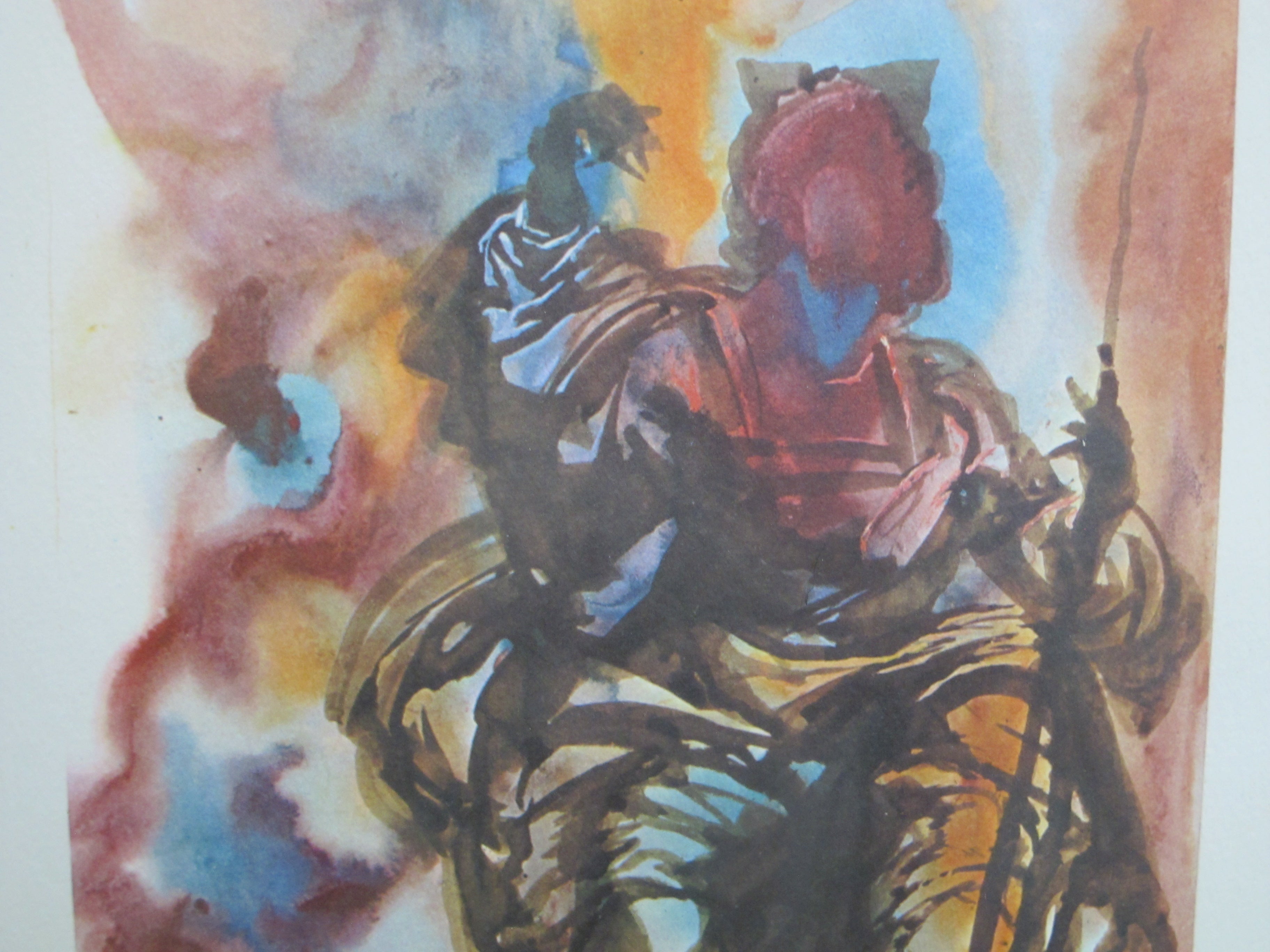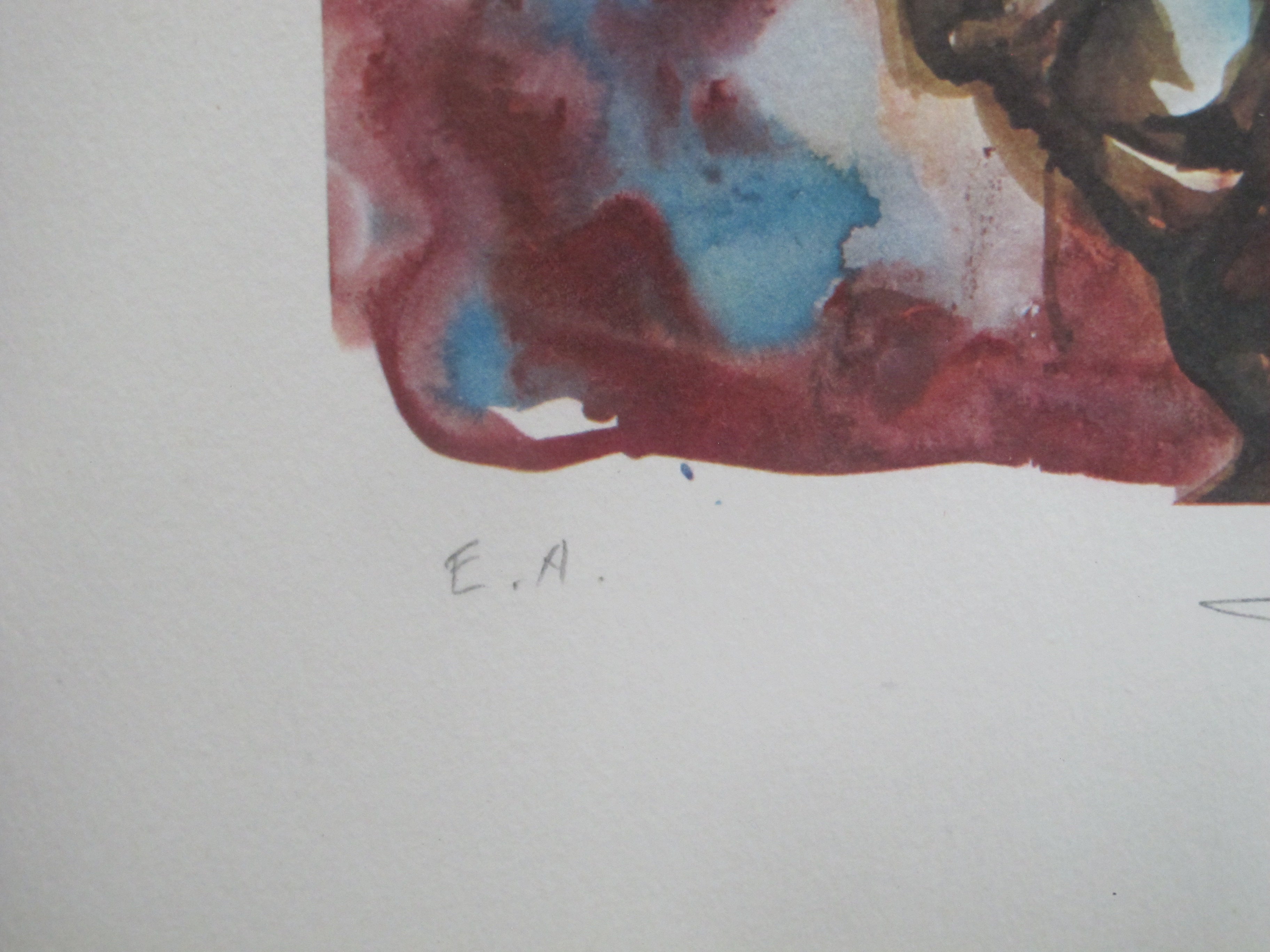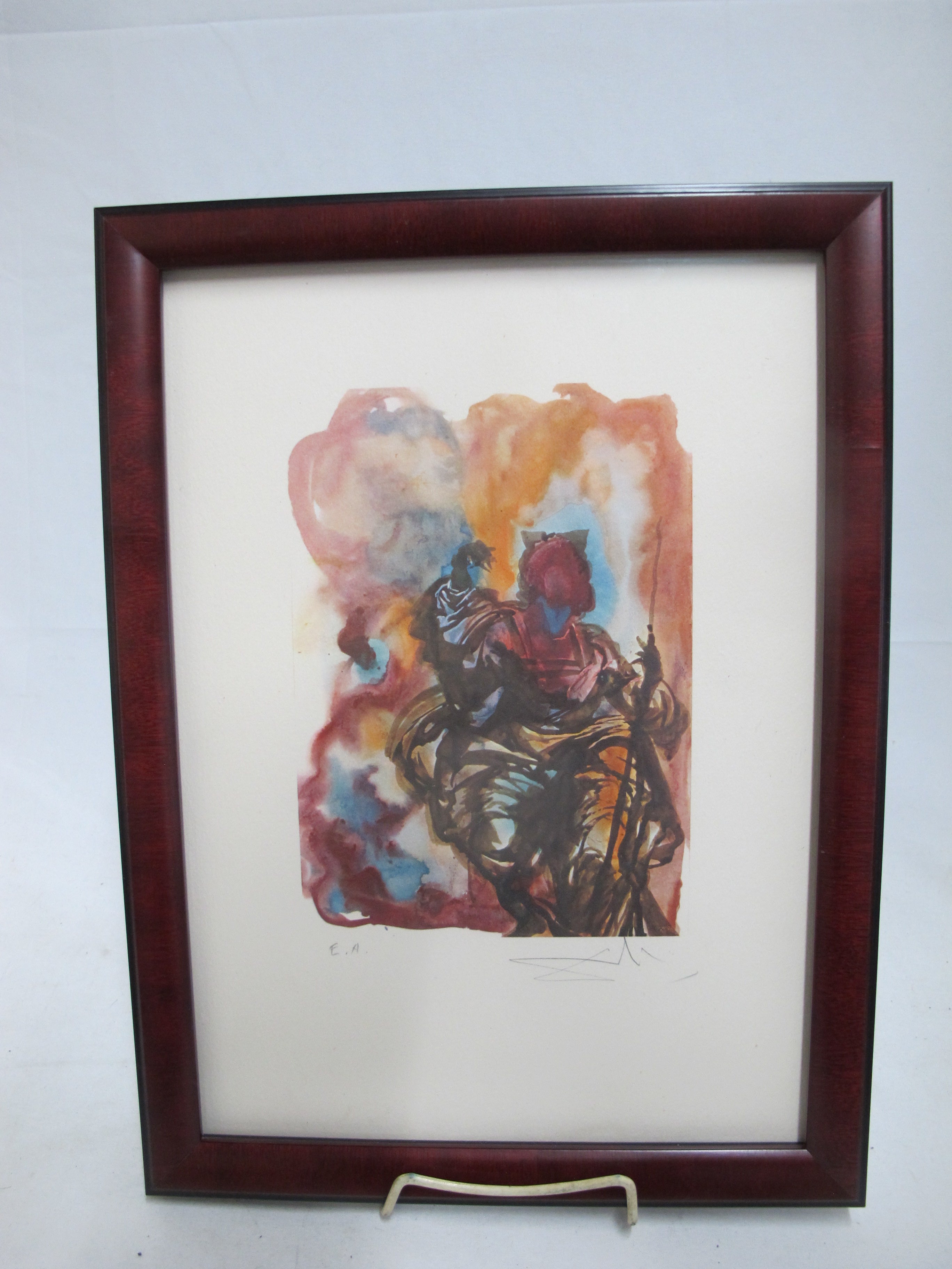 Framed serigraph, signed in pencil at lower right, EA at lower left. I believe this is titled El Juez, or The Judgment, as found on Mutual Art. Frame measures 11 1/2" x 15 1/4". Image measures 6" x 8". Excellent condition.