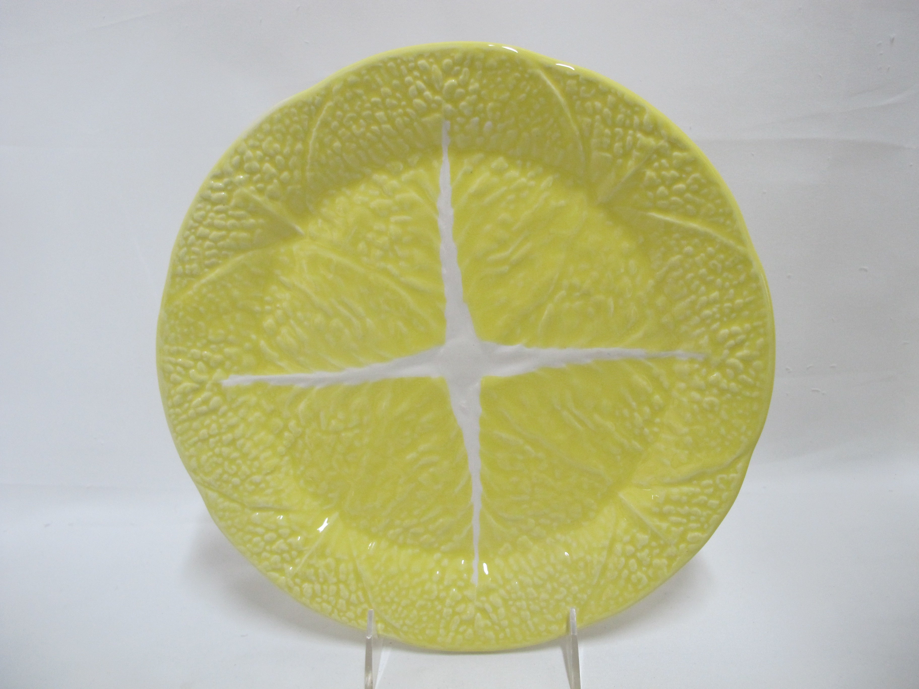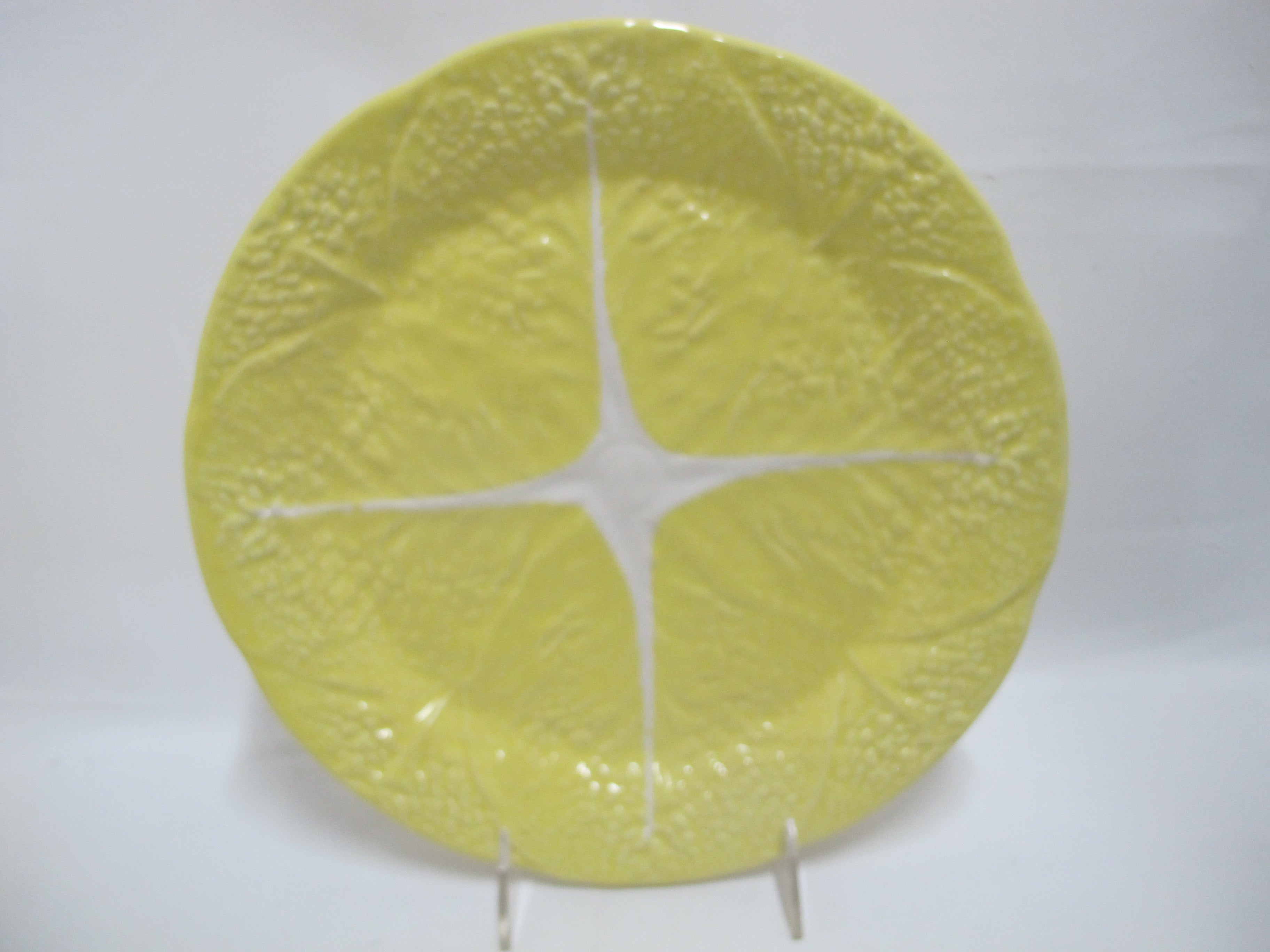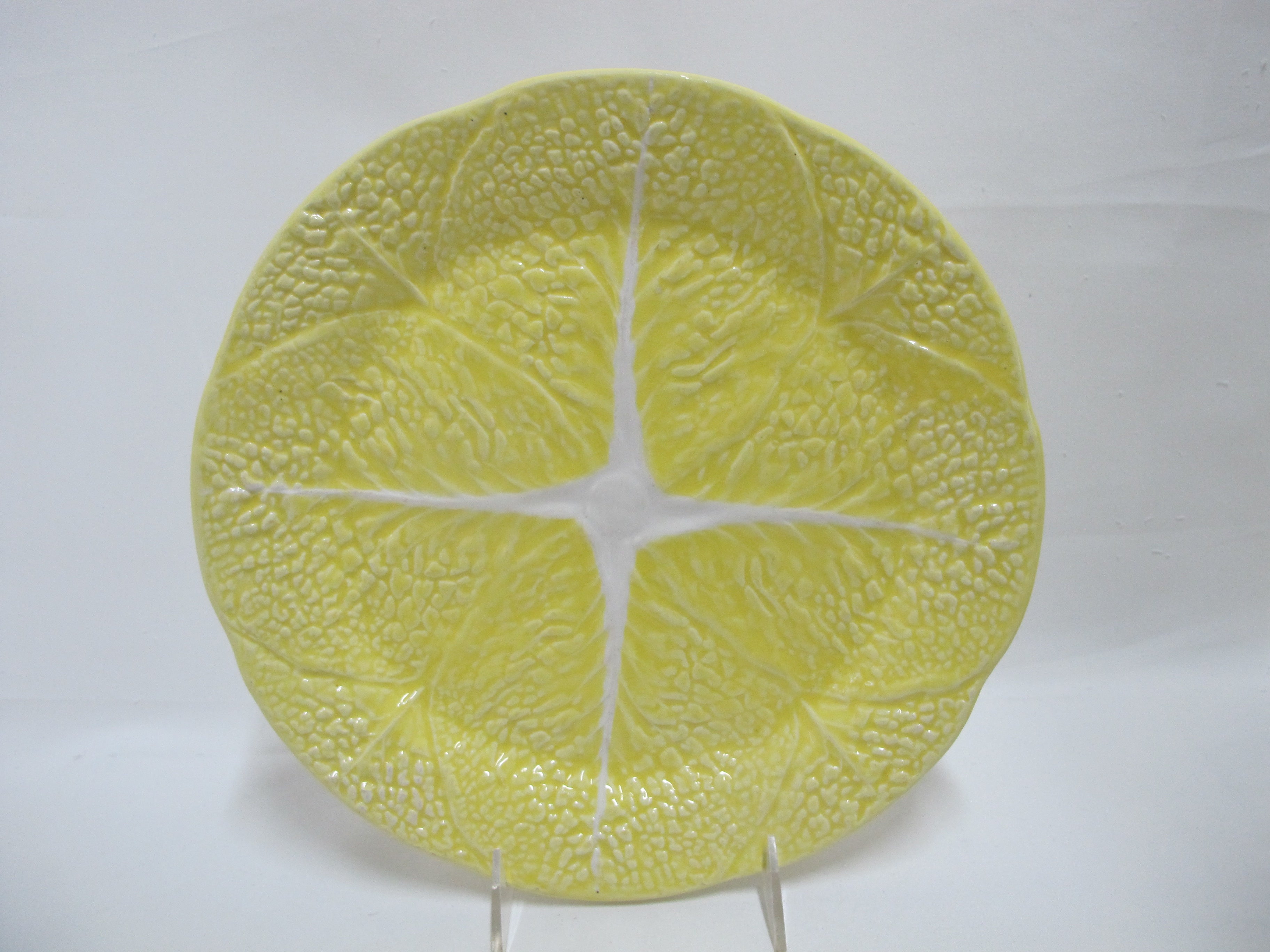 Secla, Made in Portugal, fun set of mid century majolica cabbage leaf dinner plates. Brightly hand painted in yellow, each measures 11" x 1" tall. All are in excellent condition, no major chips, cracks, or repairs. May have minor crazing or wear to glaze, as photographed