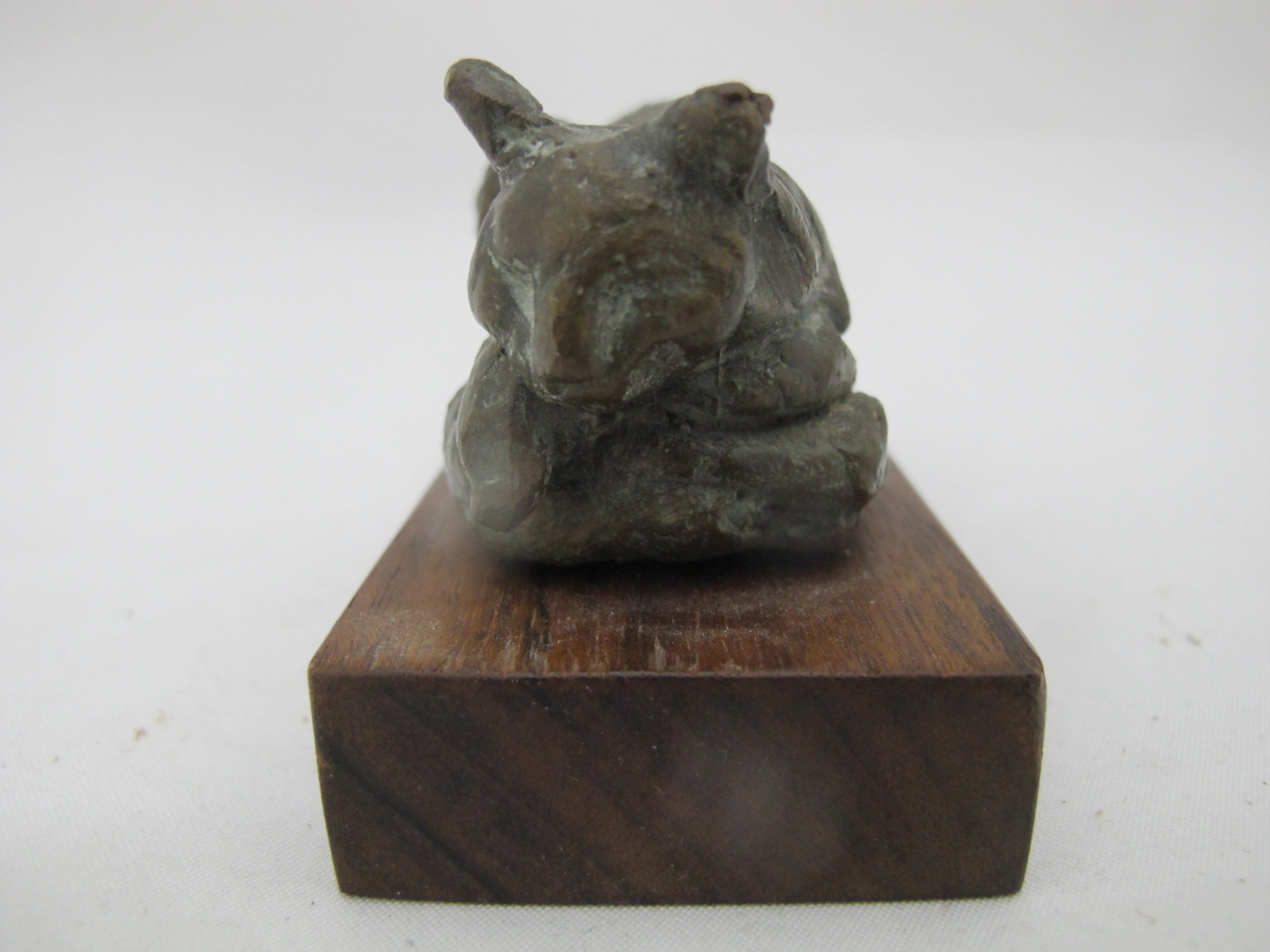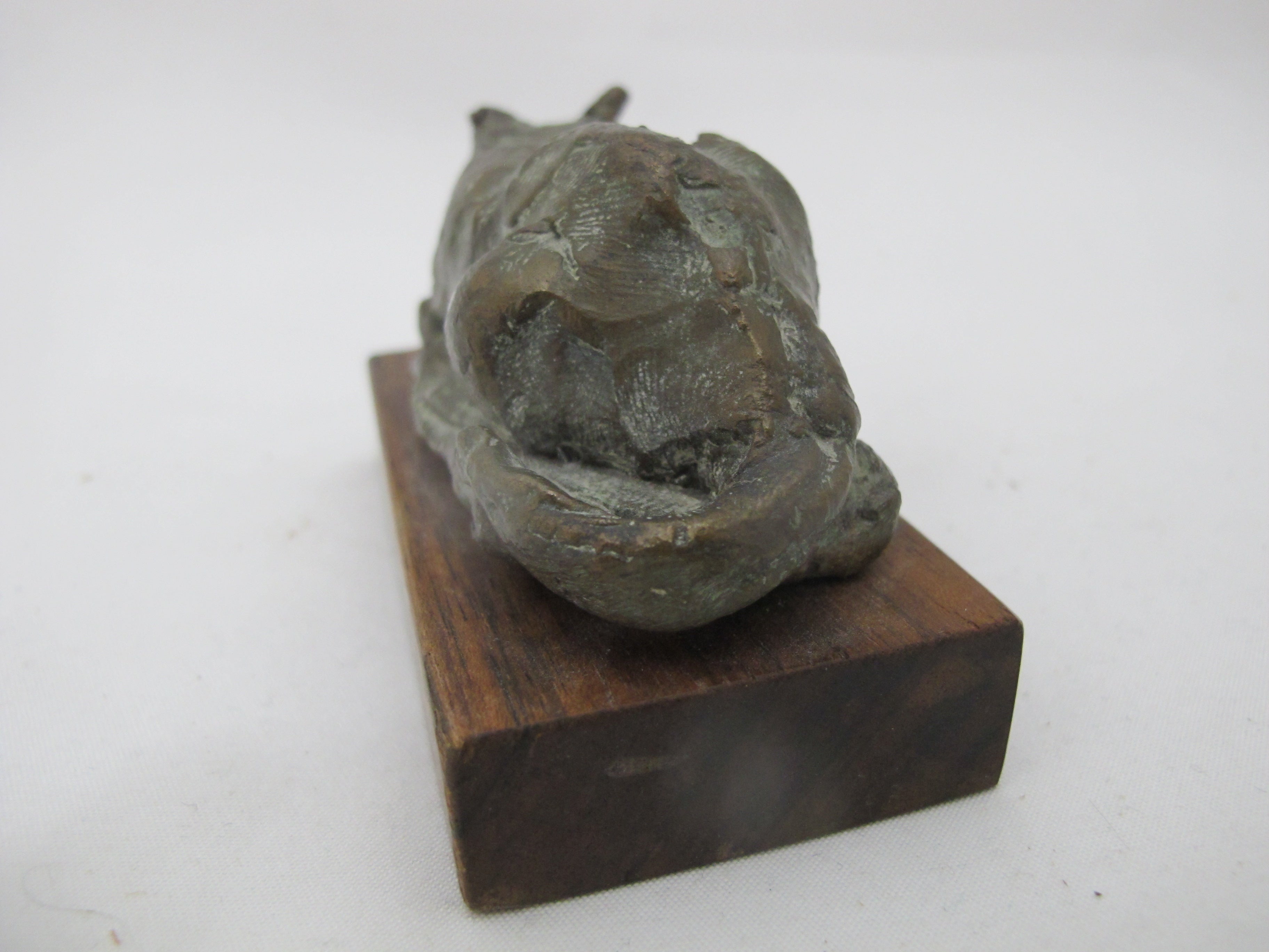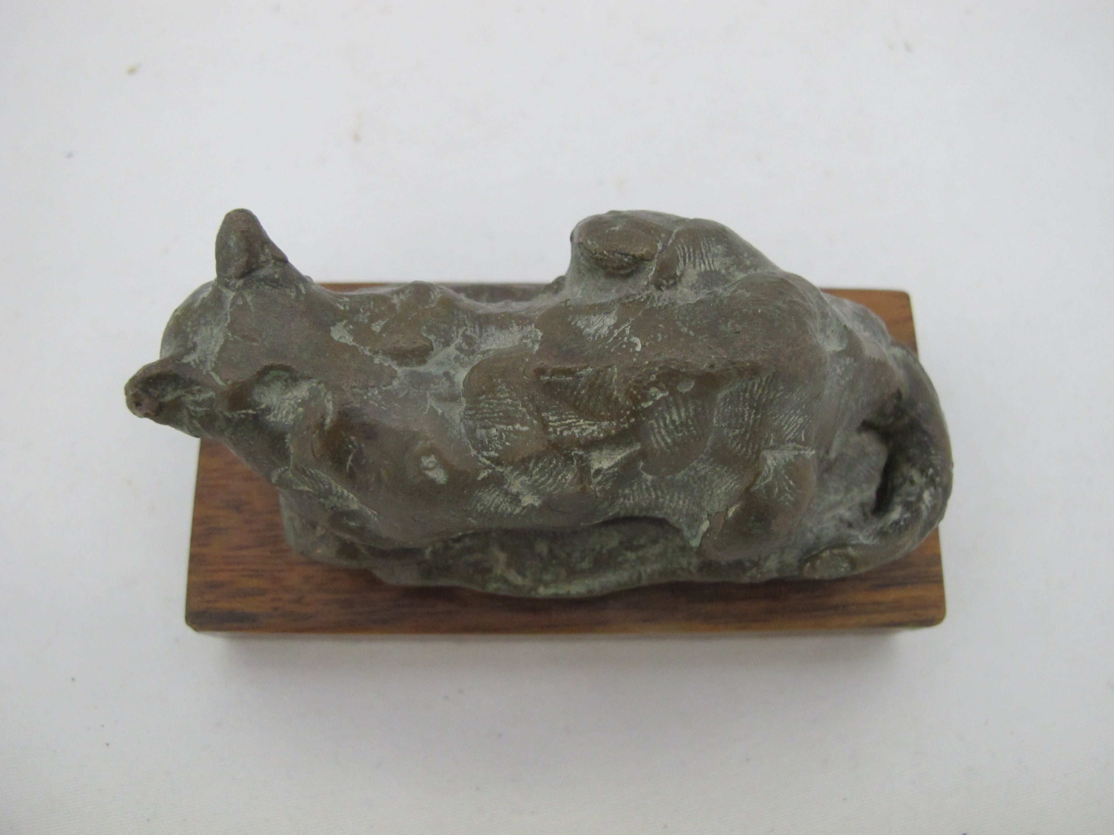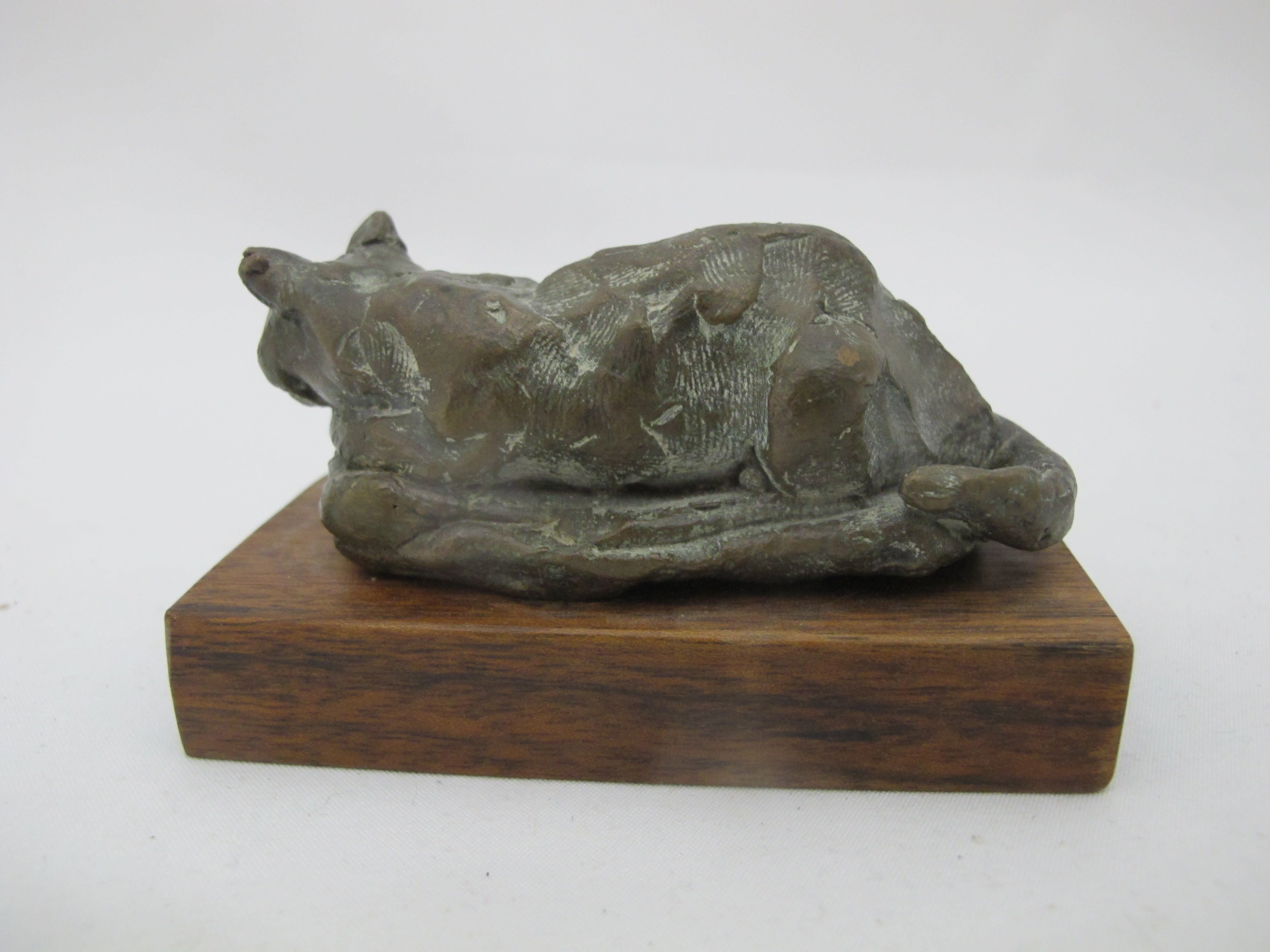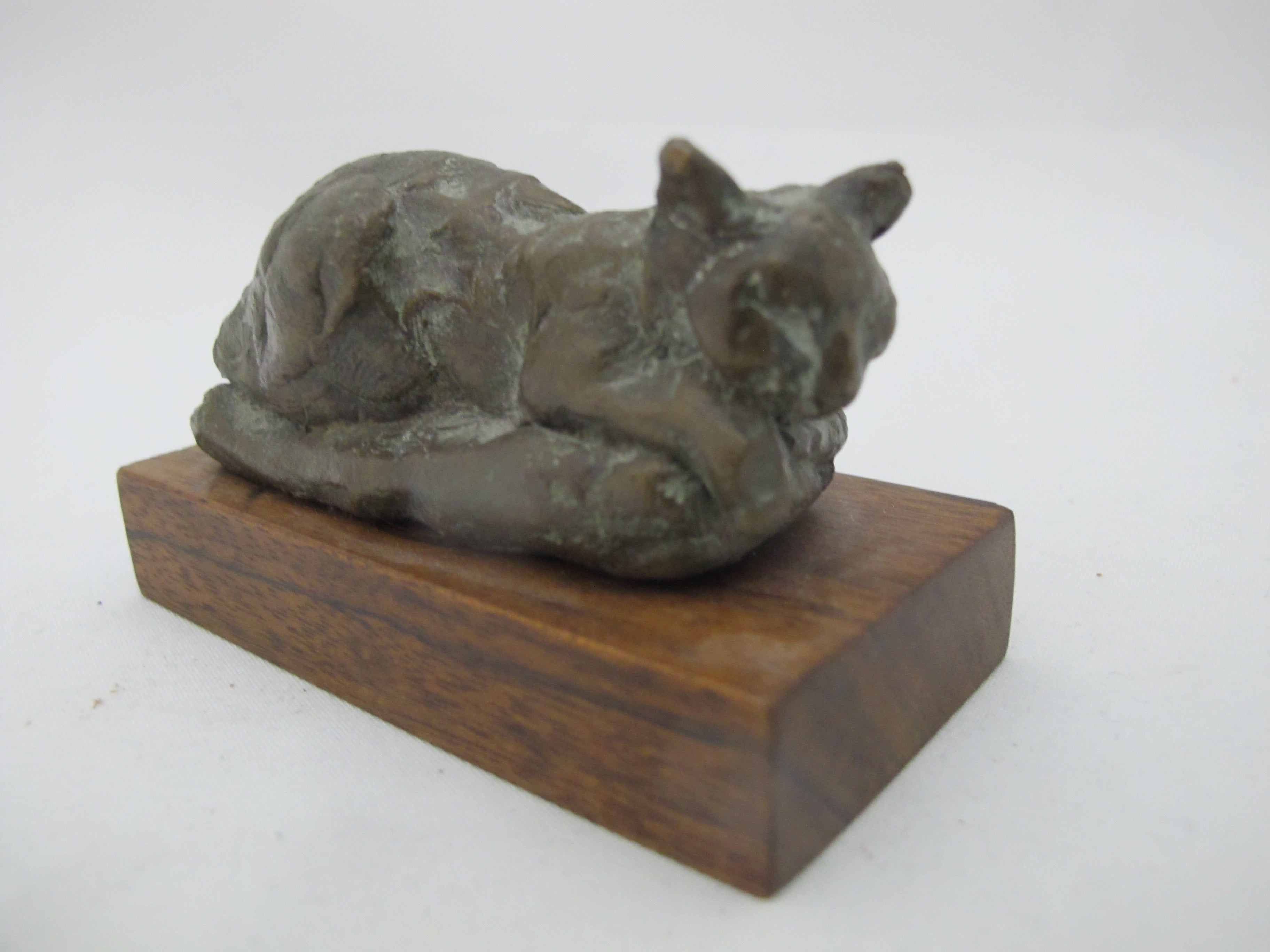 Small Bronze sculpture of a lounging kitty perched upon a wood base. Attached to wood base, but moves around. Measures 3 3/4" x 1 3/4" x 2" tall, including base. Excellent condition.