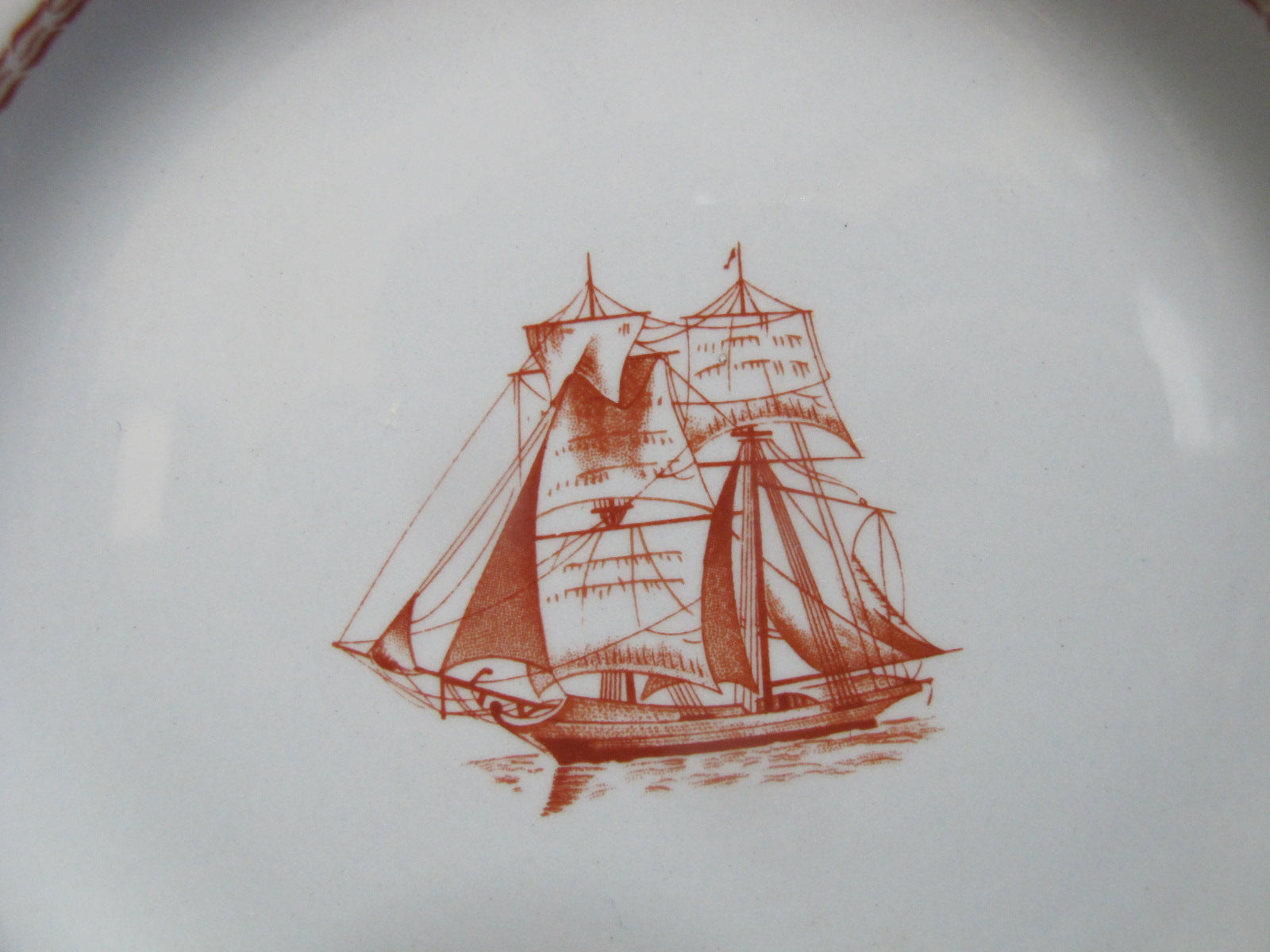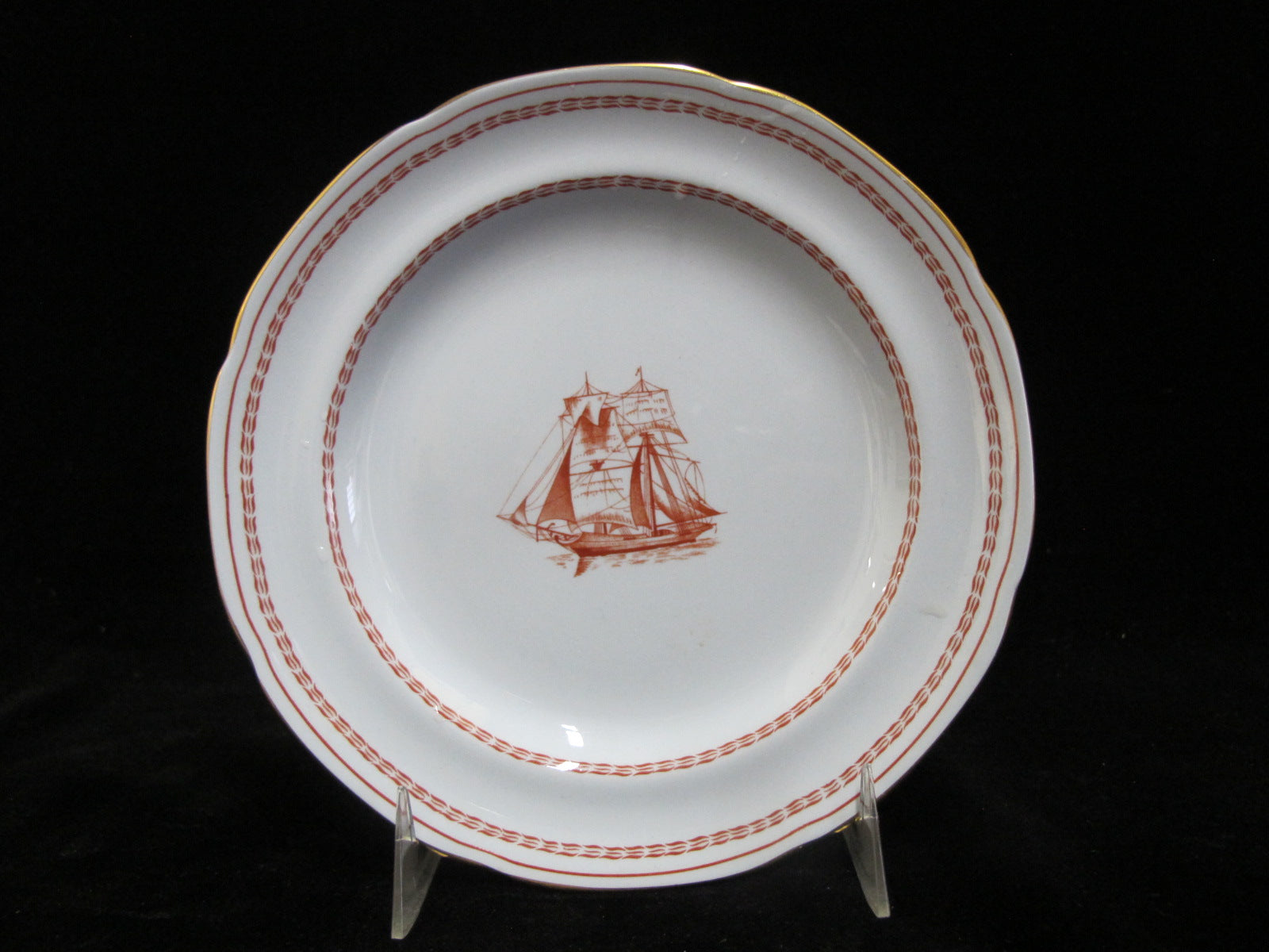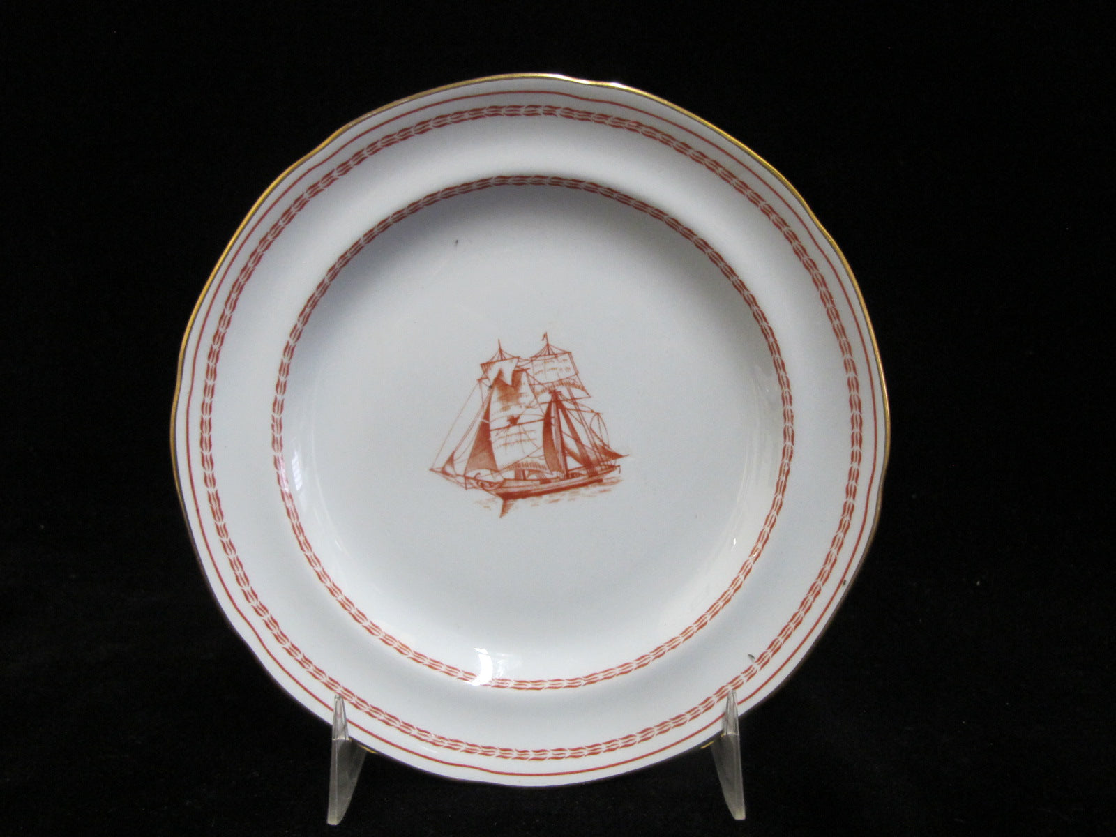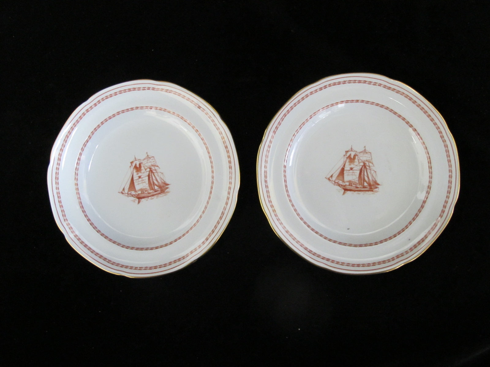 Spode Copeland Trade Winds bread and butter plate set of 2. Red design with gold trim showing Ship Brig Built 1820 design.