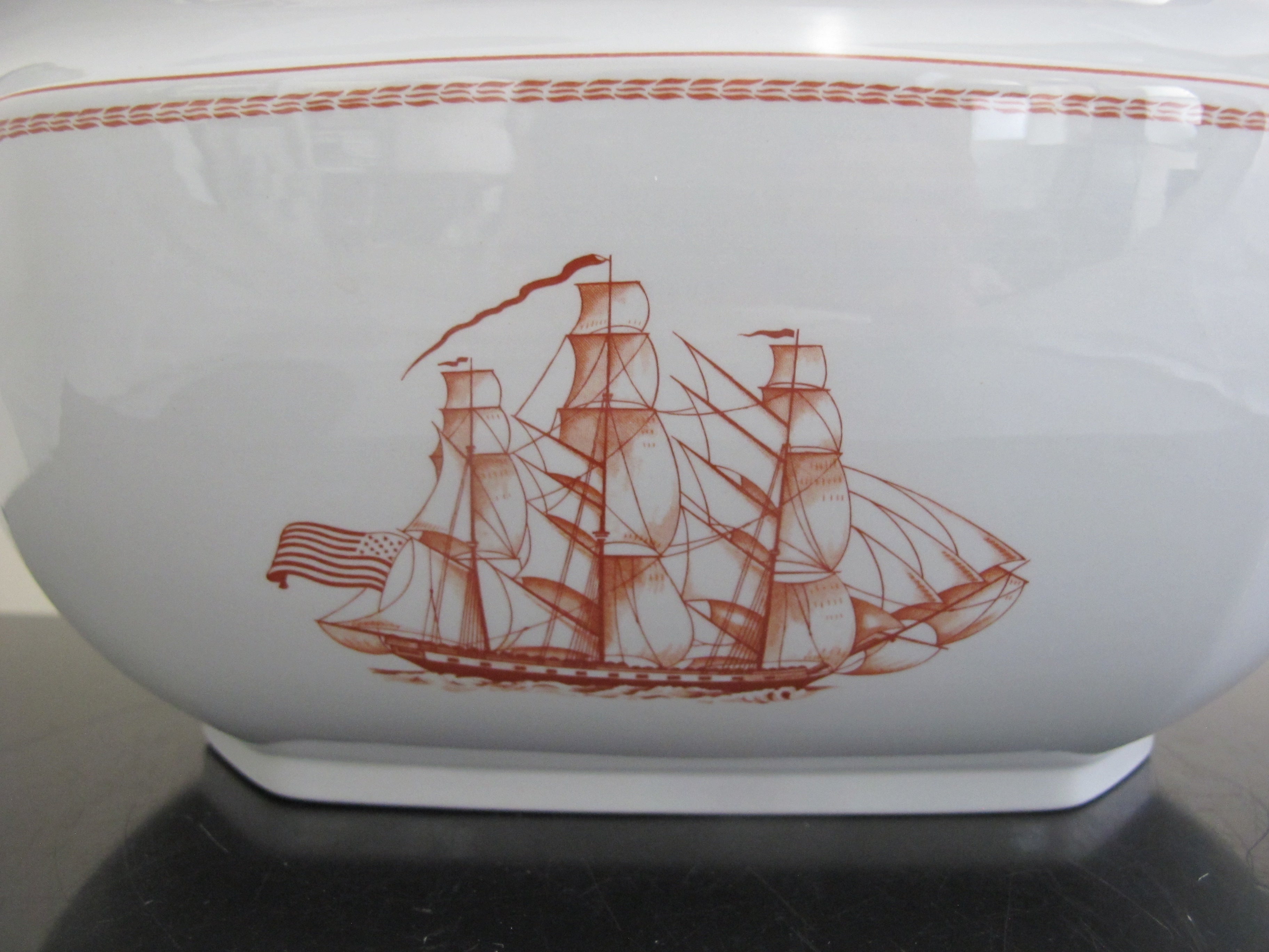 Classic Spode Copeland Trade Winds tureen with red ship design and gold gilt trim. Measures 14" x 8 1/2" x 7" tall. Base reads Trade Winds Ship Pepperell Built 1854 and Ship Grand Turk Built 1786. Inner lid reads Ship Friendship of Salem Built 1797 and Ship Recovery of Salem 1794. Excellent condition, no chips, cracks, or repairs. Slot for ladle, but ladle not included.