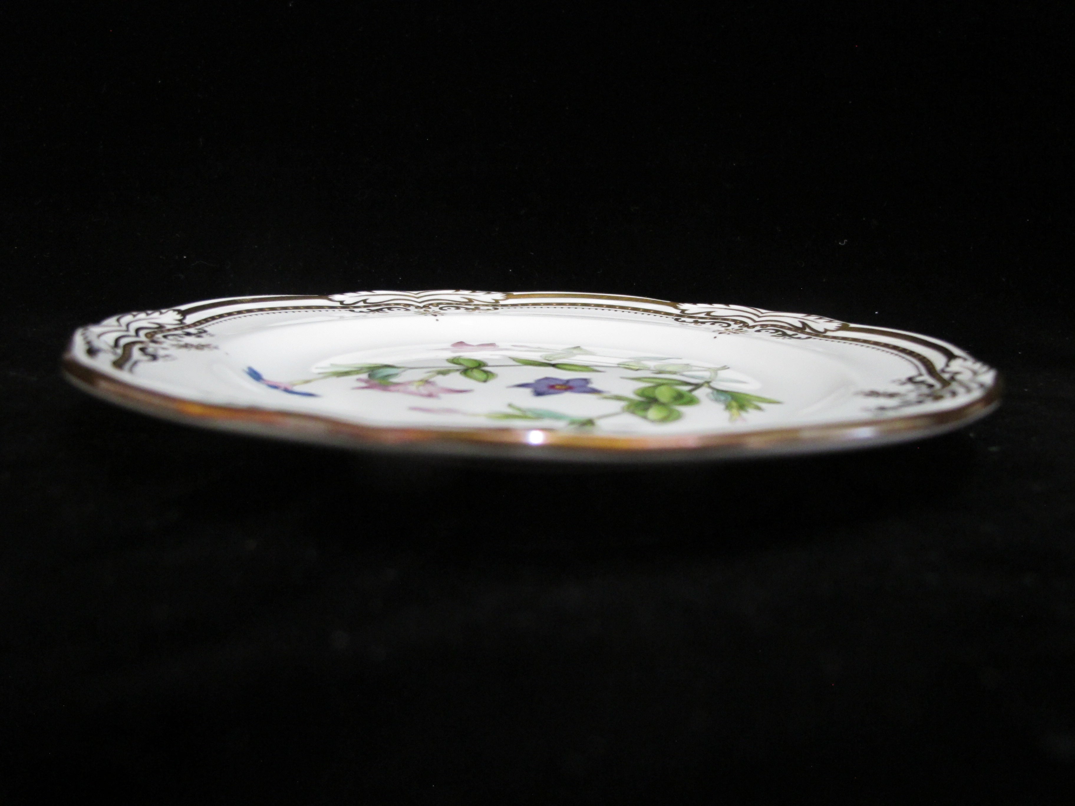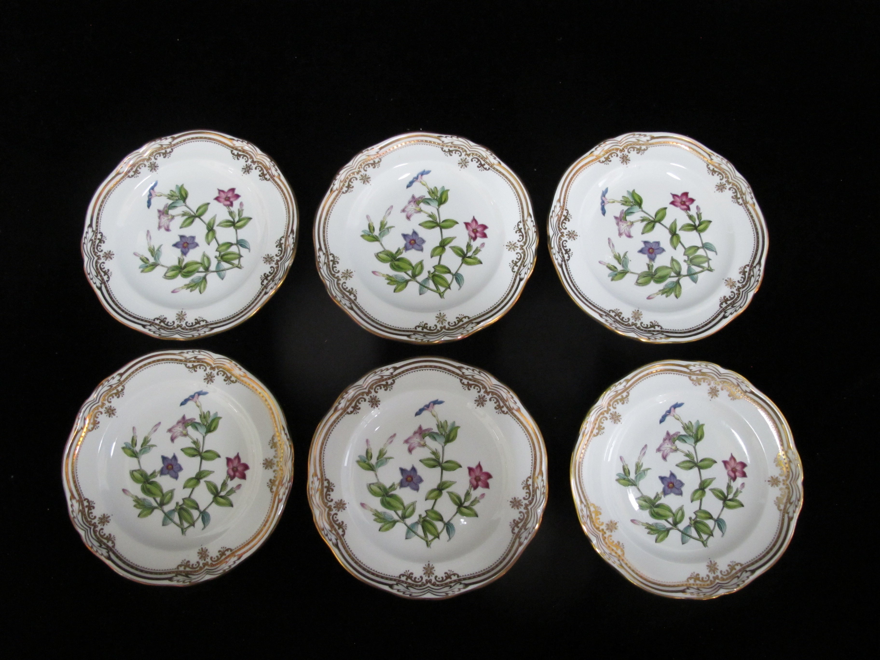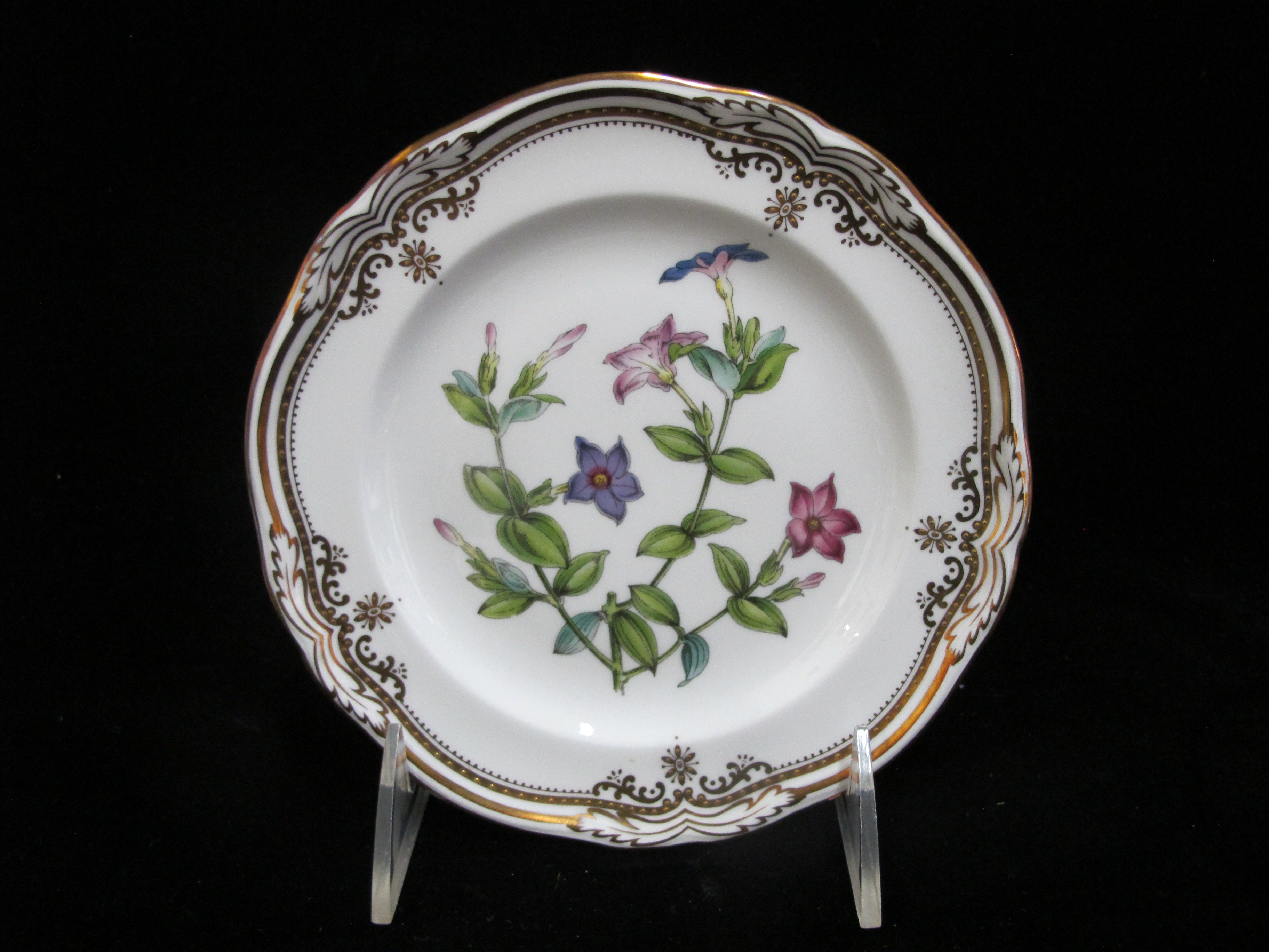 Gorgeous Spode Stafford Flowers bread and butter plate set of 6 in Tachiadenus flower pattern. Intricately hand painted flower center in purple tones with green leaves. Scalloped edge outlined in gold gilt. Each measures 6". All are hallmarked at base and in excellent condition, no chips, cracks, or repairs.