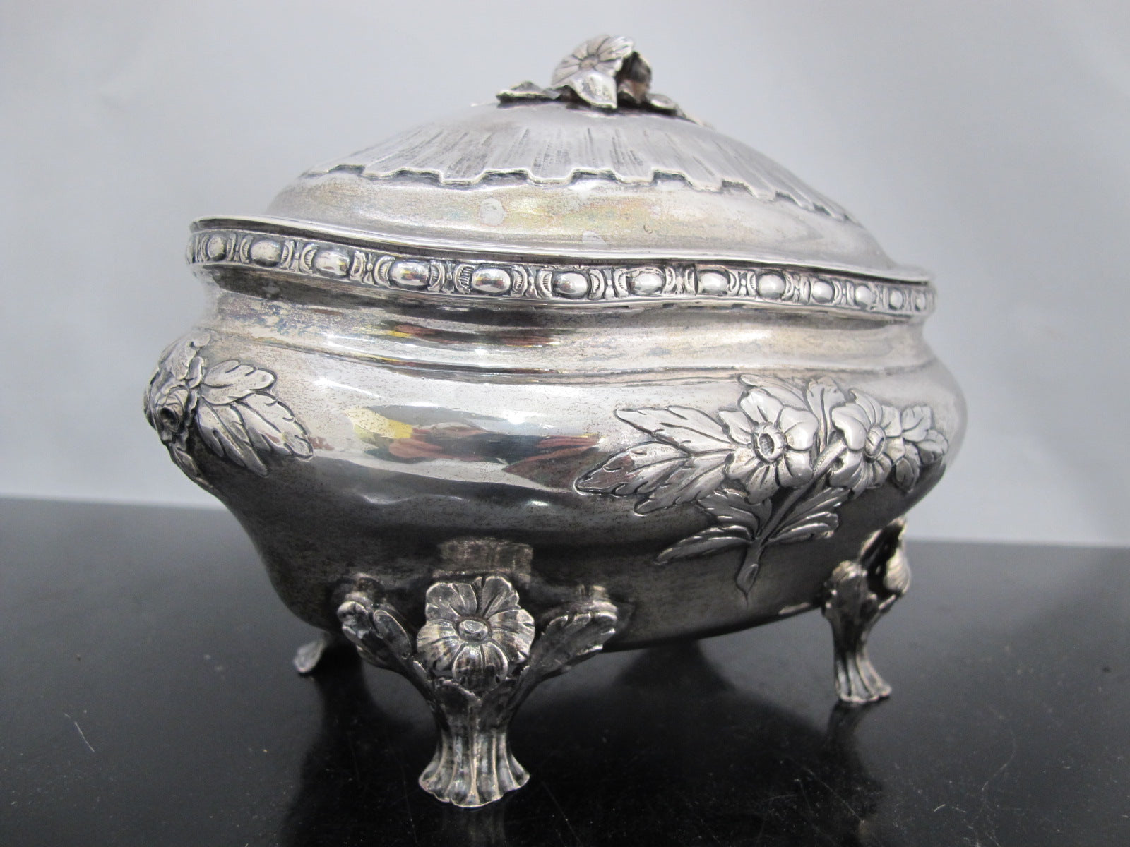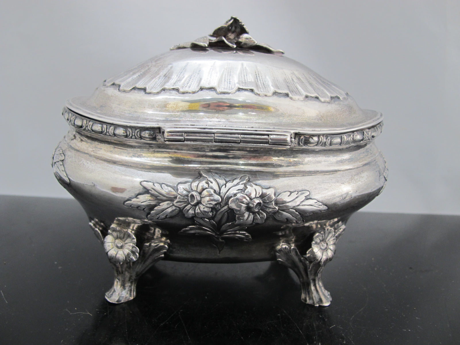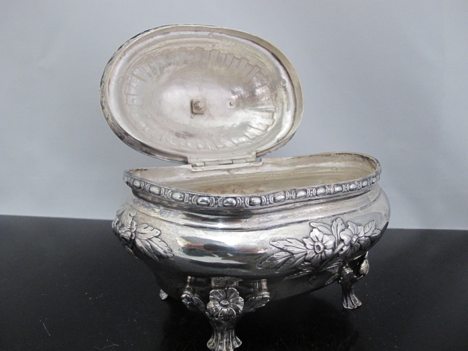 Rococo style oval box with hinged lid and raised on four scroll feet. Engraved with elaborate floral motif and floral finial at lid.