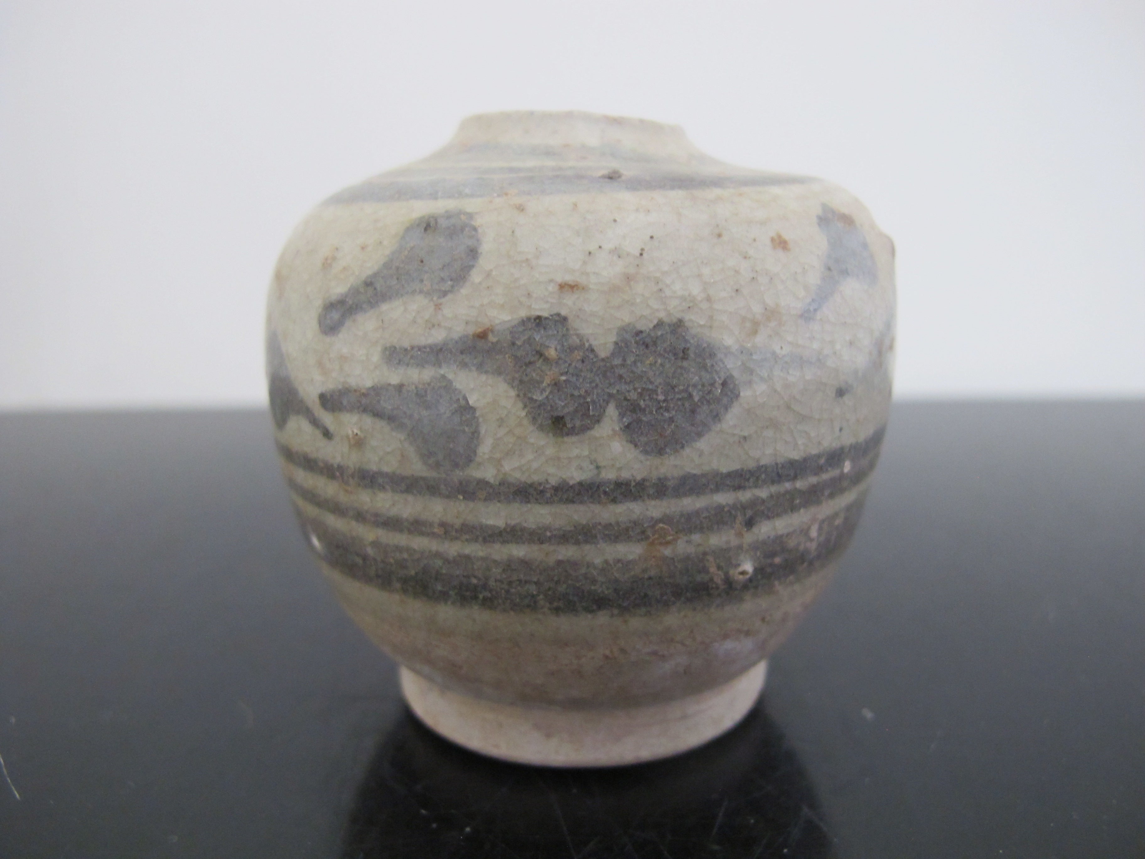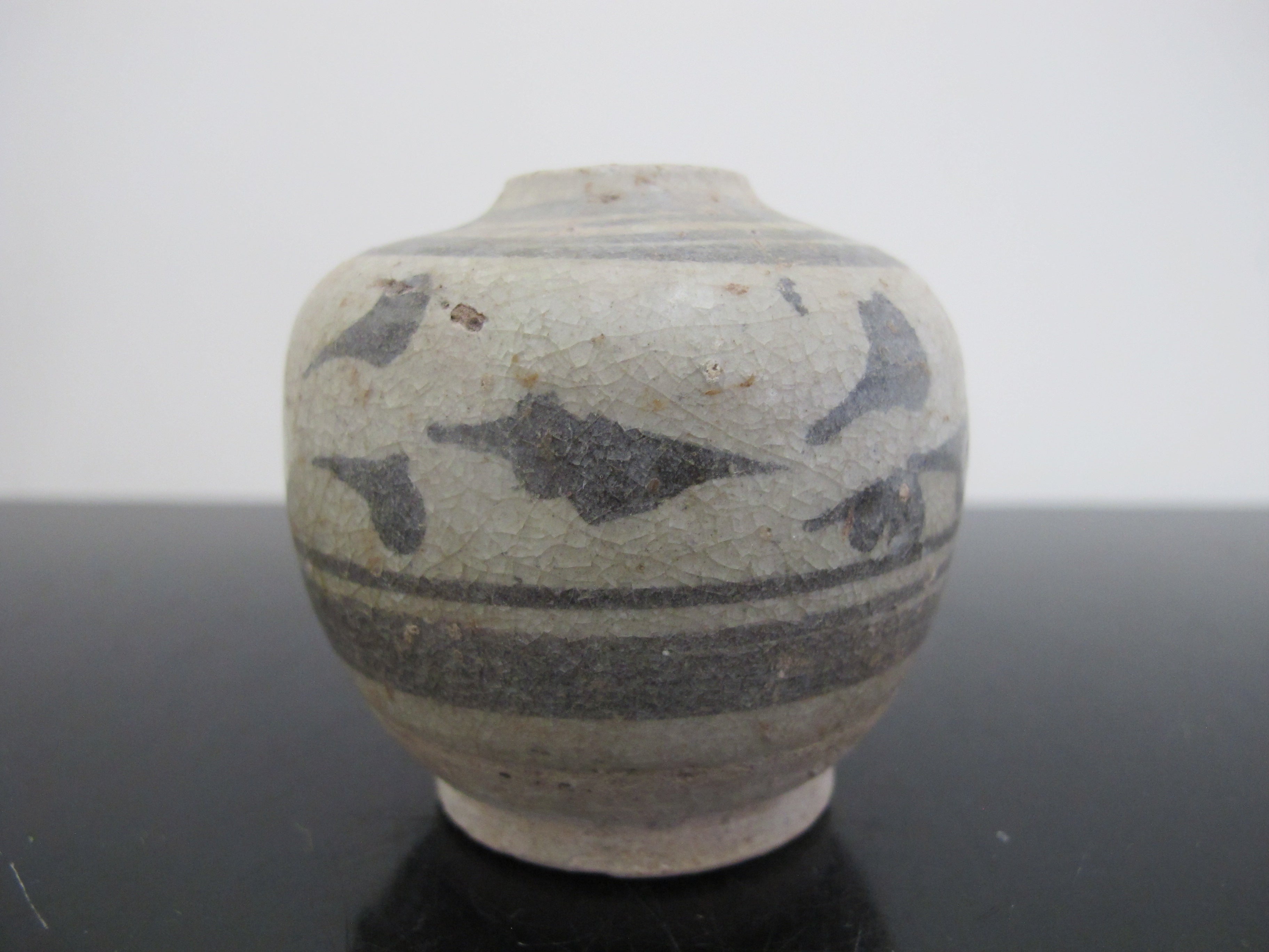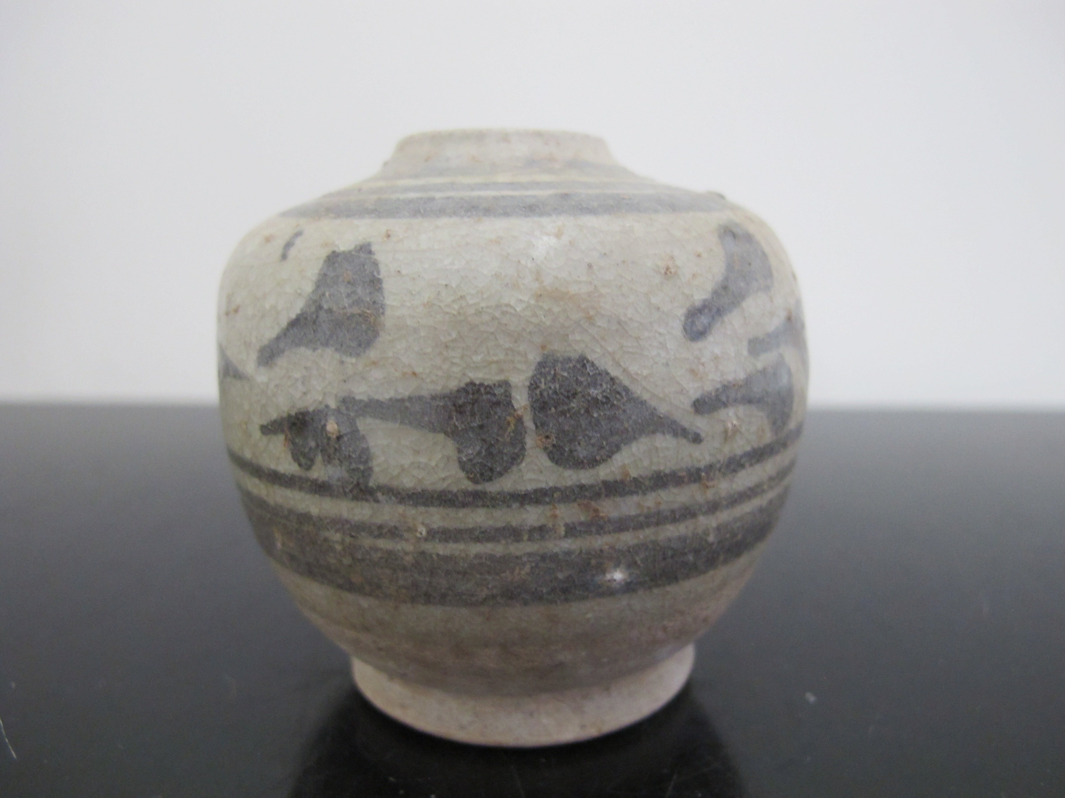 Antique Thai miniature jarlet. Globular shape, tapering at mouth. Clear glazed earth tone pottery with spiraling design and abstract bird or maybe leaf design. Measures 2 3/4" tall x 2 1/2" x 2 1/2". Excellent condition, no major chips, cracks, or repairs. Minor wear to glaze.