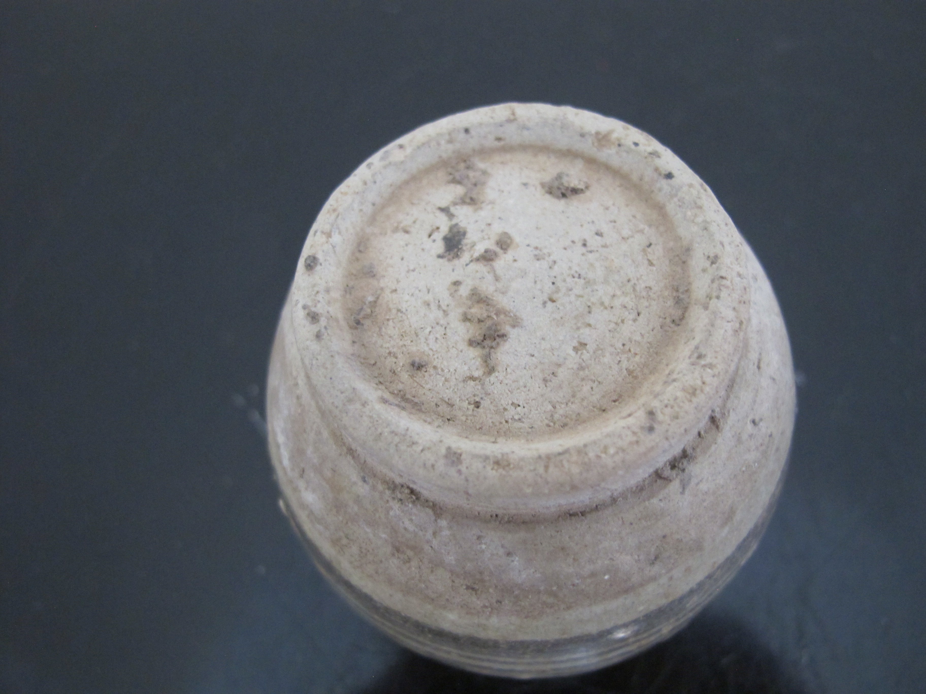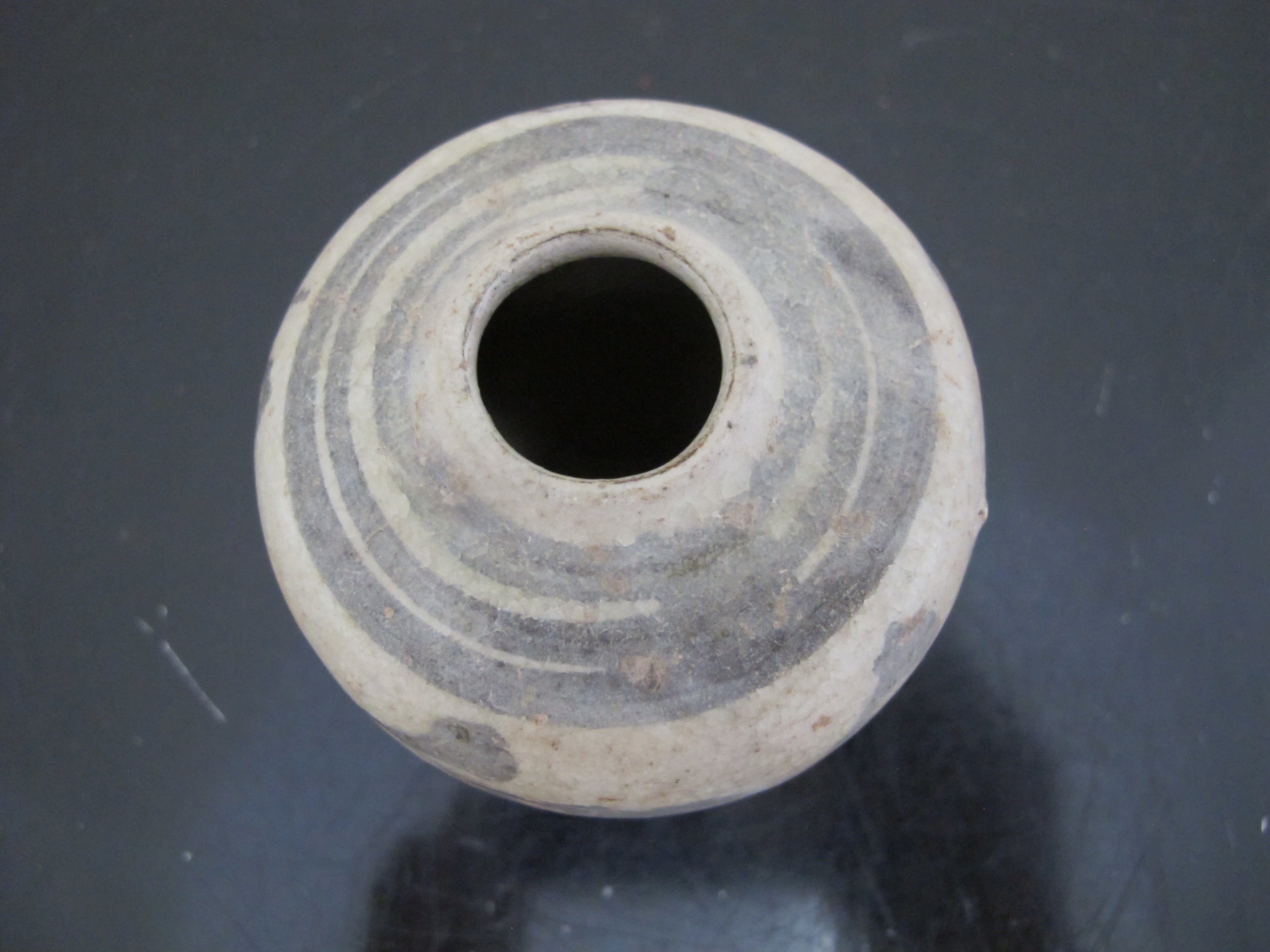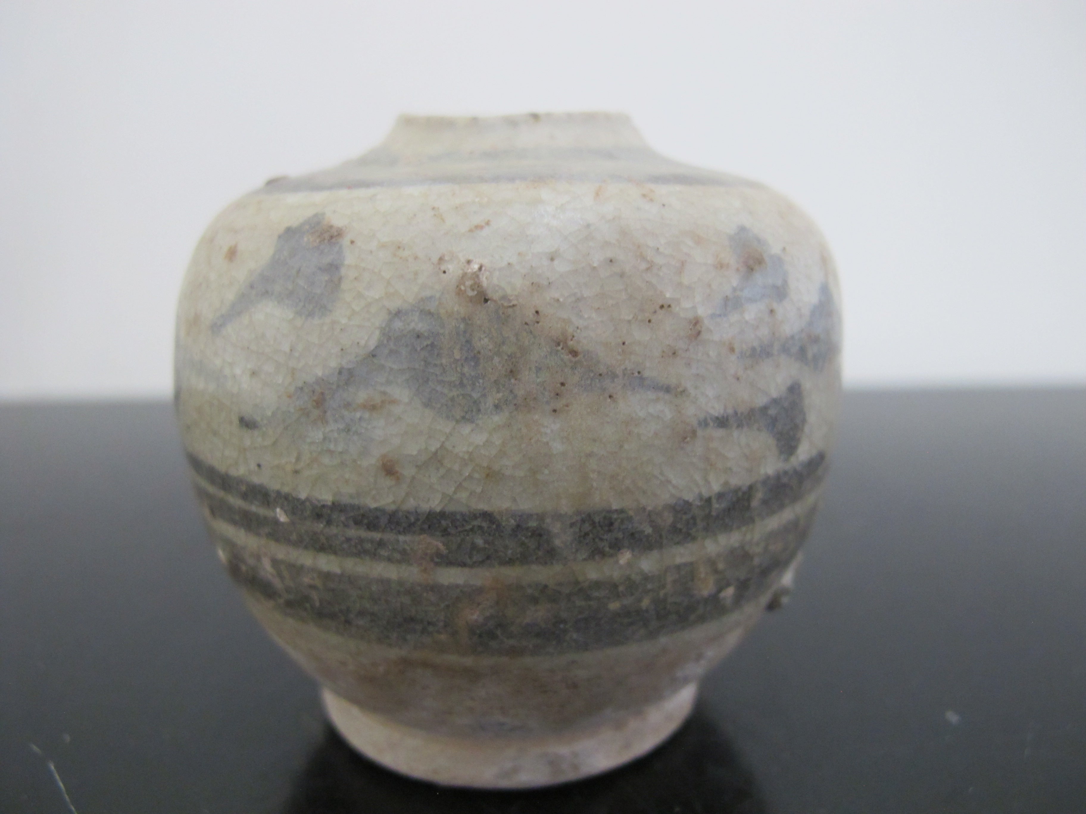 Antique Thai miniature jarlet. Globular shape, tapering at mouth. Clear glazed earth tone pottery with spiraling design and abstract bird or maybe leaf design. Measures 2 3/4" tall x 2 1/2" x 2 1/2". Excellent condition, no major chips, cracks, or repairs. Minor wear to glaze.