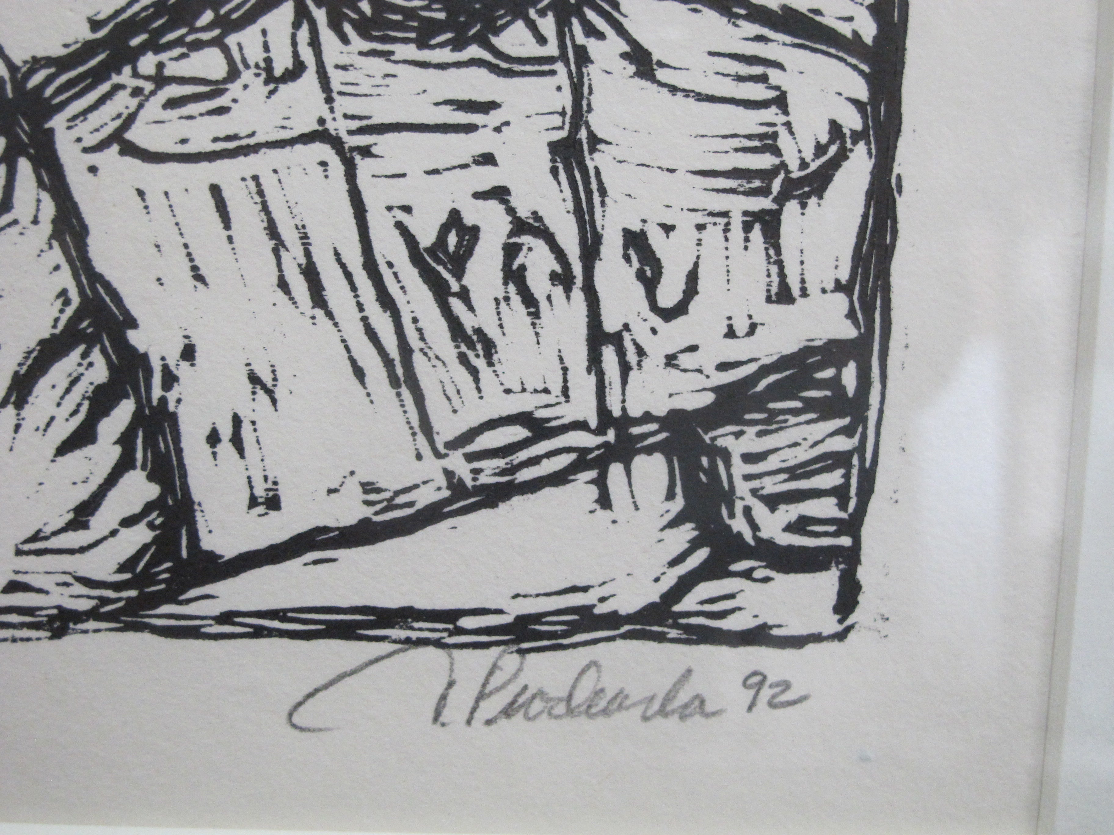 Tom Prochaska (Chicago/Oregon, 1945) framed black and white woodcut print titled, 'All My Friends Are Pi'.
