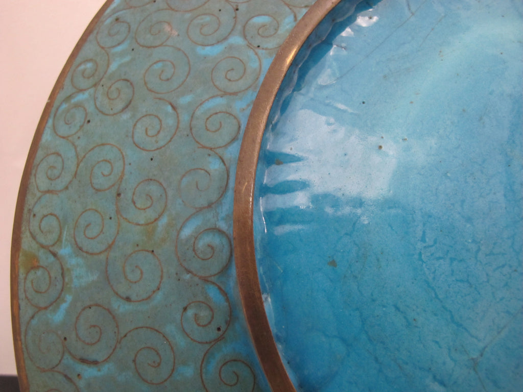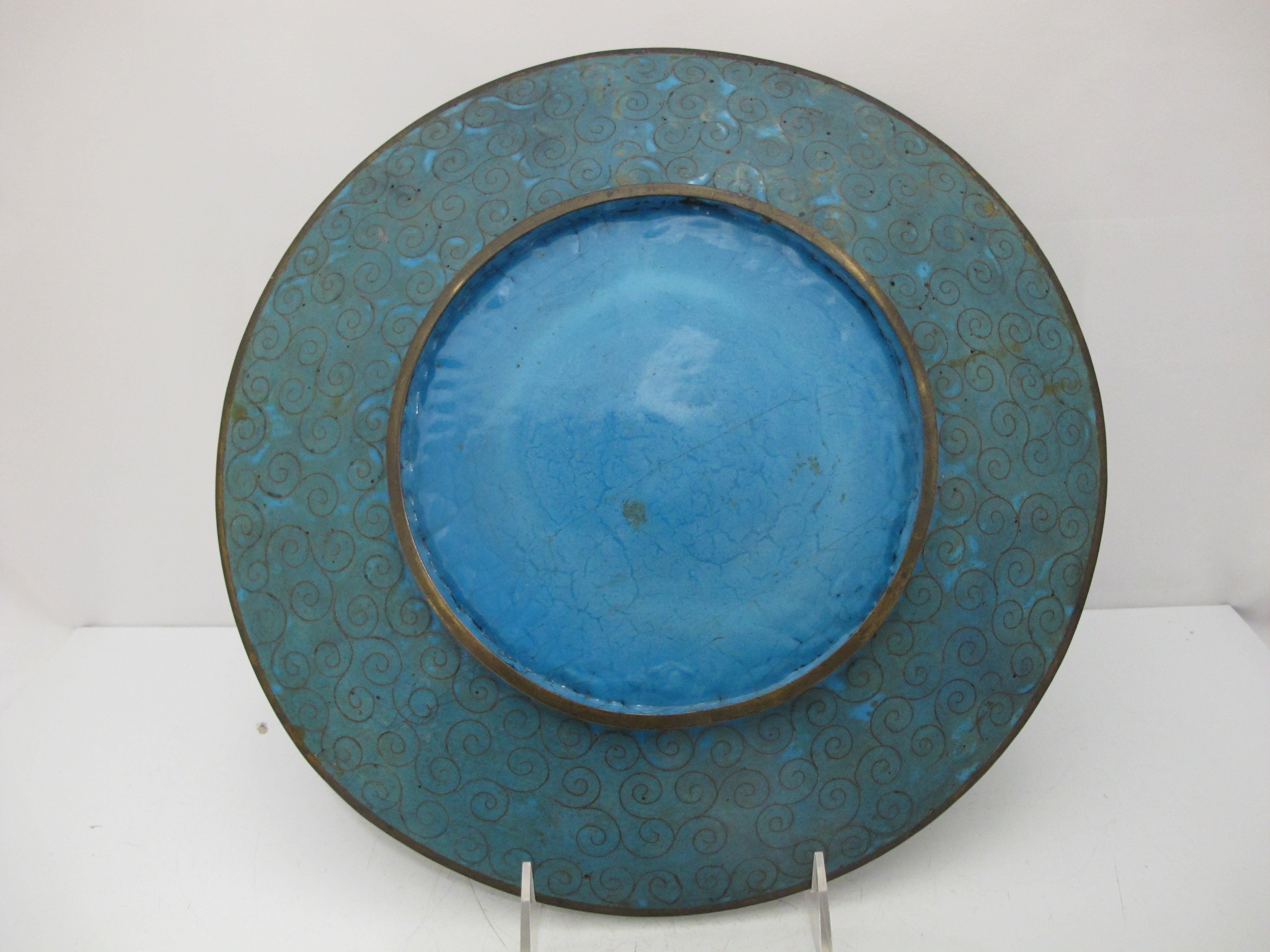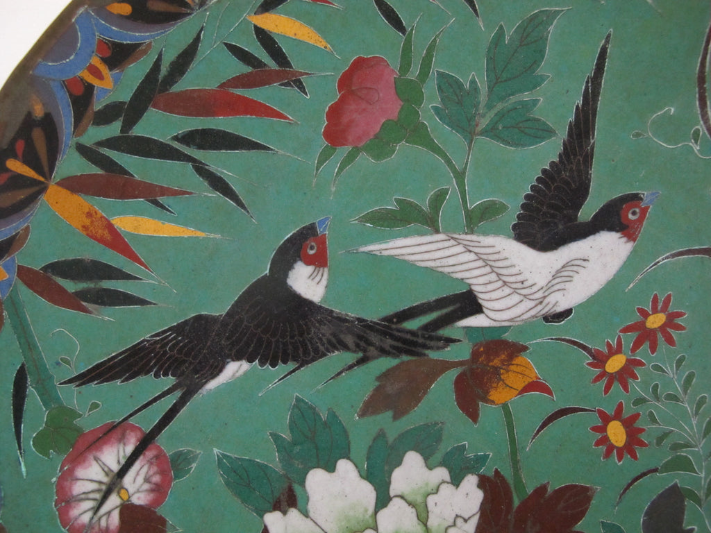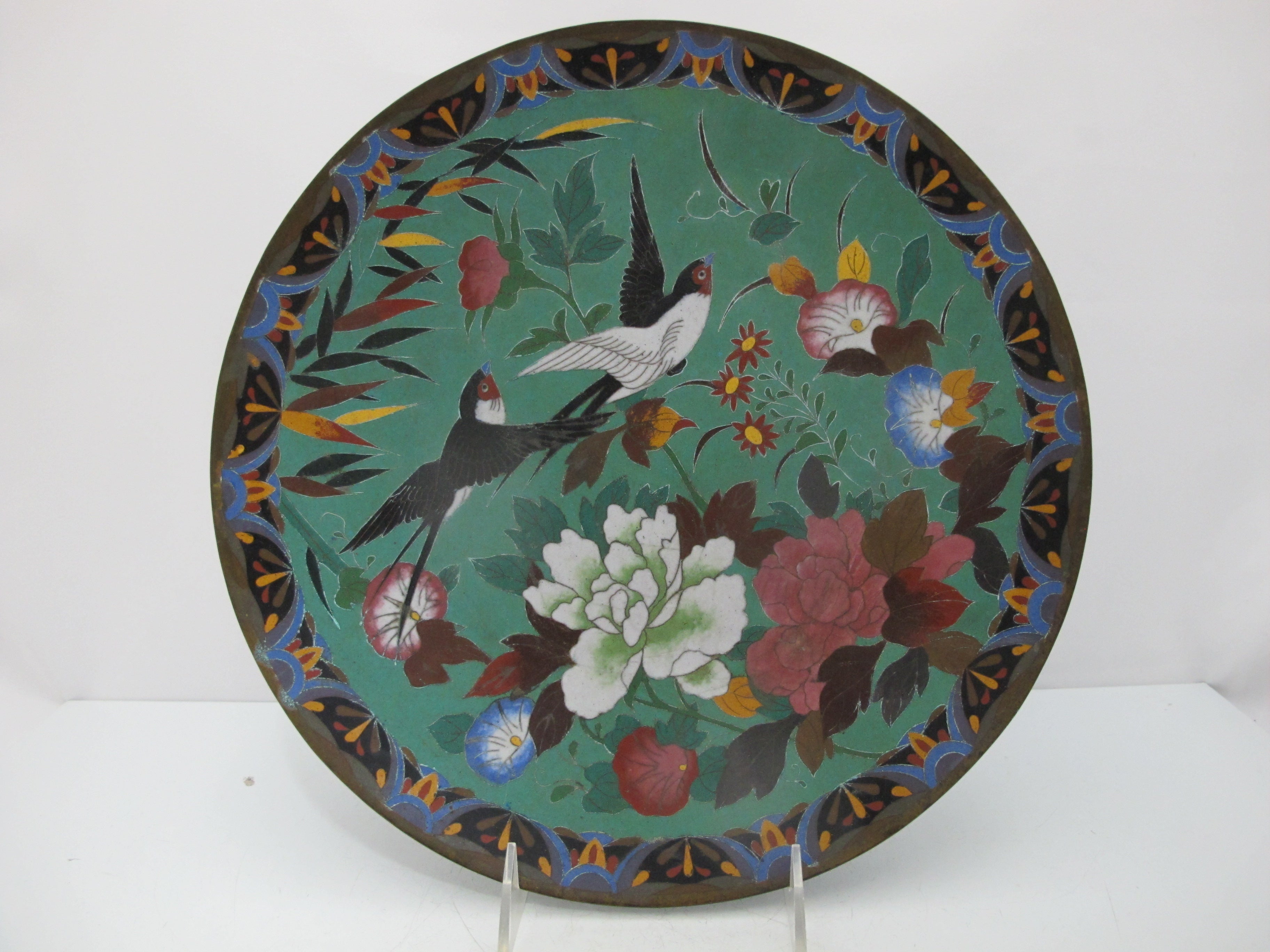 Japanese Meiji era Cloisonne charger plate. Vibrant green background with intricate multi-colored design of 2 birds amongst colorful chrysanthemum flowers and a butterfly border. The base is turquoise with a scrolling spiral design. All bright and lovely. Measures 12" x 1 1/2" tall