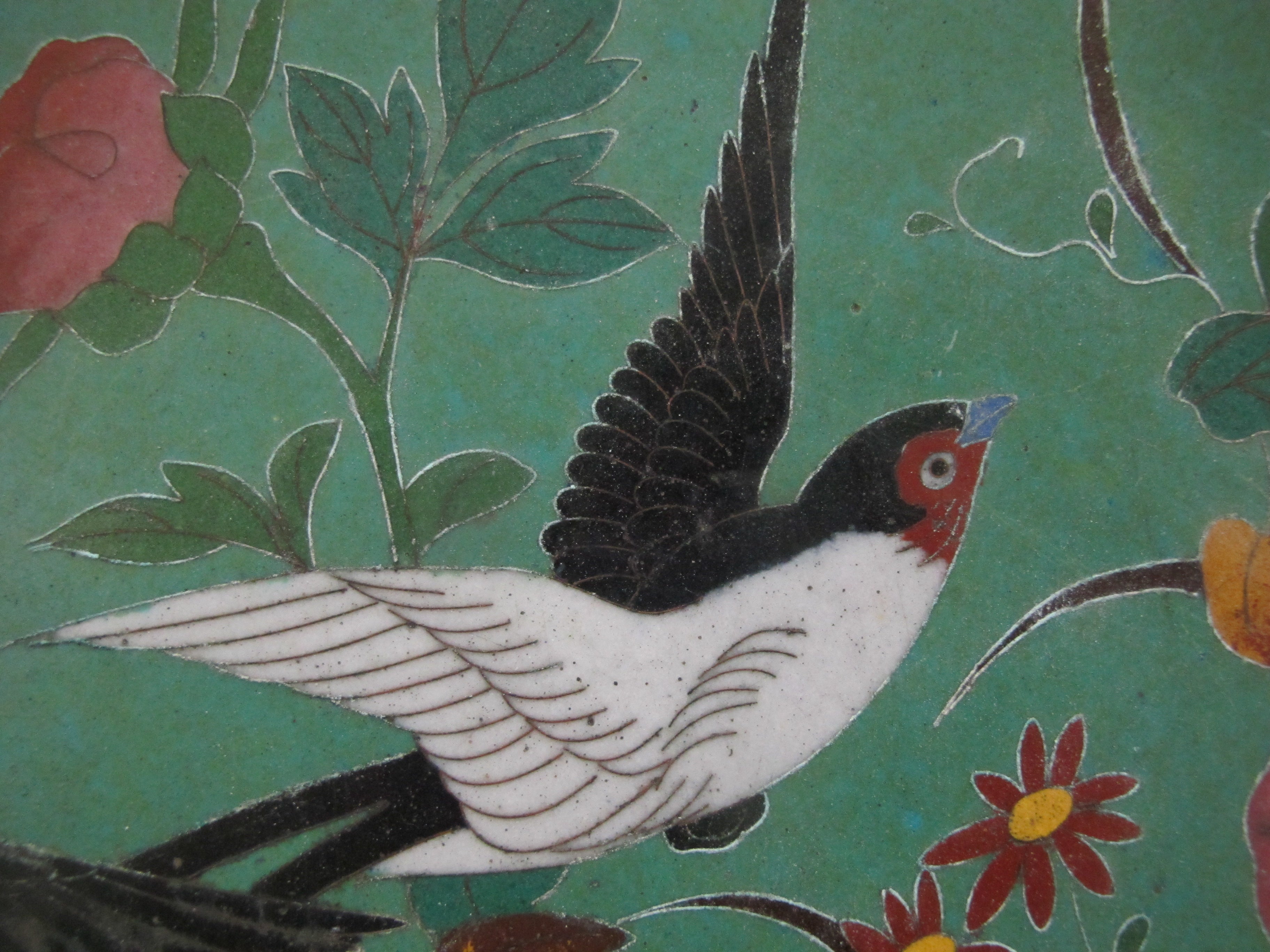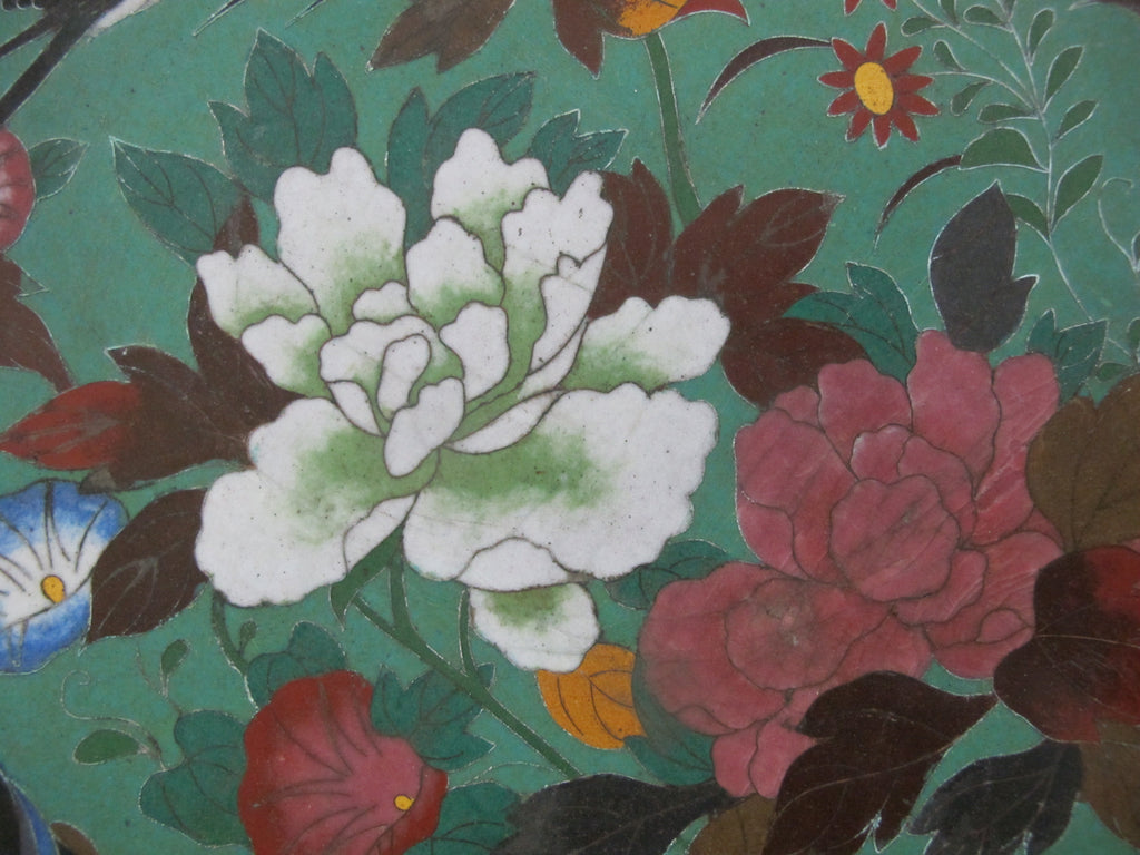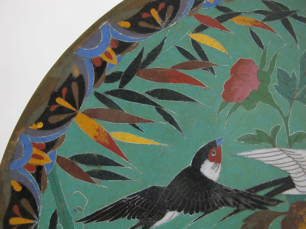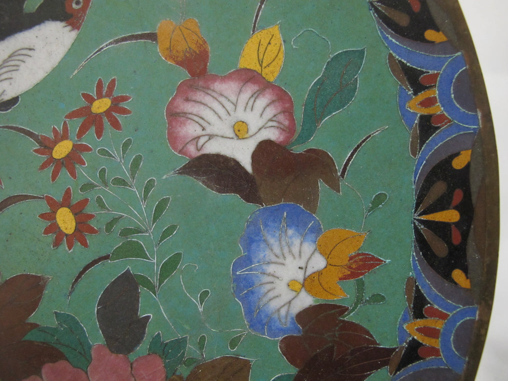 JAPANESE Meiji Green Enamel Bird & Chrysanthemum Flower CLOISONNE Charger Plate