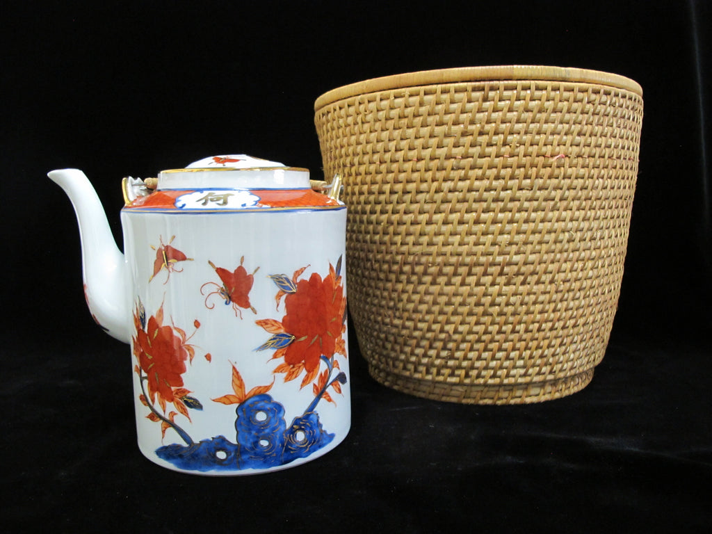 JAPANESE Imari Porcelain FLOWER Teapot with BAMBOO Handle & Travel Basket
