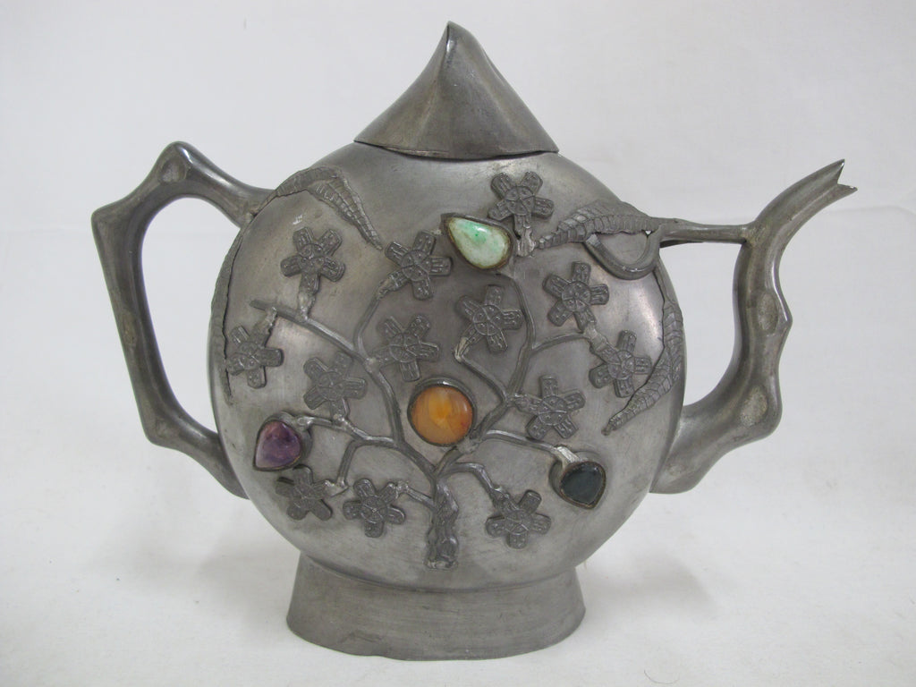Ornate CHINESE Pewter Teapot with Raised GEMSTONE Flowers & Serpentine Spout
