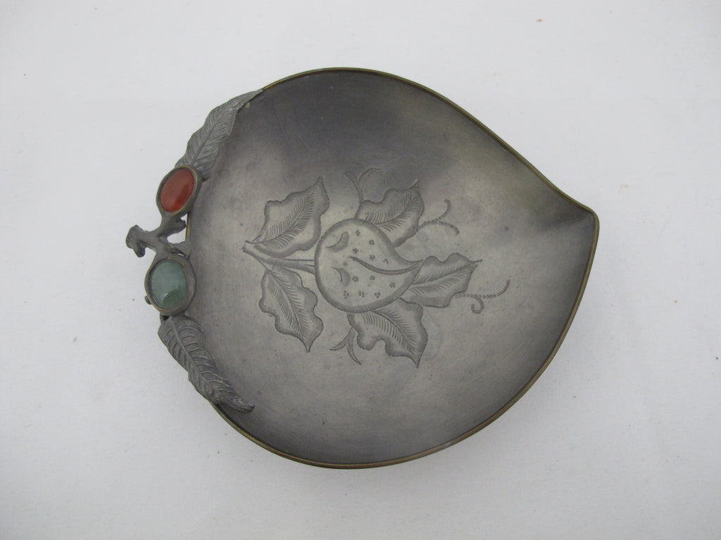 Antique CHINESE Engraved Pewter Fruit STRAWBERRY Dish Tray Inlaid with Gemstones