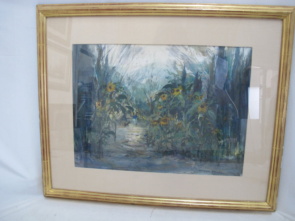 FRANK Leonard BROOKS Signed Gilt Frame SUNFLOWER & 2 Figures WATERCOLOR Painting
