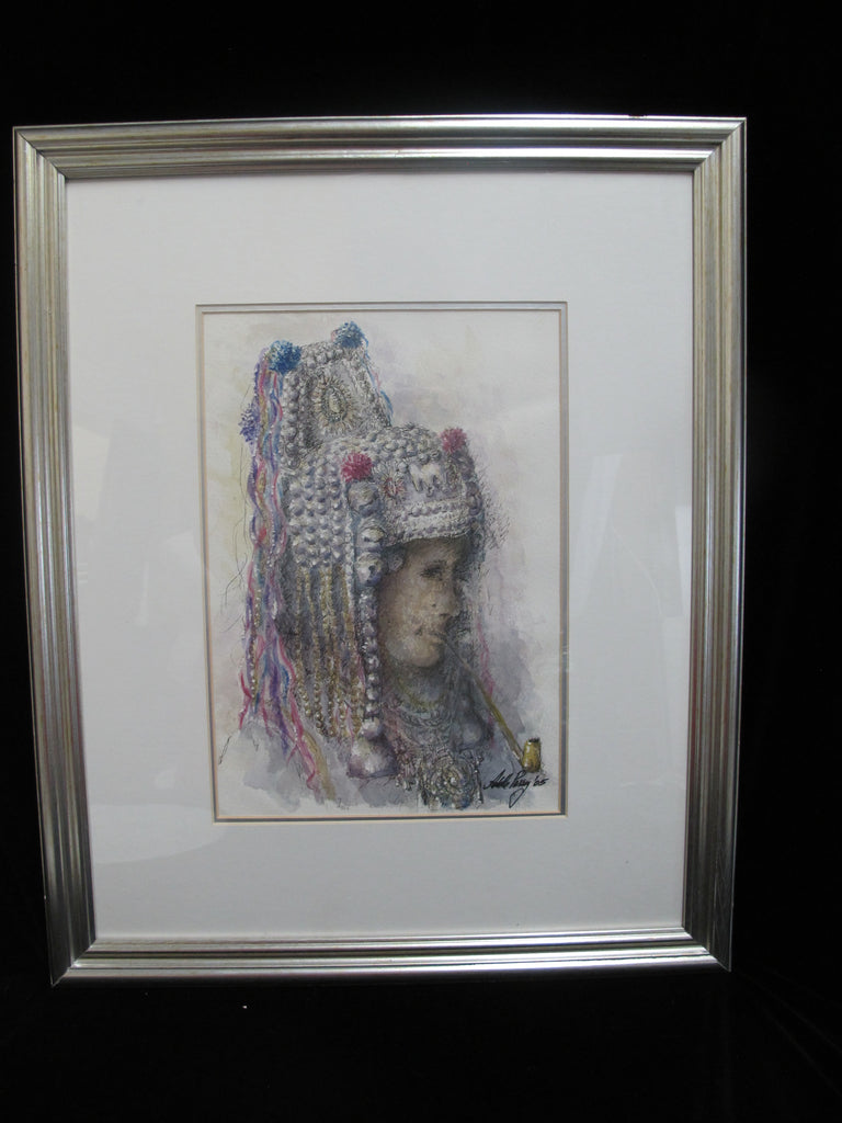 ADELE PERRY Ink Watercolor Painting Elaborate Headdress LADY Smoking AKHA Style