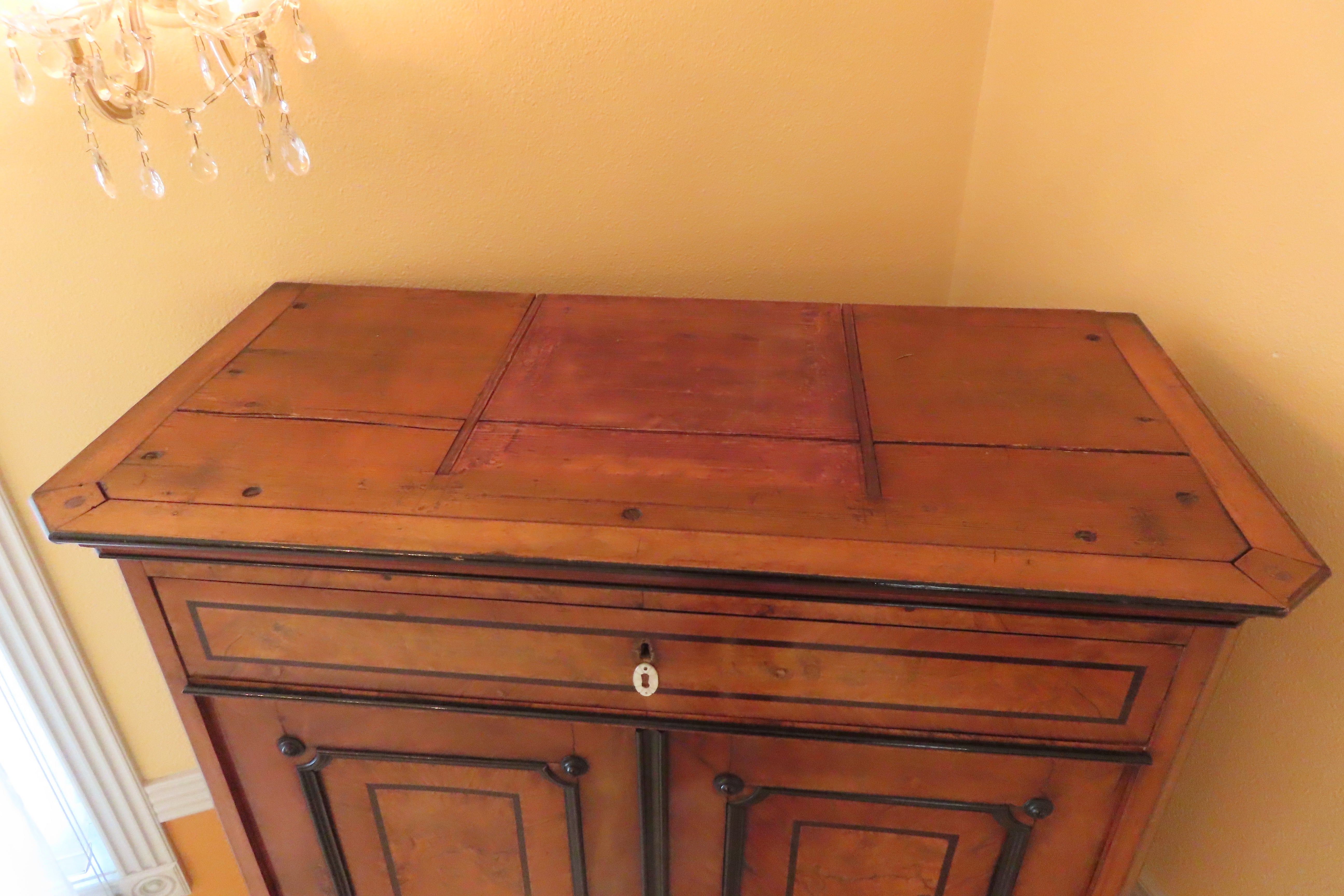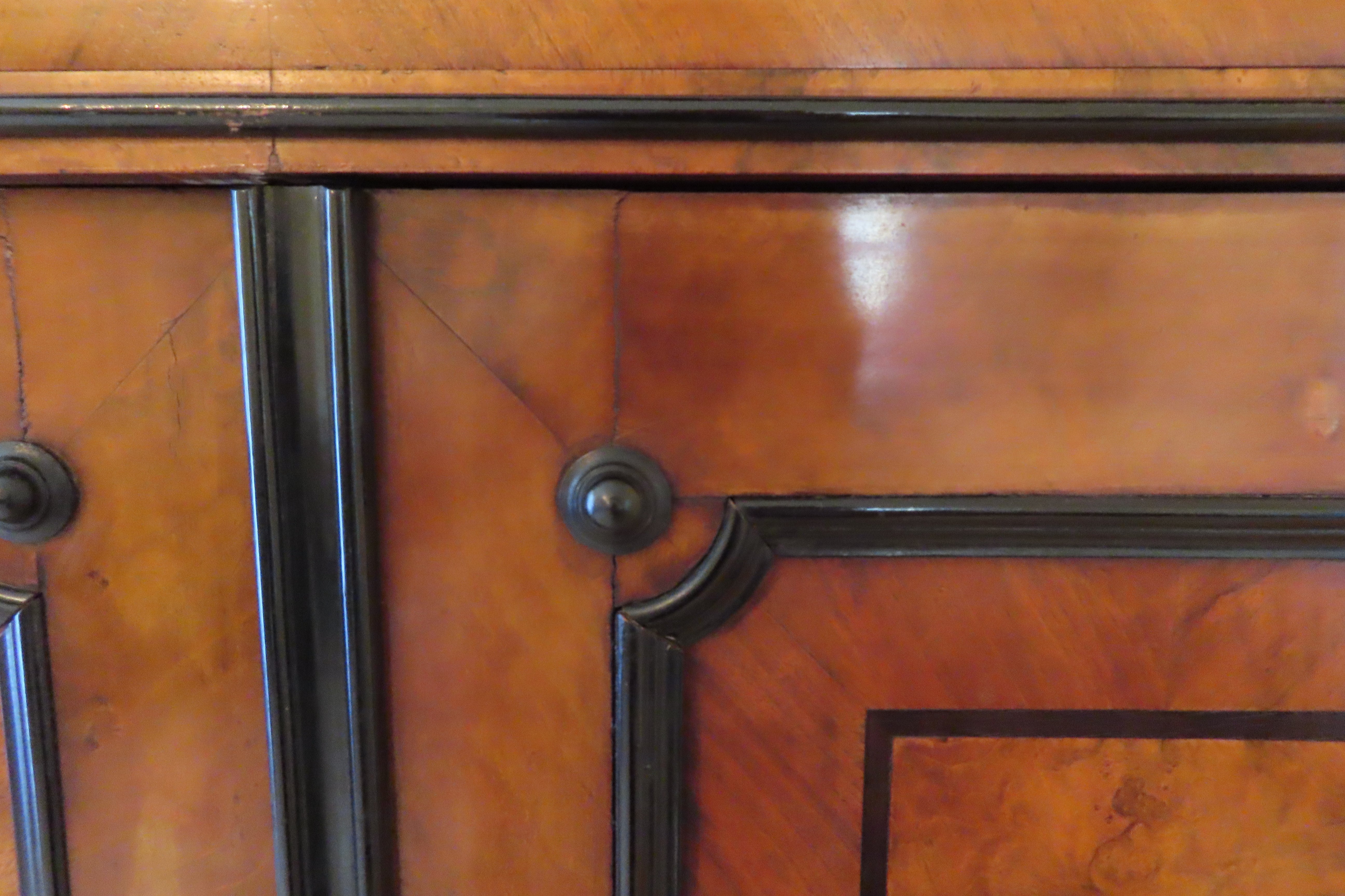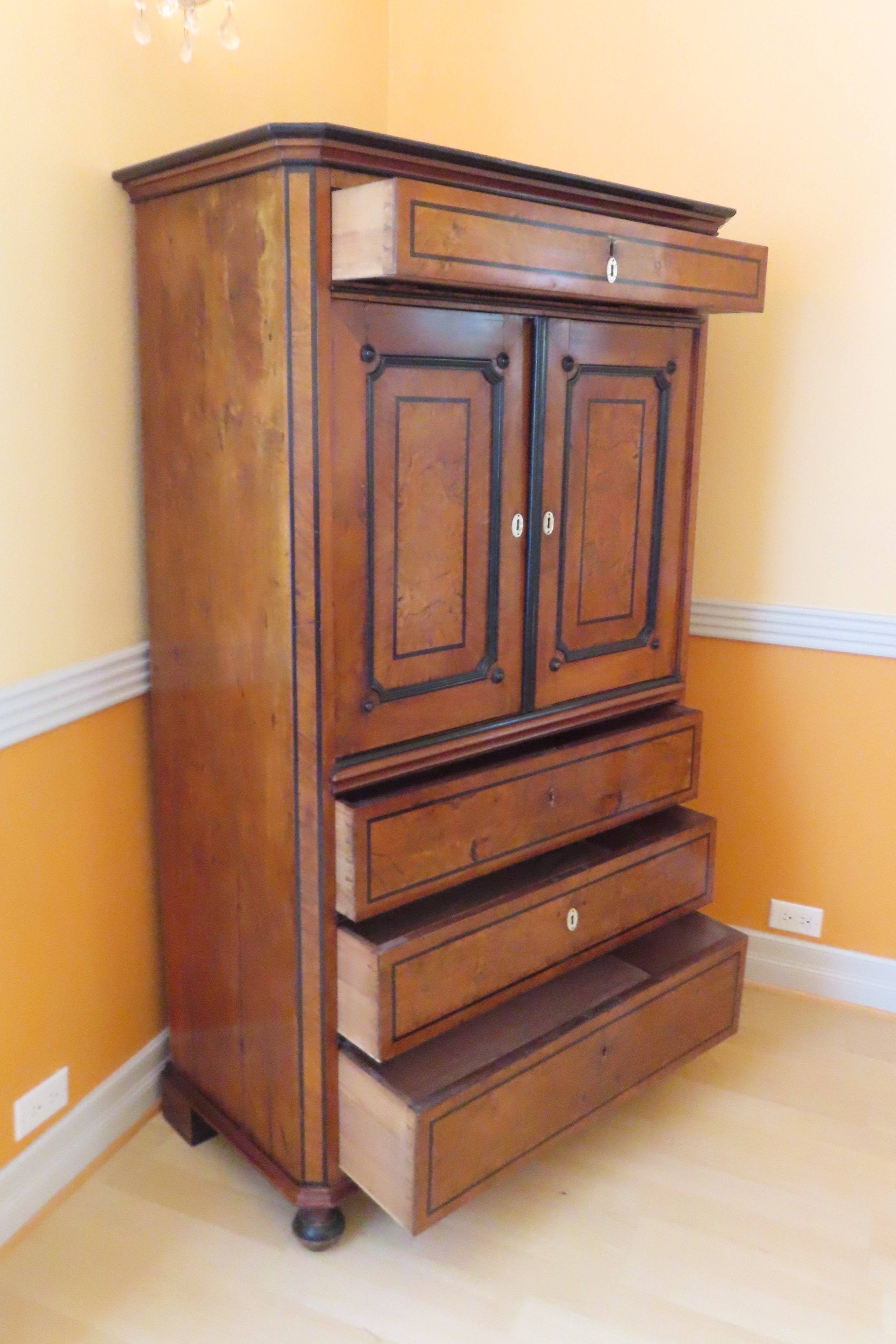 Beautiful antique German Biedermeier silver cabinet from the 19th century. Simple and geometric design. Large cabinet with full length drawer across the top, compartment with swinging doors at arms height and three slightly larger, equally sized, full length drawers on the bottom. Each door and drawer has a key hole with mother of pearl escutcheons. All locks use the same key, which is included in a smaller drawer located inside the compartment doors. Three of the escutcheons are missing or not secured properly, but there are 6 extra ones included in the drawer with the key. Butterfly joining's on the drawers. Compartment is painted in black lacquer and has storage for serving utensils. Burl wood accent panels on the front.