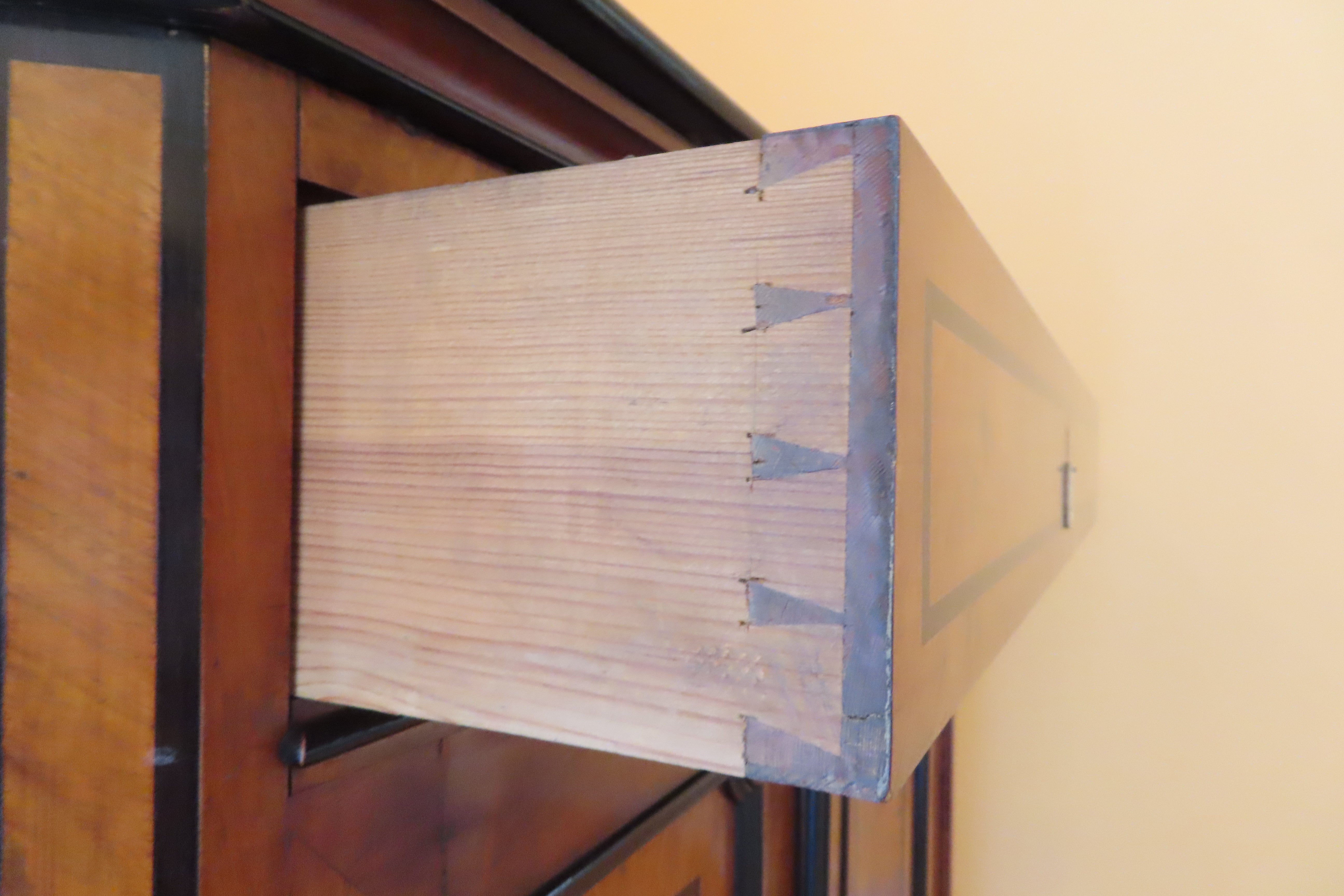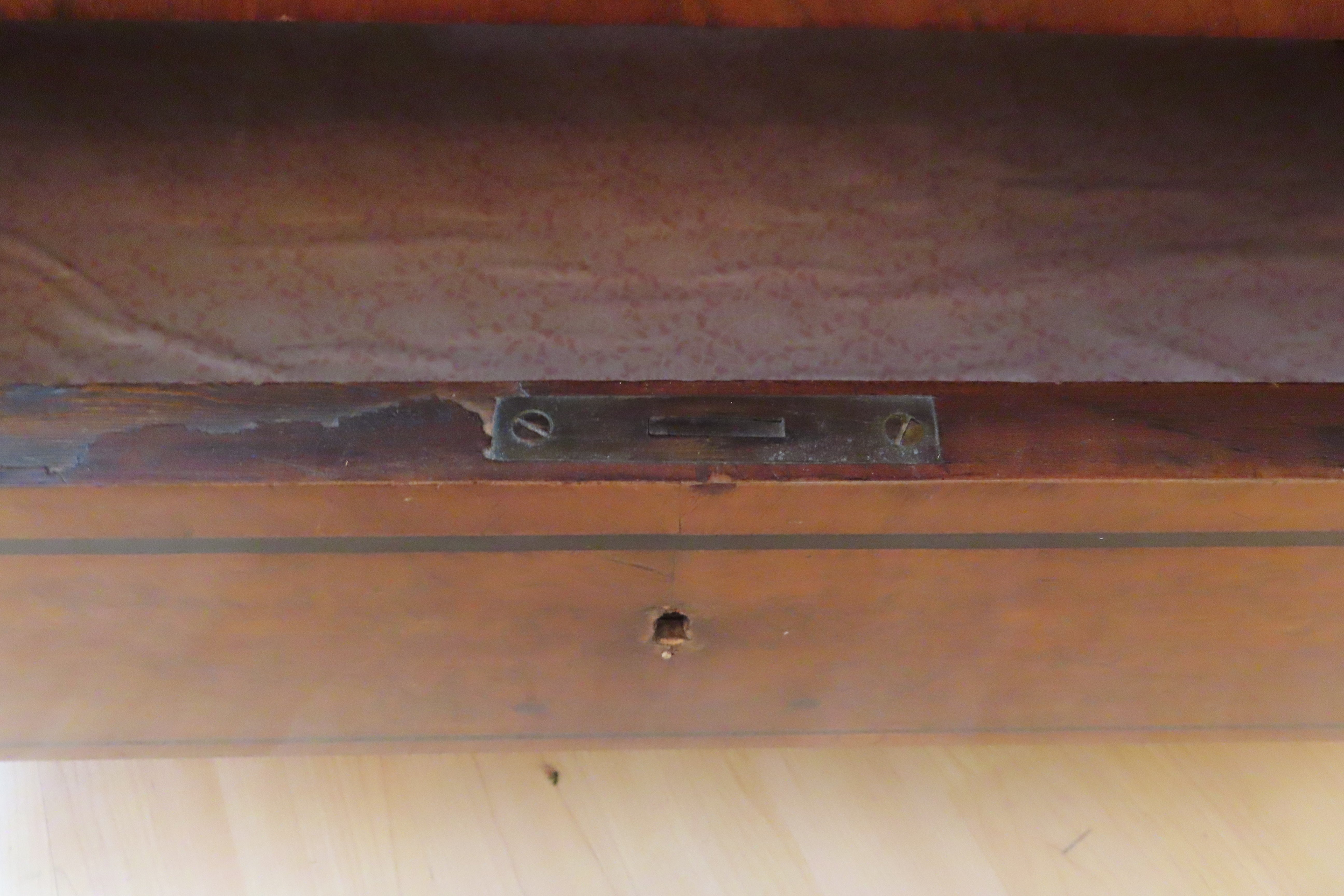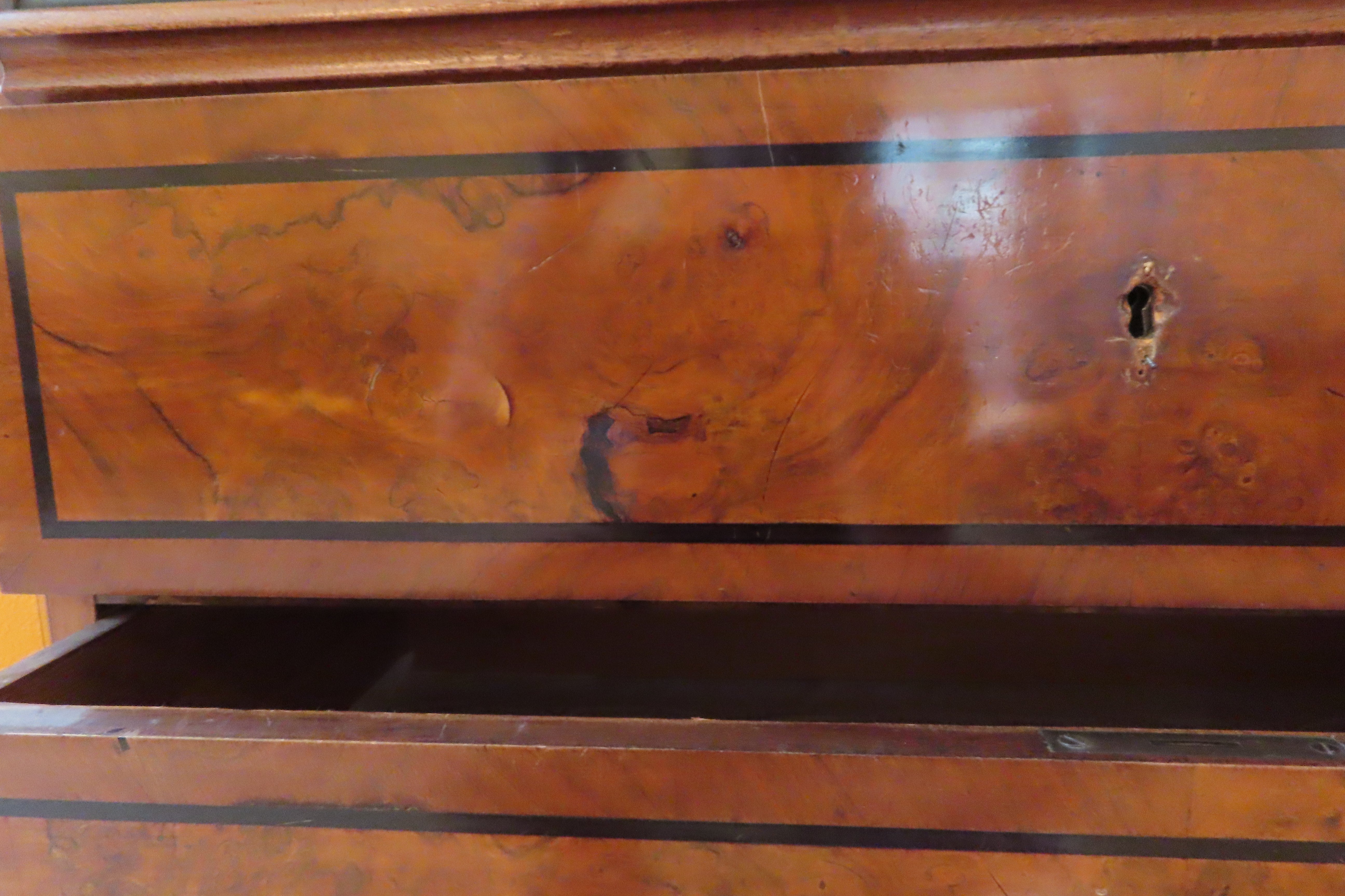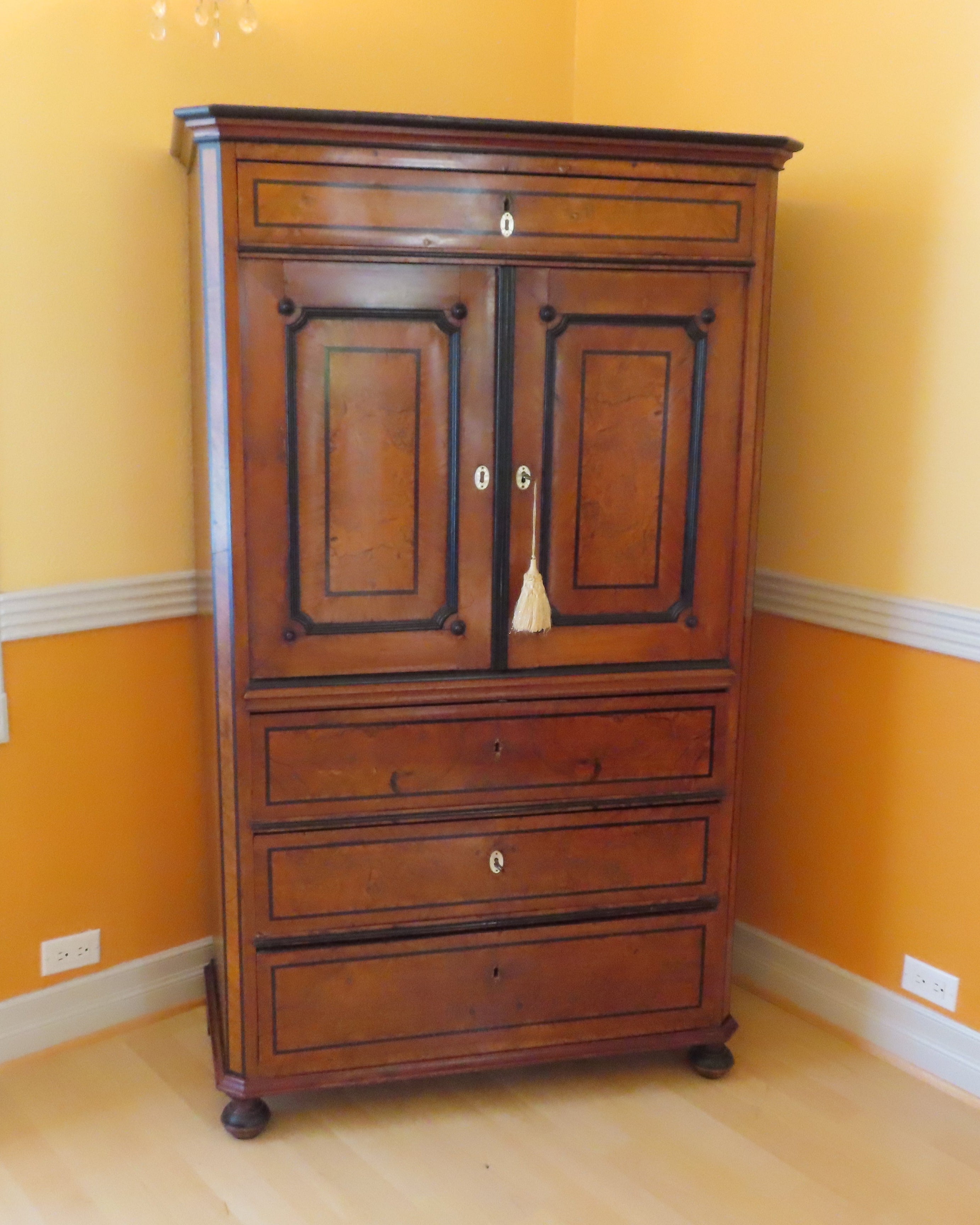 Beautiful antique German Biedermeier silver cabinet from the 19th century. Simple and geometric design. Large cabinet with full length drawer across the top, compartment with swinging doors at arms height and three slightly larger, equally sized, full length drawers on the bottom. Each door and drawer has a key hole with mother of pearl escutcheons. All locks use the same key, which is included in a smaller drawer located inside the compartment doors. Three of the escutcheons are missing or not secured properly, but there are 6 extra ones included in the drawer with the key. Butterfly joining's on the drawers. Compartment is painted in black lacquer and has storage for serving utensils. Burl wood accent panels on the front.