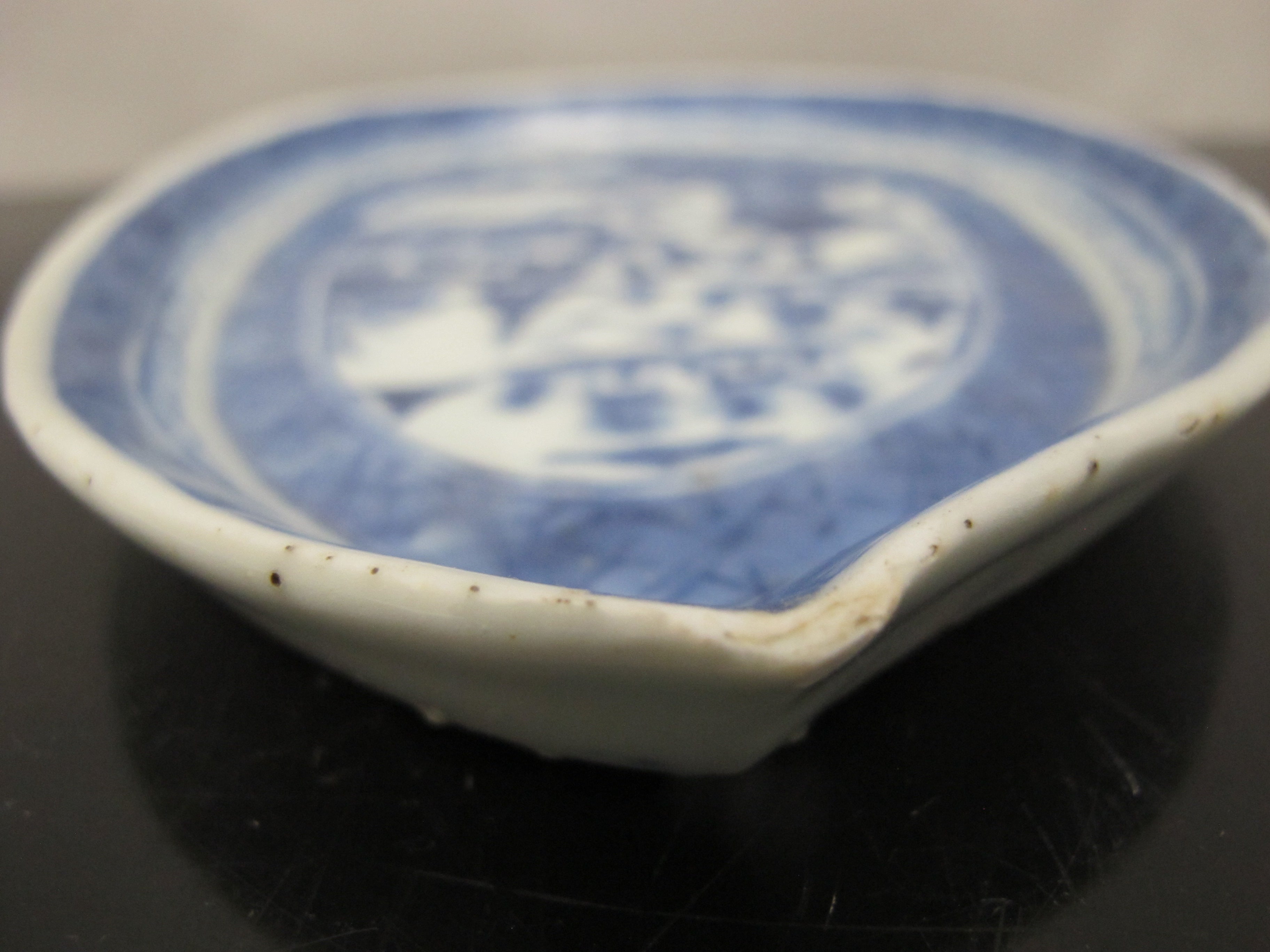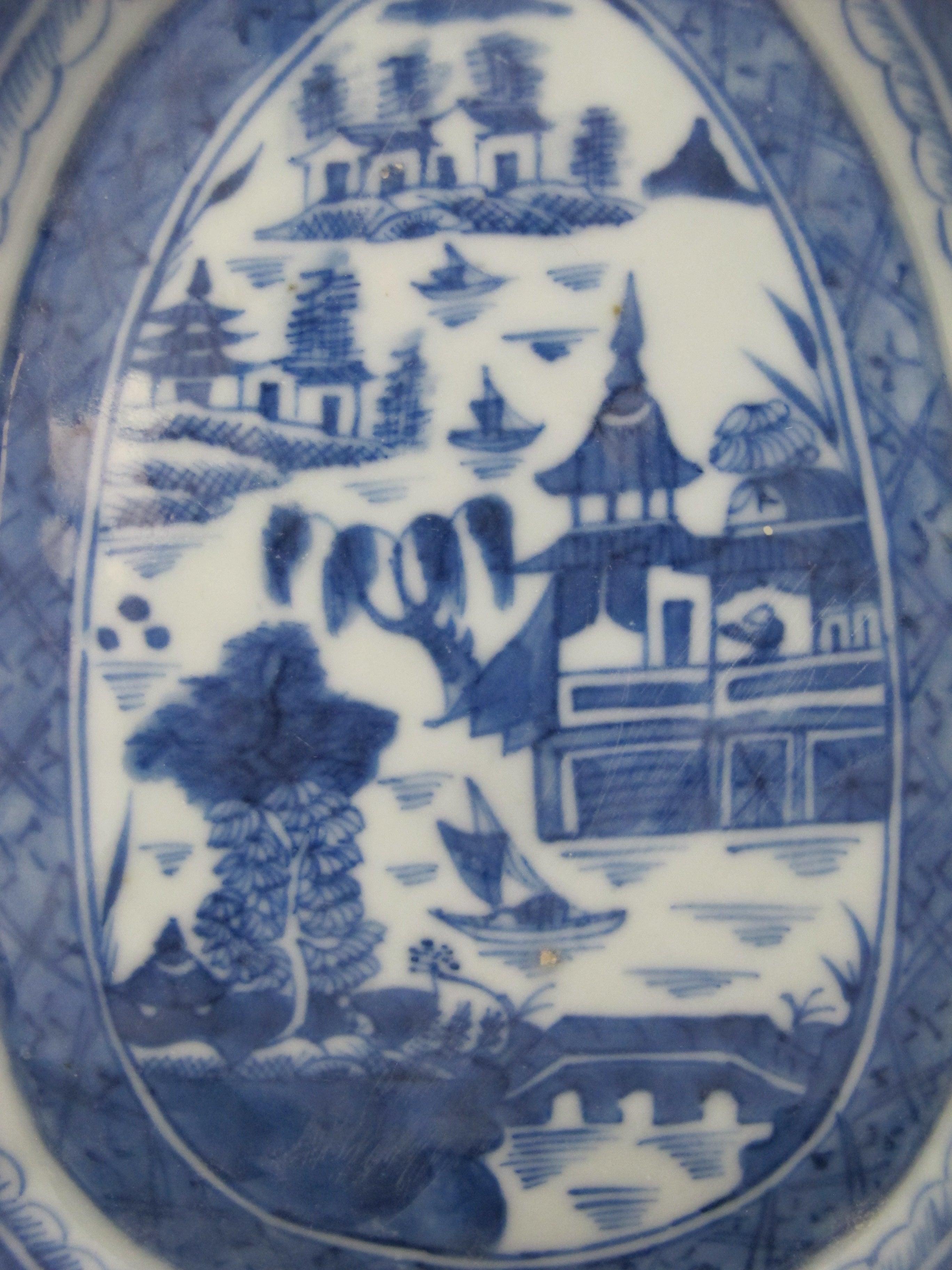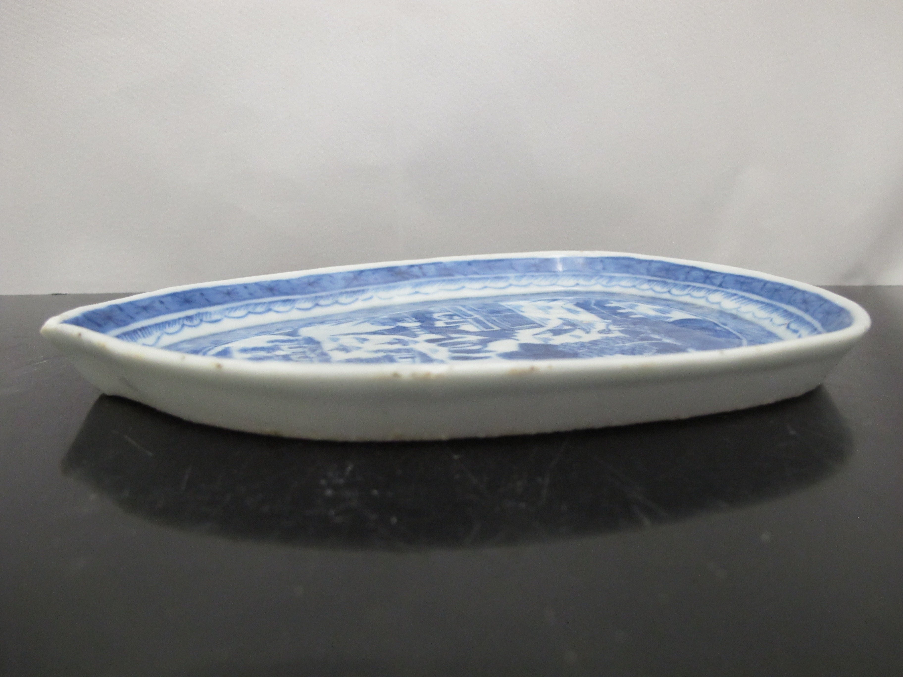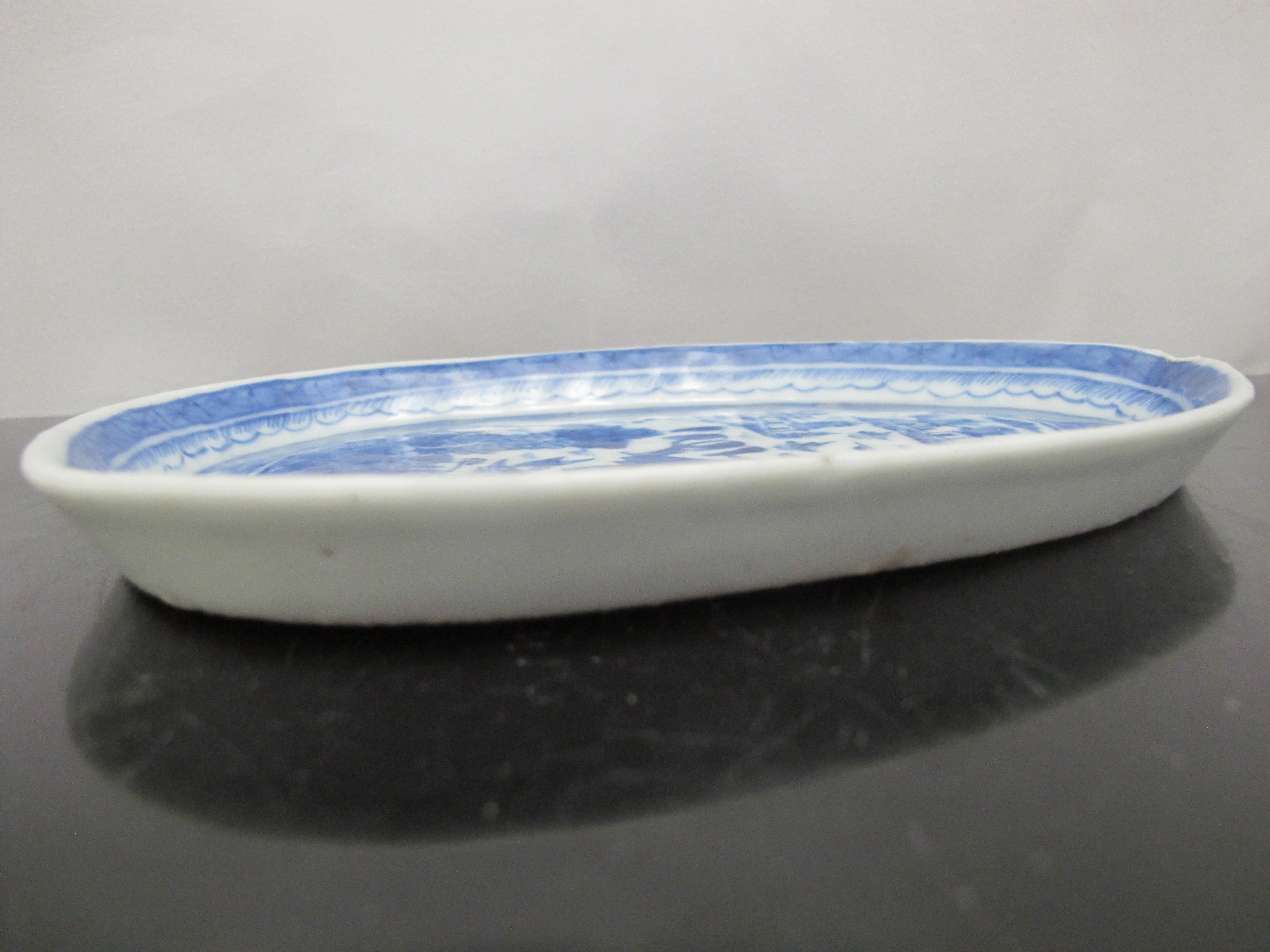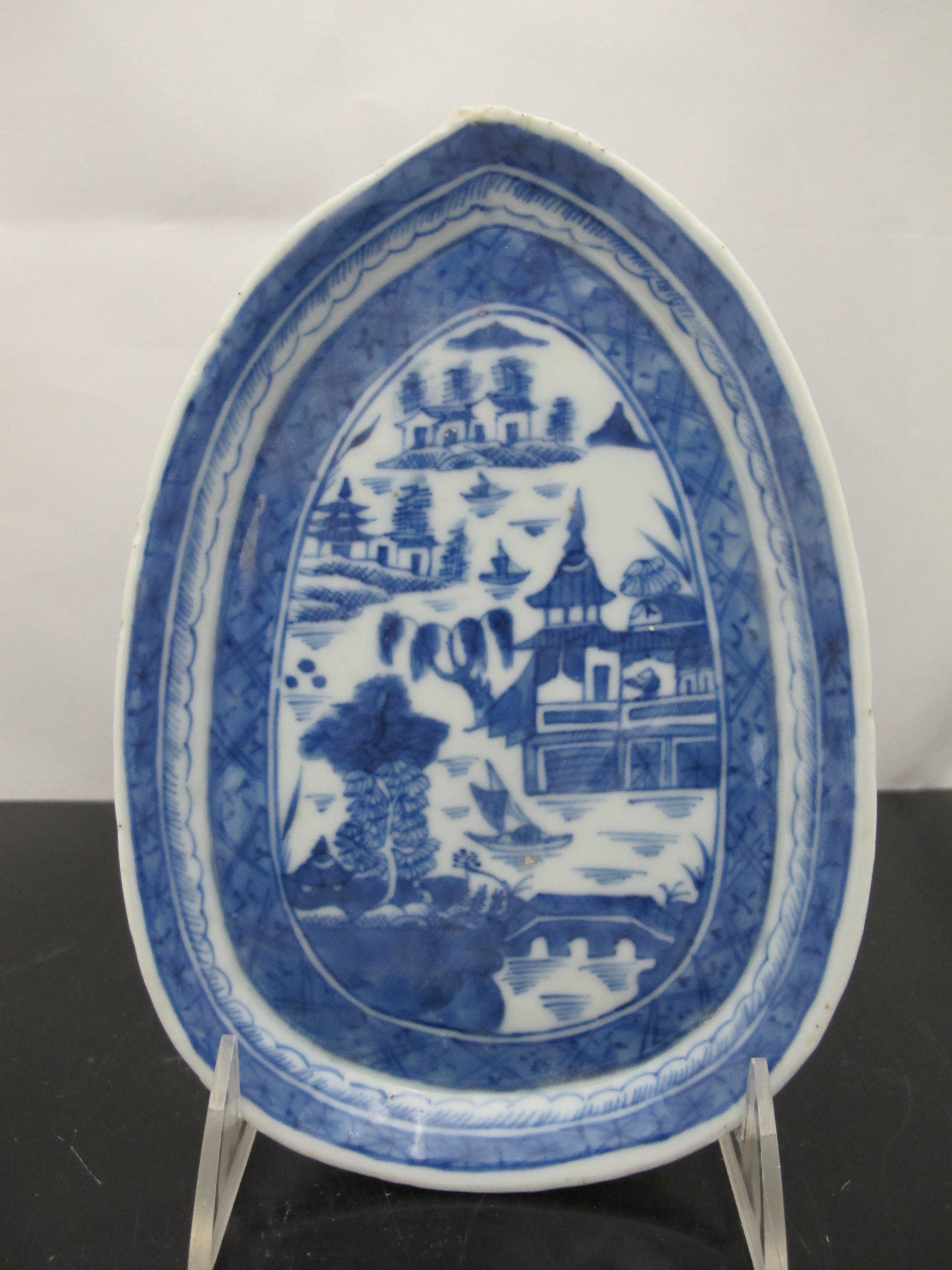 Antique Chinese CANTON Blue & White Porcelain Village LEAF Teardrop Dish Tray