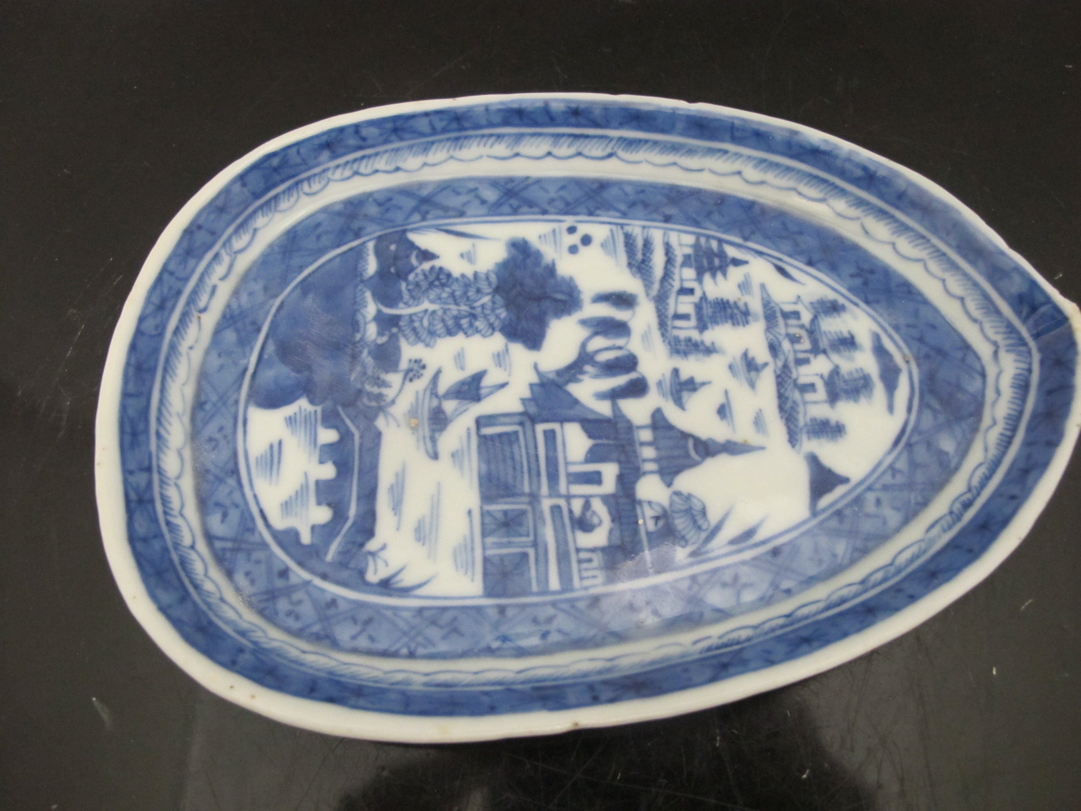 Chinese Canton blue porcelain tray. Leaf or teardrop shaped showing a village landscape scene. Measures 7 1/2" x 5 1/4" x1/2".