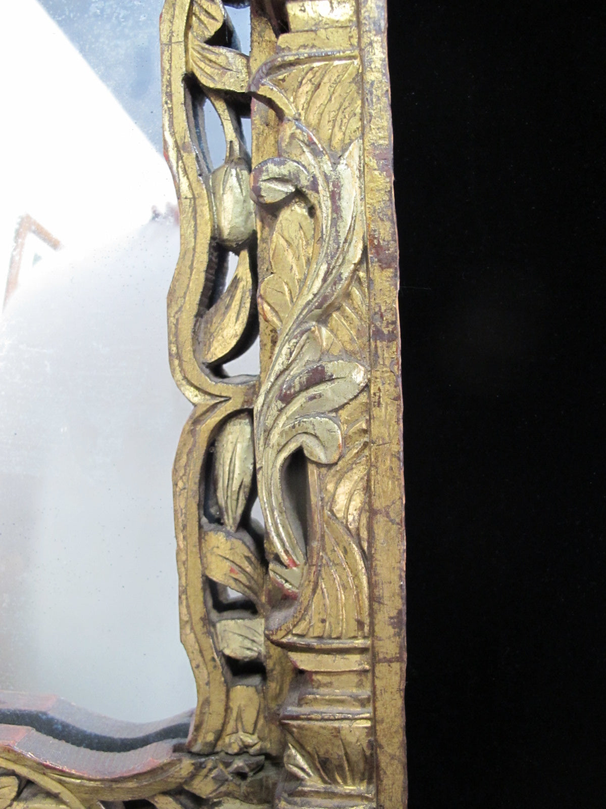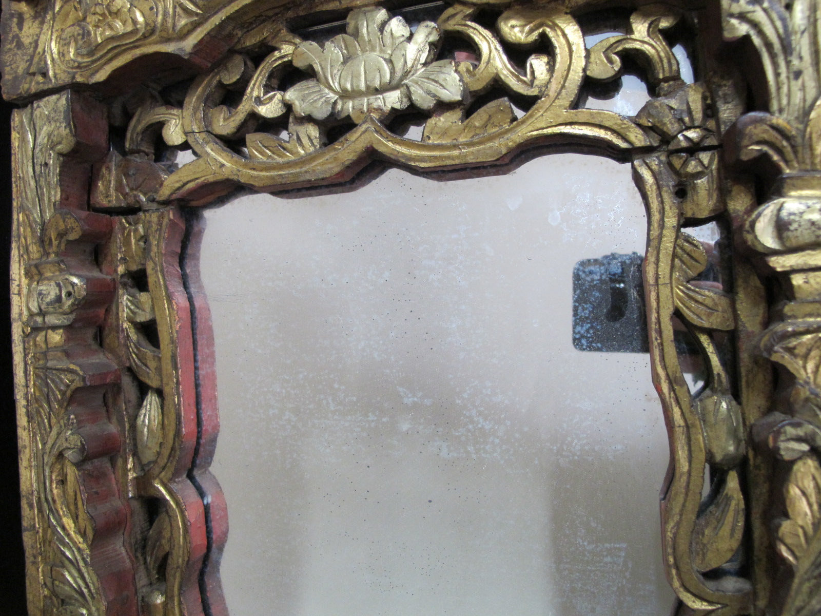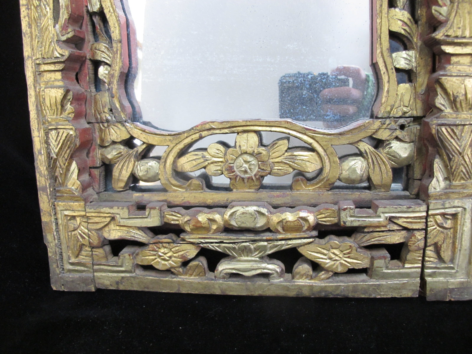 Divine Chinese, 19th century wall mirror. Extensive, ornate carvings of lotus flowers, foliage, and decorative motifs in red with gilt accent.