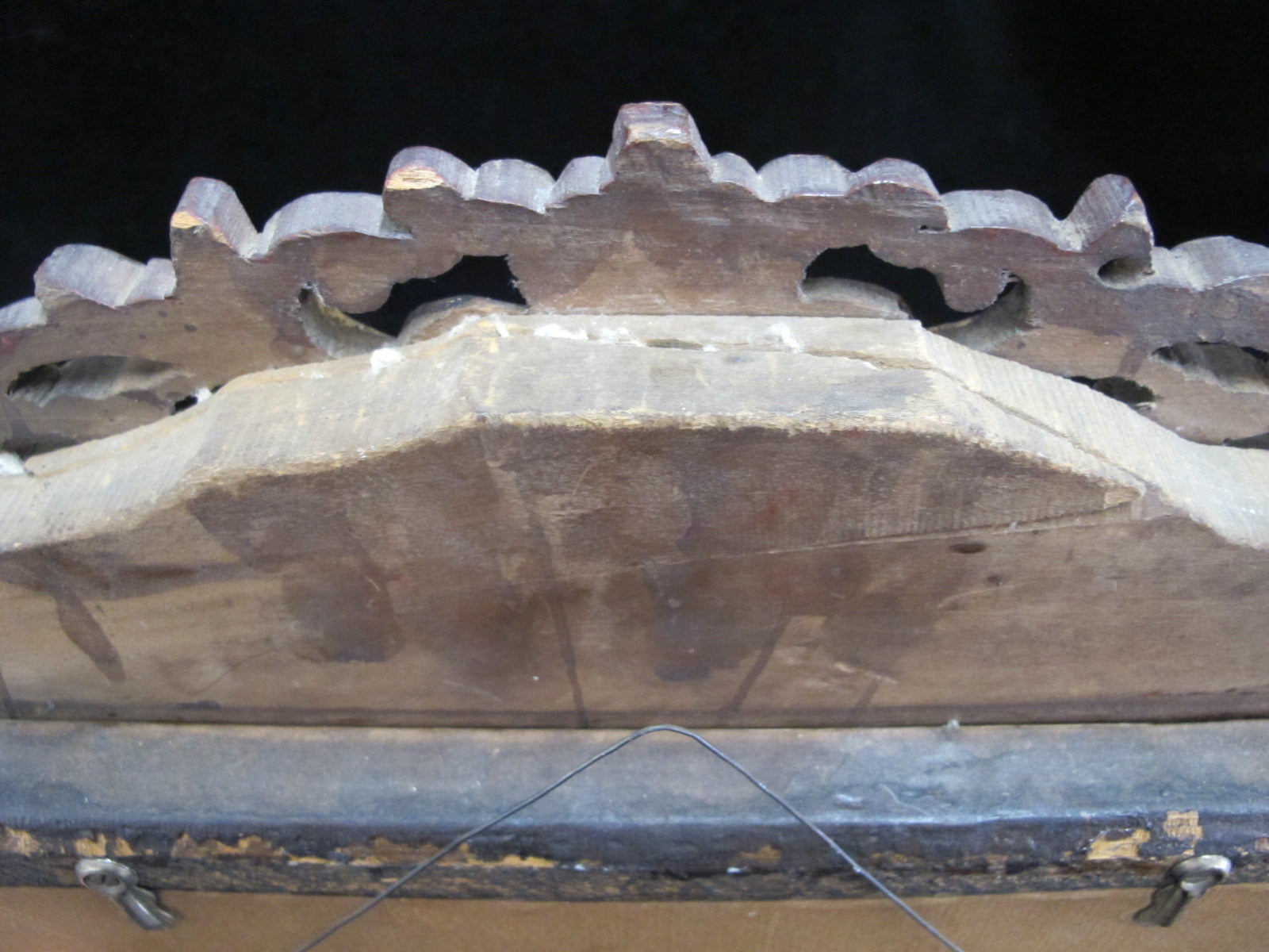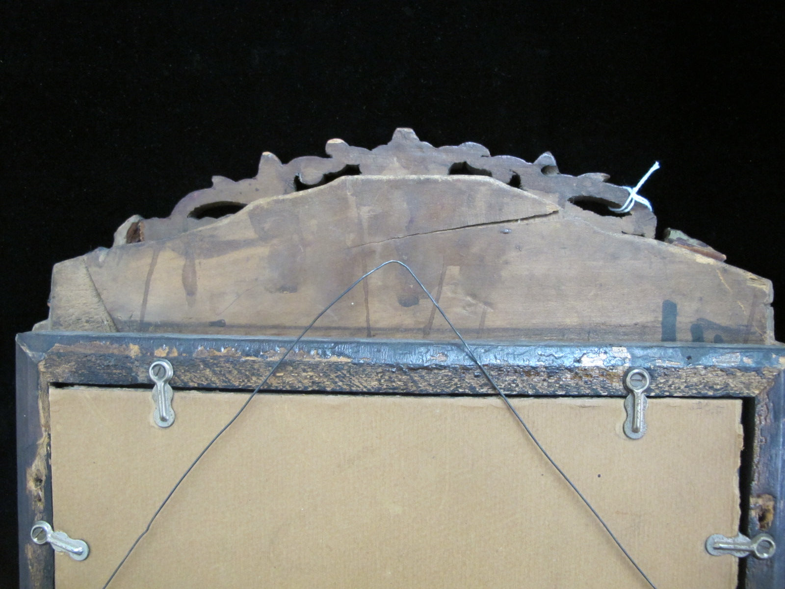 Excellent condition for age, some cracks in wood, but sturdy and no significant damage. Mirror is clear, but shows spotting.