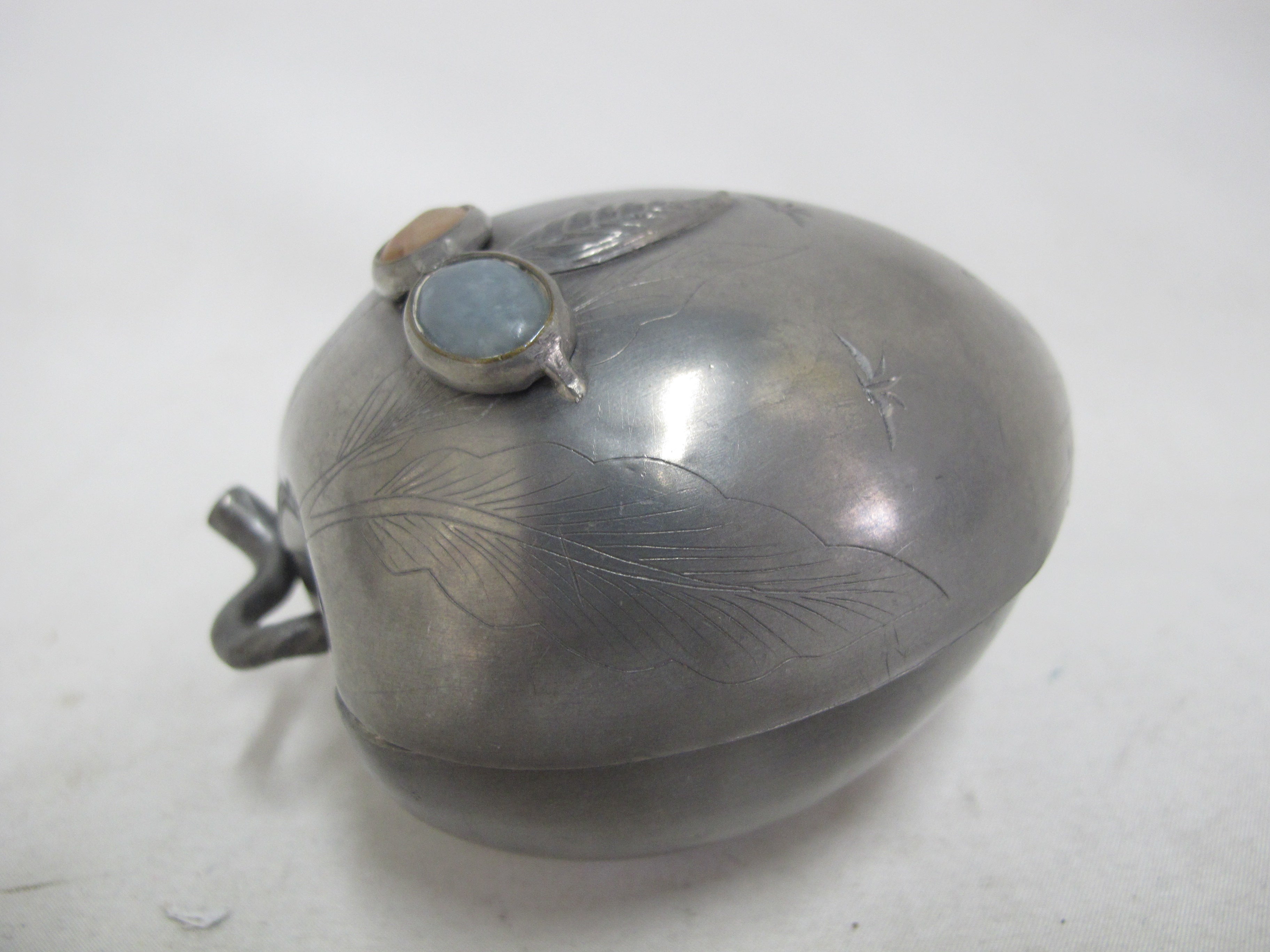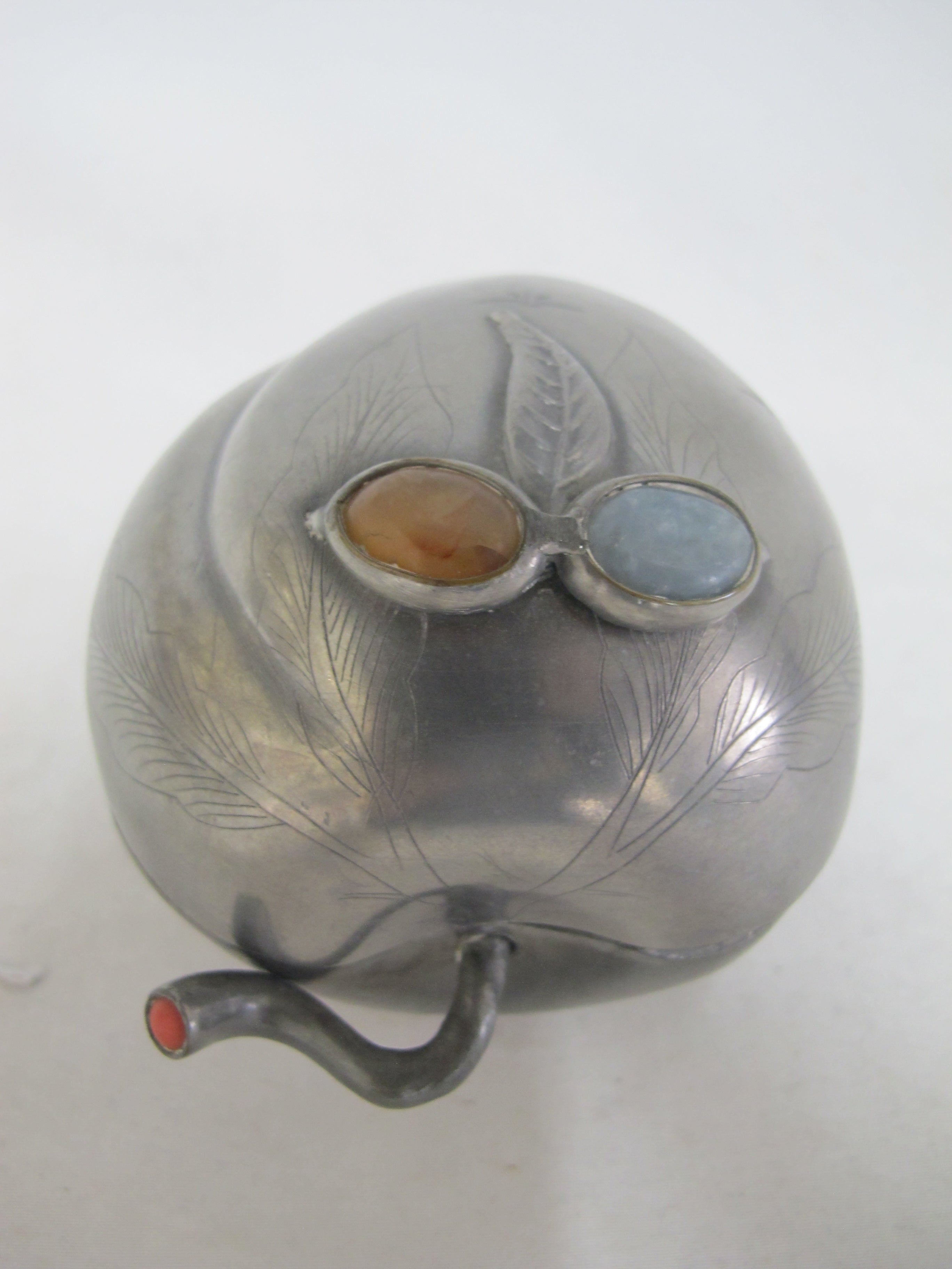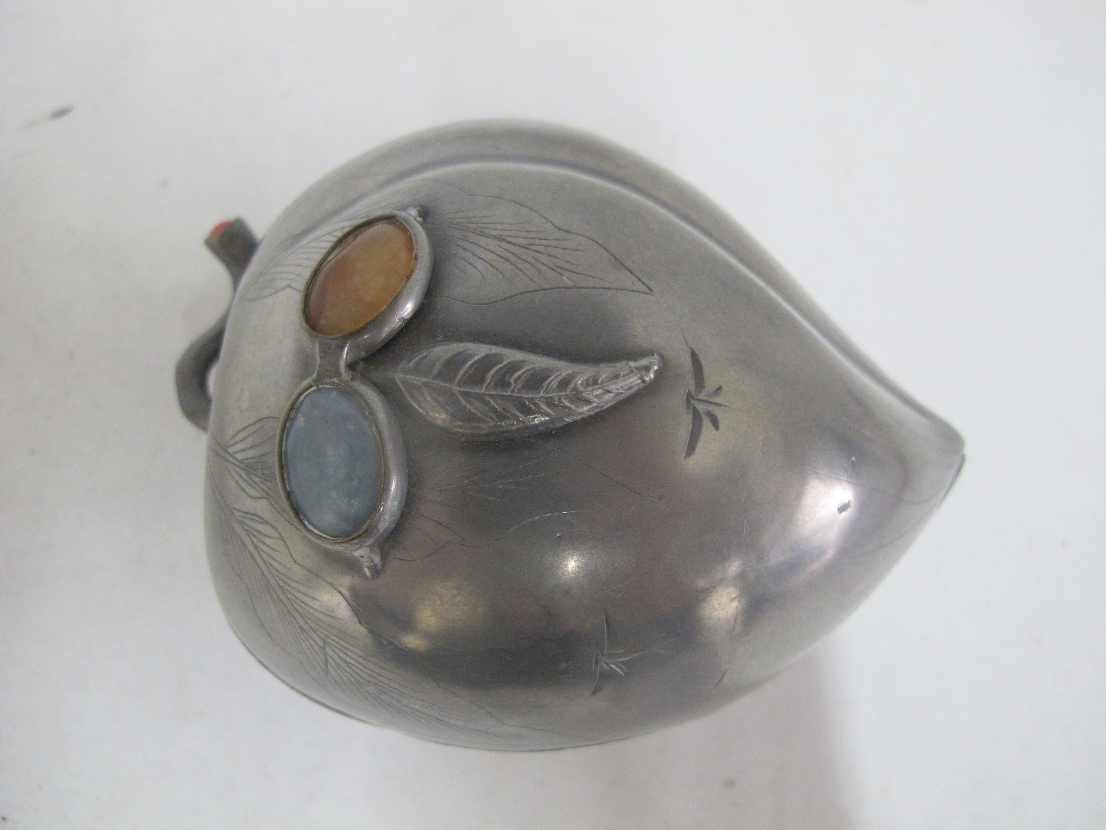 Small Antique Chinese box with lid. Peach form in pewter with inlaid semi-precious gemstone flowers and raised leaves with engravings.