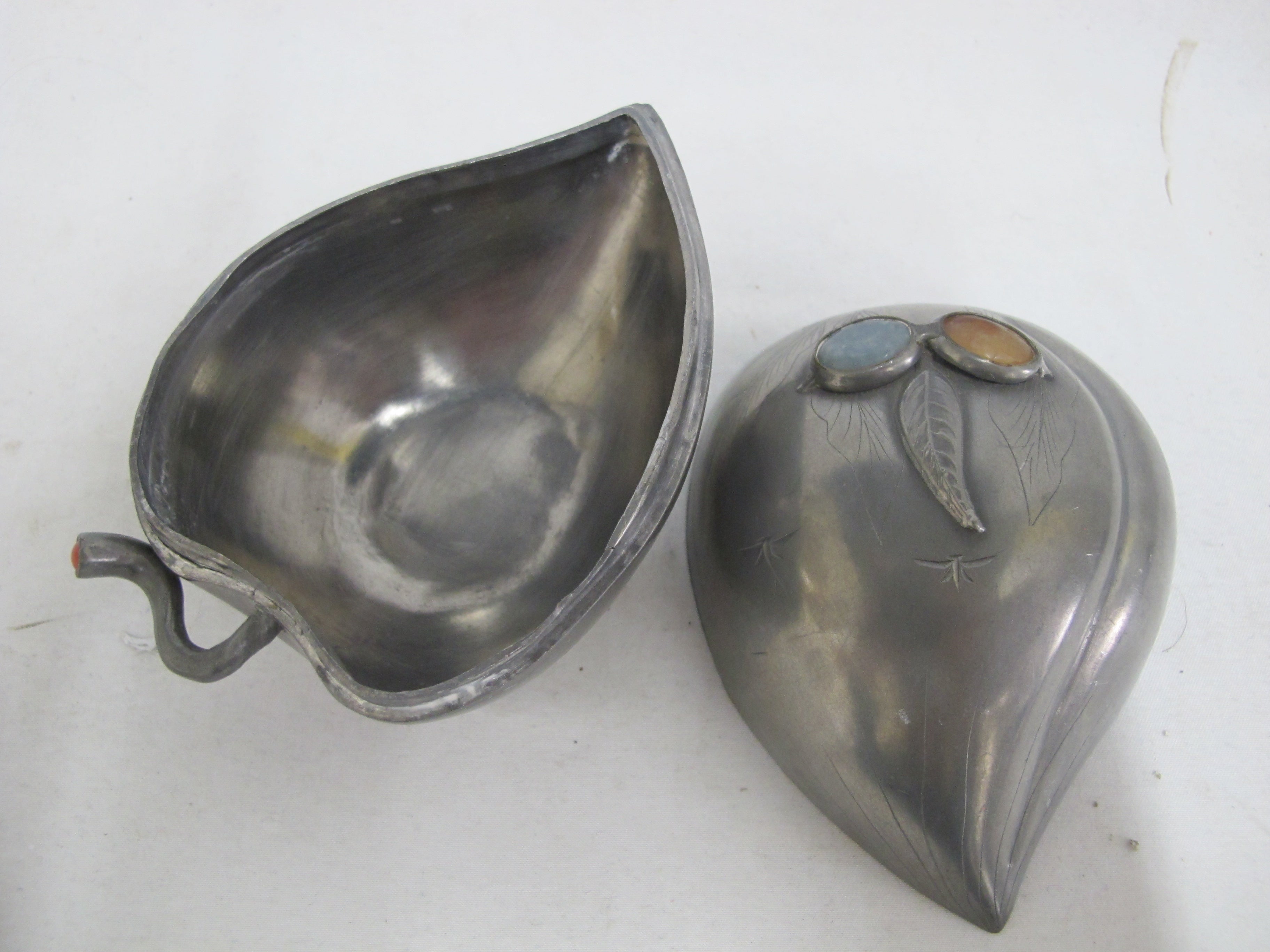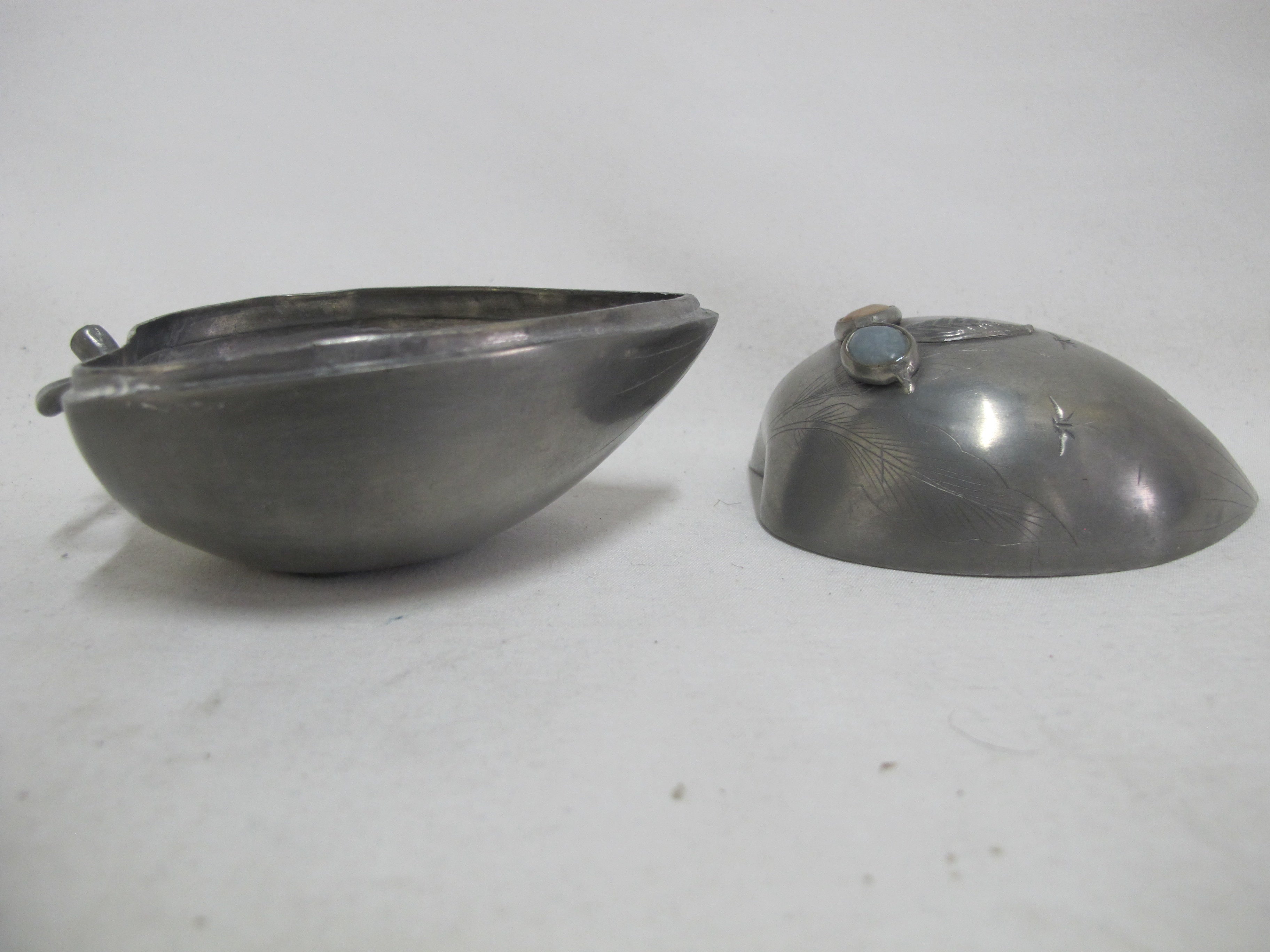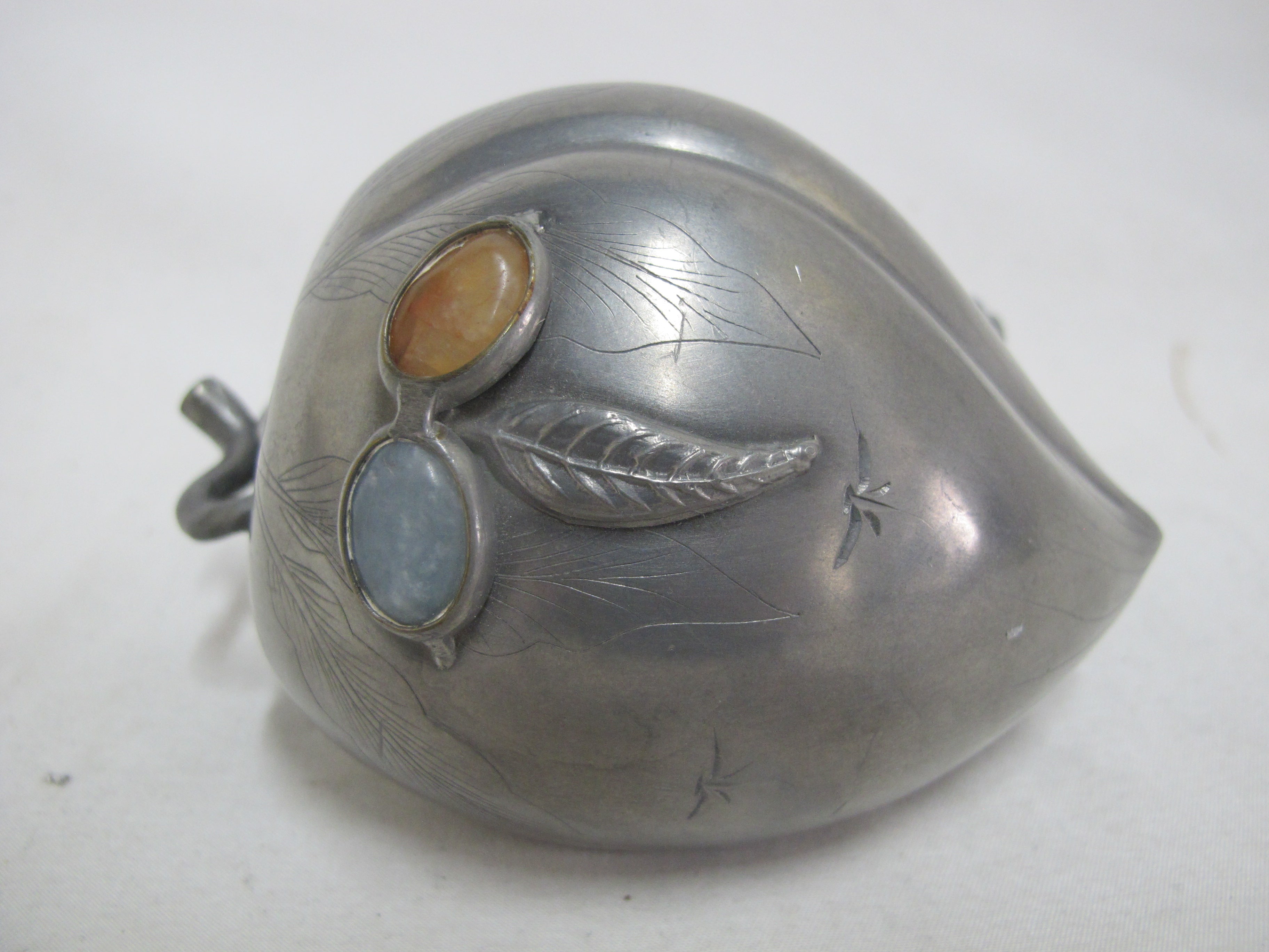 Small Antique Chinese box with lid. Peach form in pewter with inlaid semi-precious gemstone flowers and raised leaves with engravings.