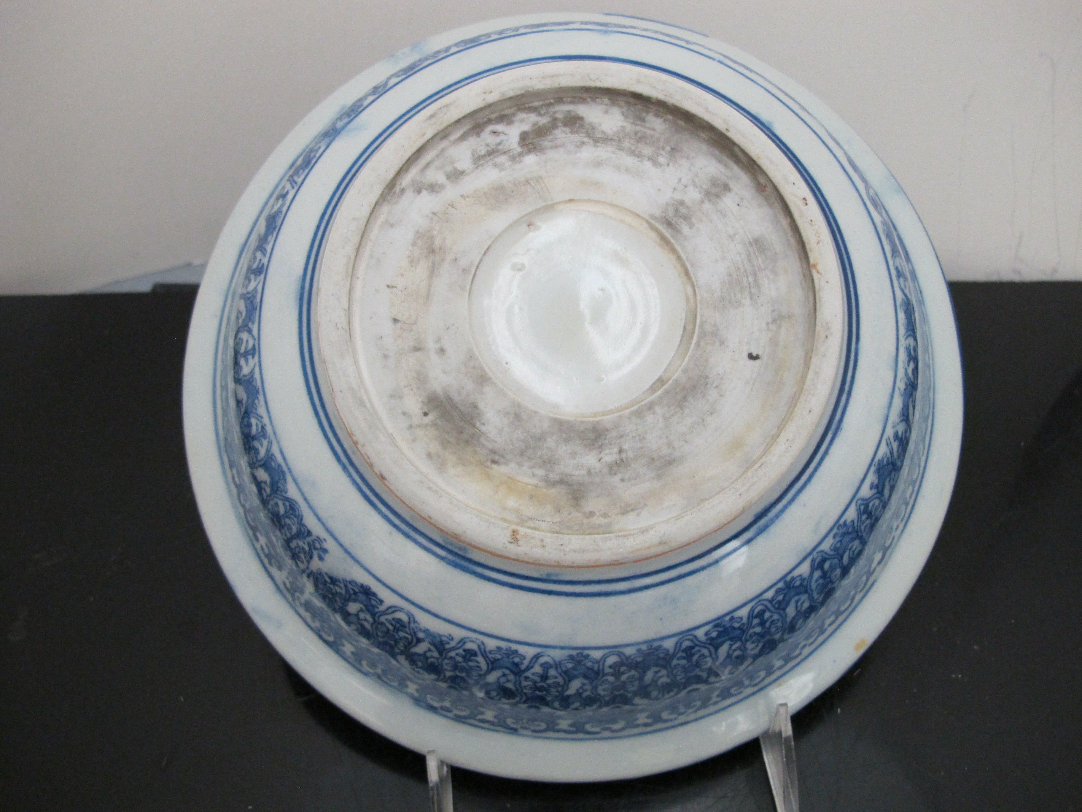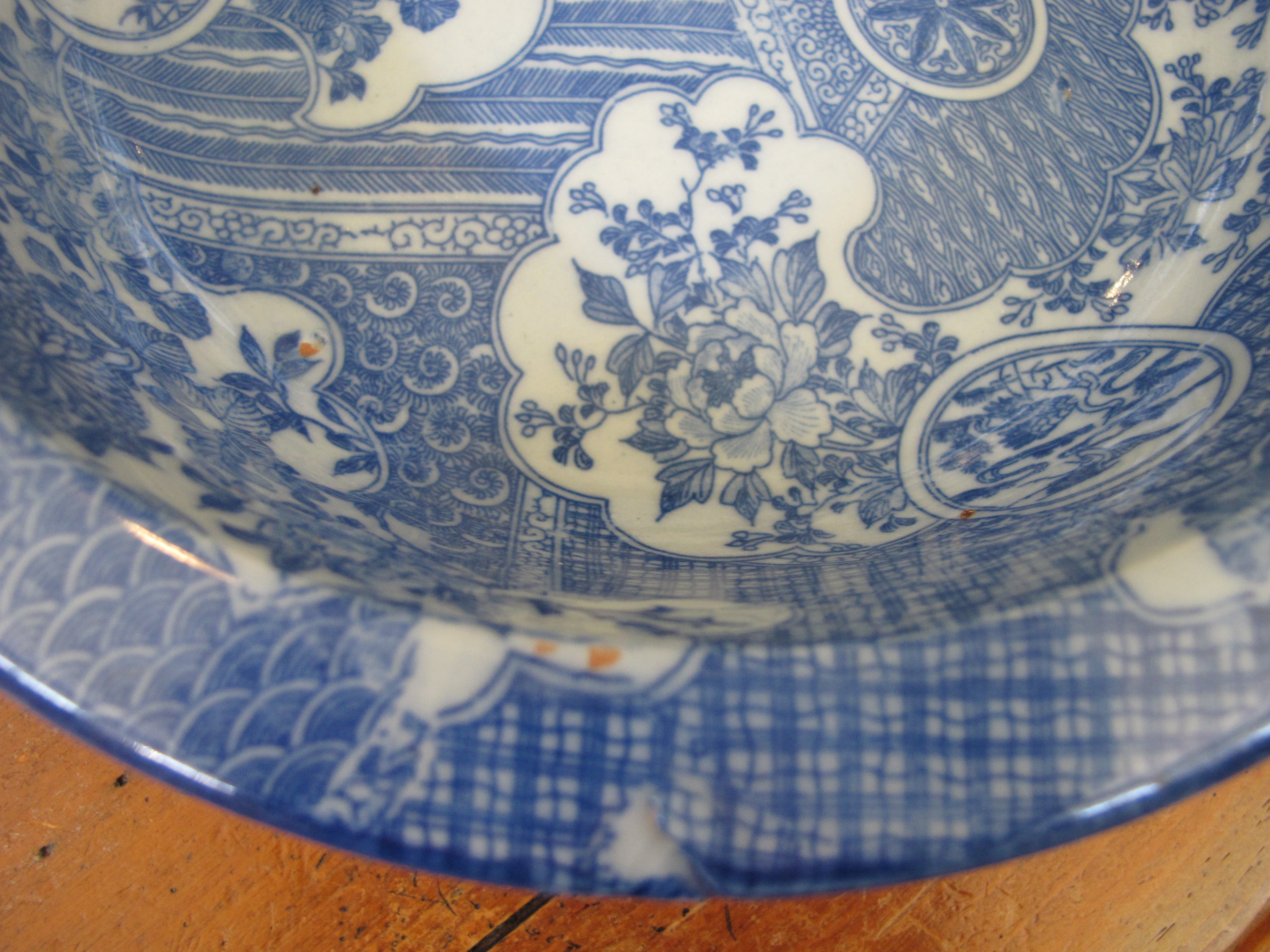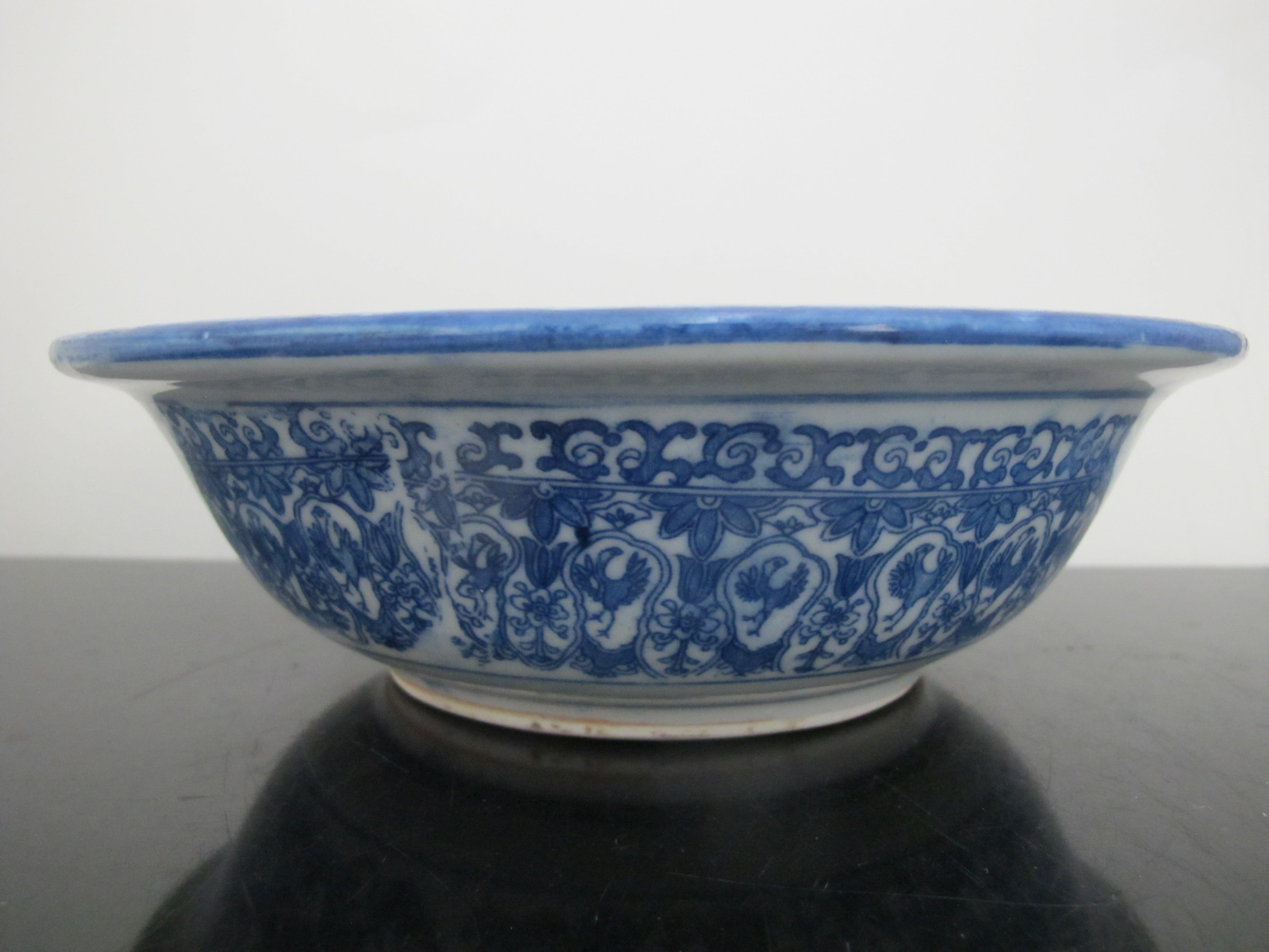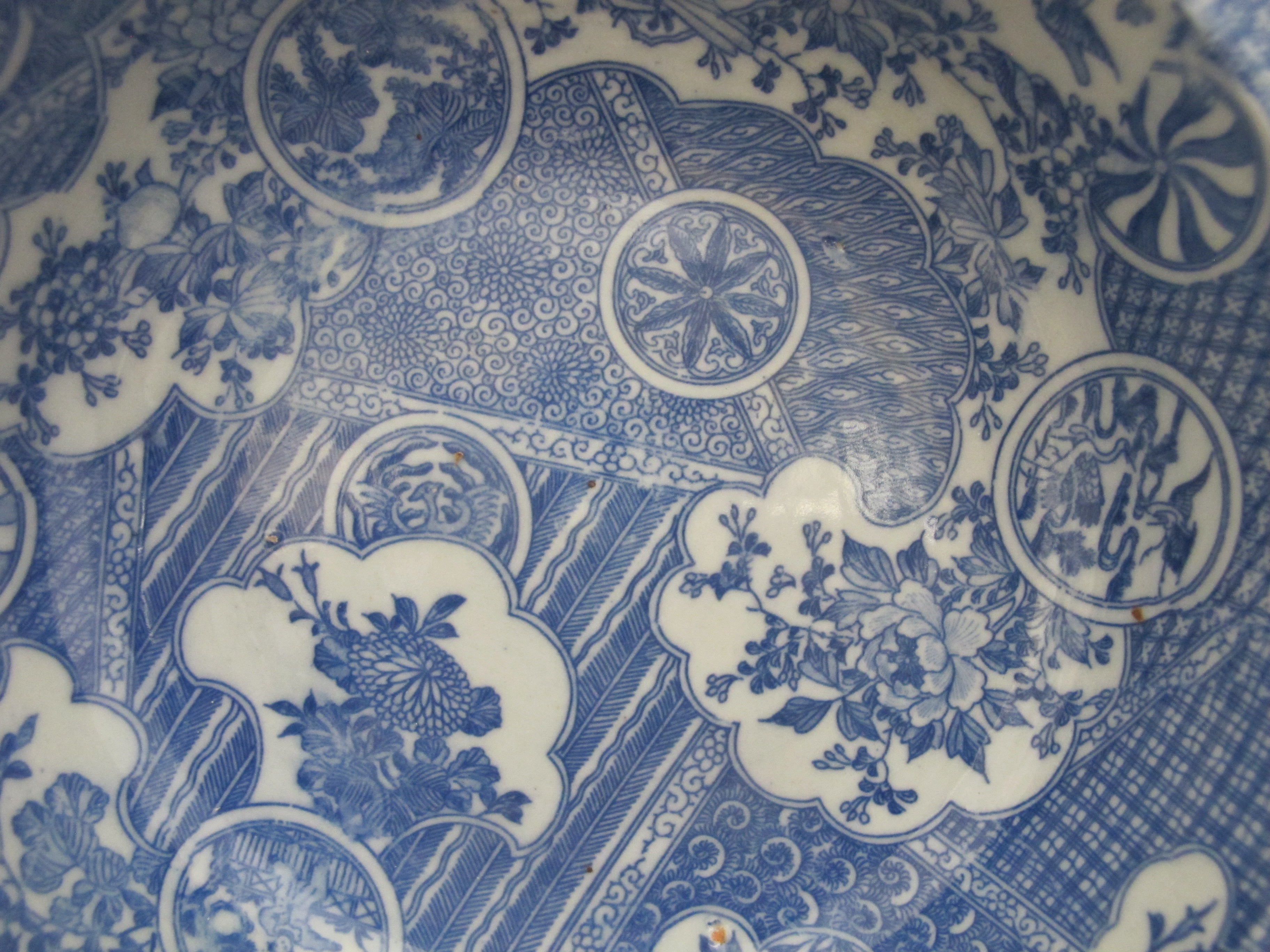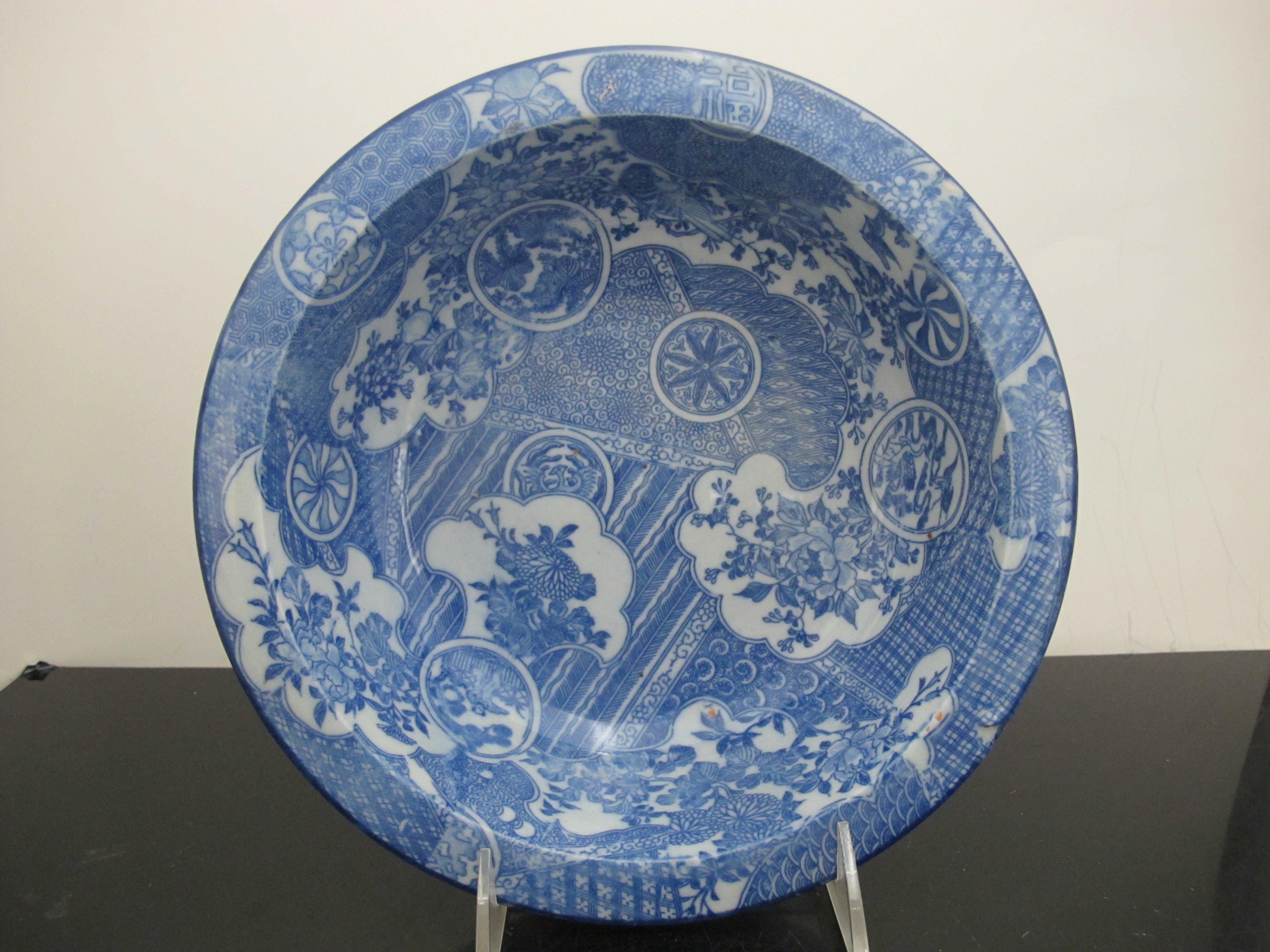 Stunning Japanese porcelain Arita ware bowl. Blue and white underglaze with an intricate floral and geometric pattern arranged in way so it covers the entirety of the bowl. Measures 9" x 2 3/4". There is a small chip or irregularity at the outer rim. It seems as if it was part of the make of the bowl because it is under the glaze. Please see photograph. Otherwise, excellent condition, no other chips, cracks, or repairs.