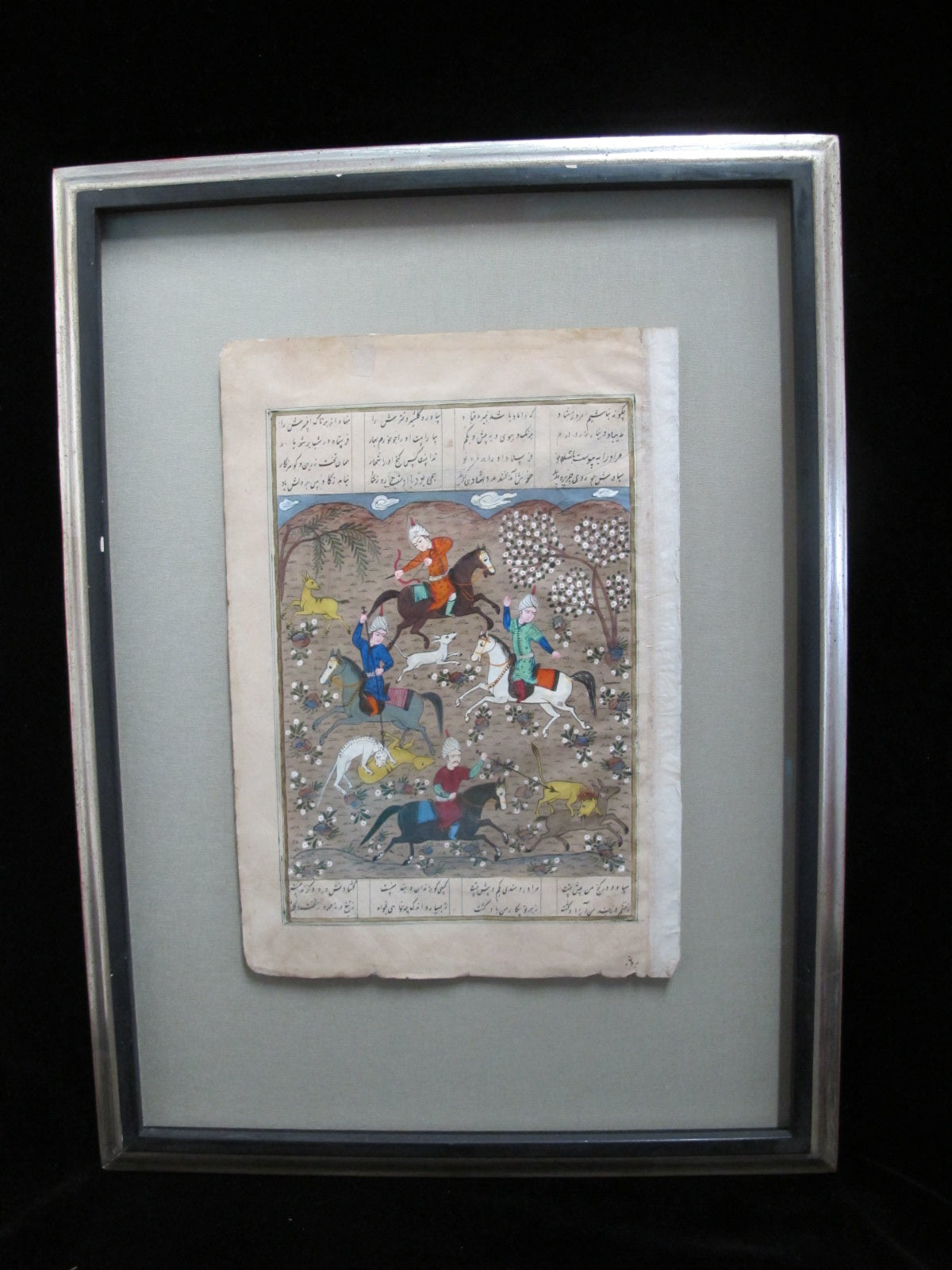 Beautiful antique Persian illuminated manuscript page with script and a finely detailed painting in bright colors showing a hunting scene with several figures on horseback hunting game. Frame measures 13 1/2" x 18", manuscript measures 11" x 8". Excellent condition for age, obvious toning to paper.