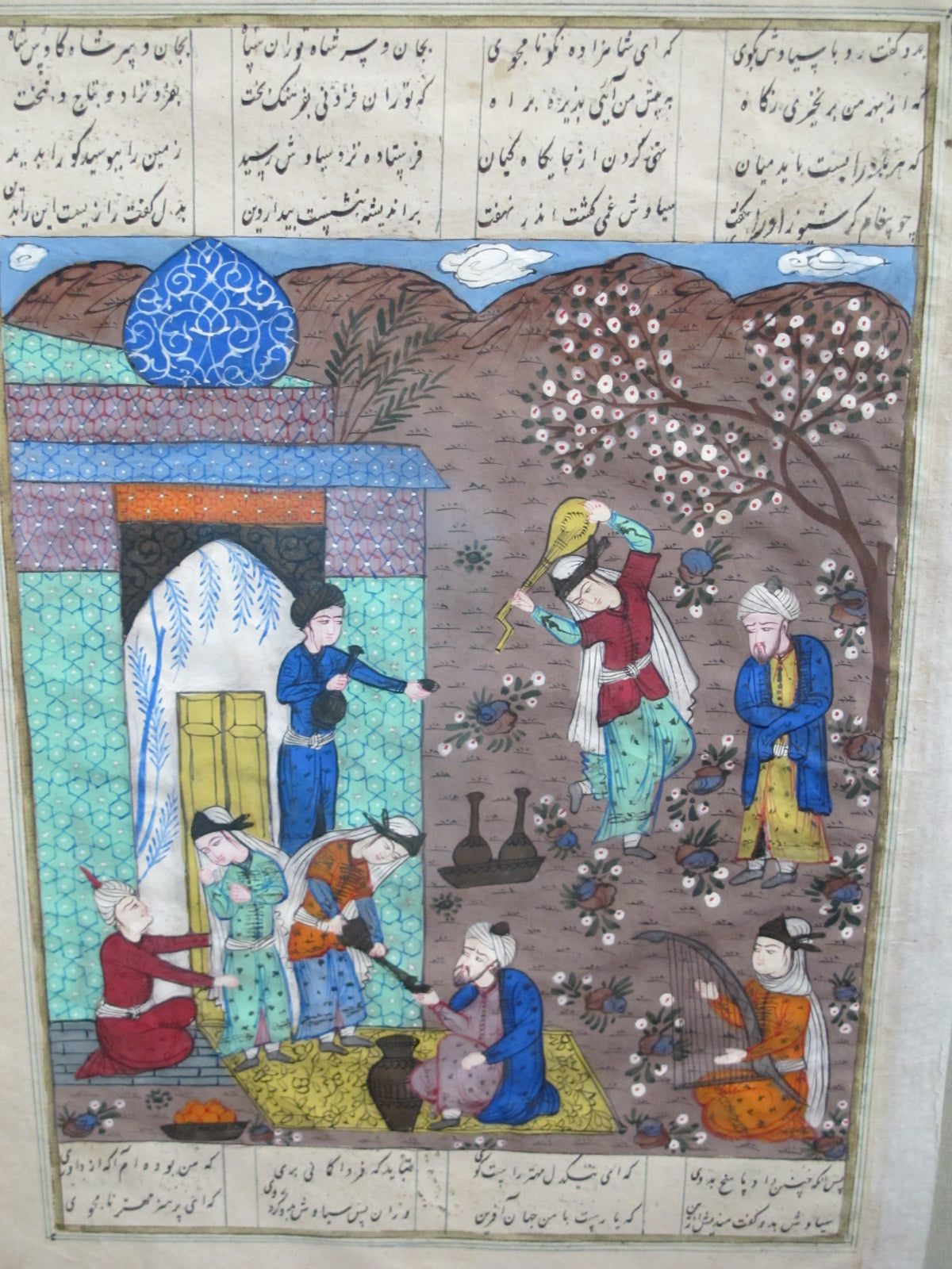 Beautiful antique Persian illuminated manuscript page with script and a finely detailed painting in bright colors of a courtly scene with a dignitary seated under a canopy, surrounded by attendants, musicians, and travelers.