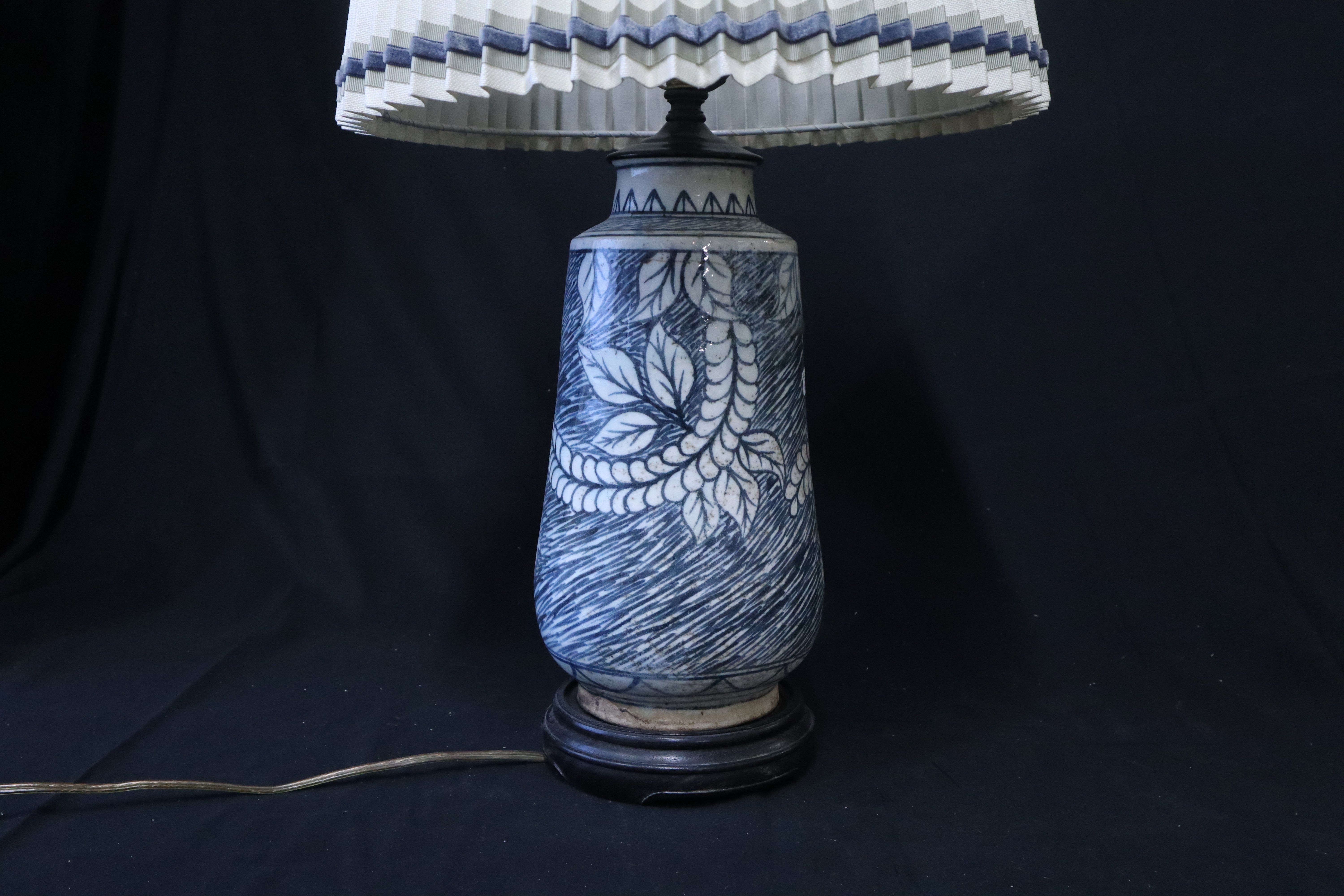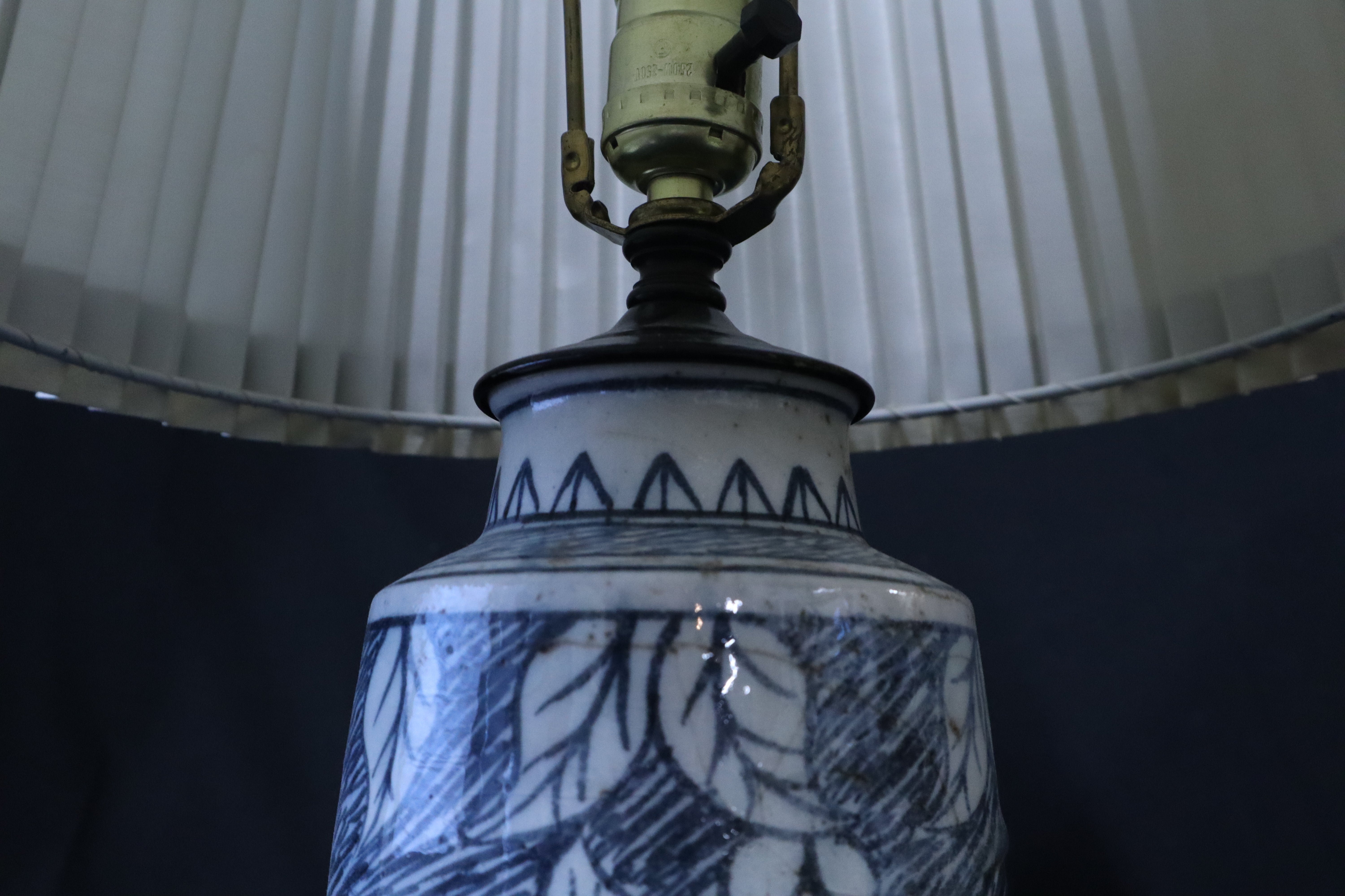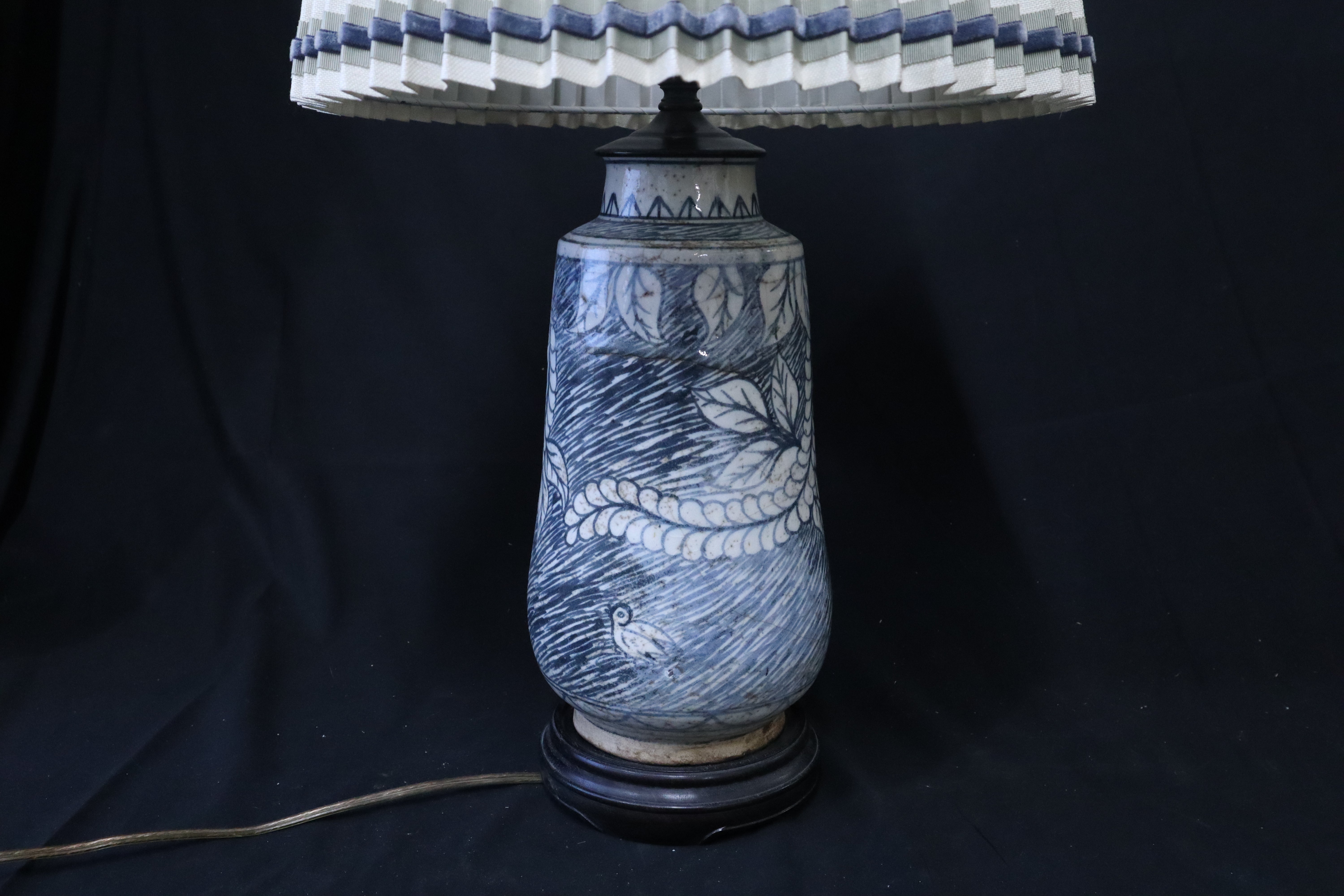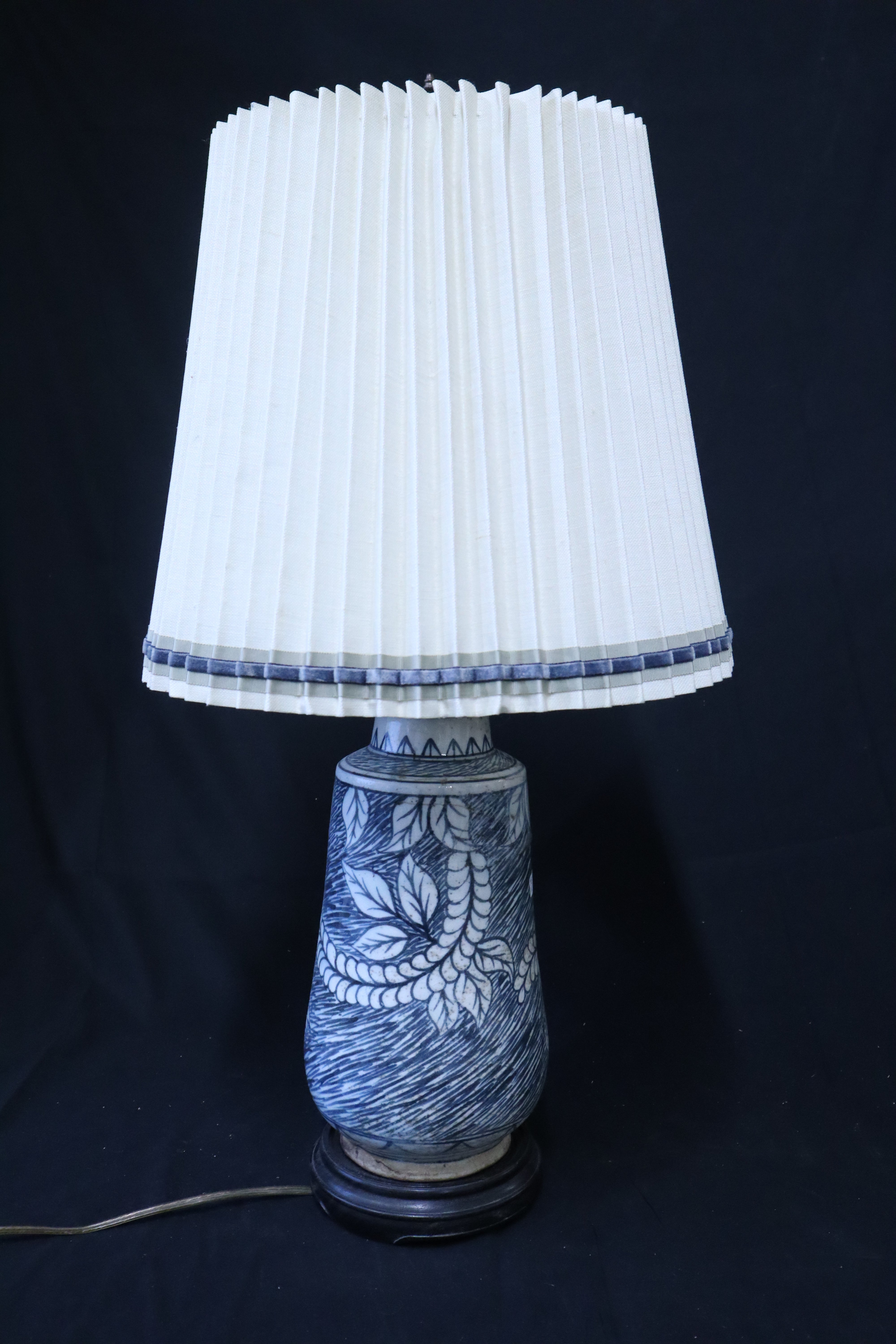 Antique Chinese pottery vase that has been reconditioned and hardwired into a gorgeous table lamp. The base is artistically decorated in a hand drawn sketchy pattern that depicts leaves around the top base and little birds near the base. It has a sloped pleated shade that has the sweetest velvet blue ribbon around the bottom edge to tie them together nicely.