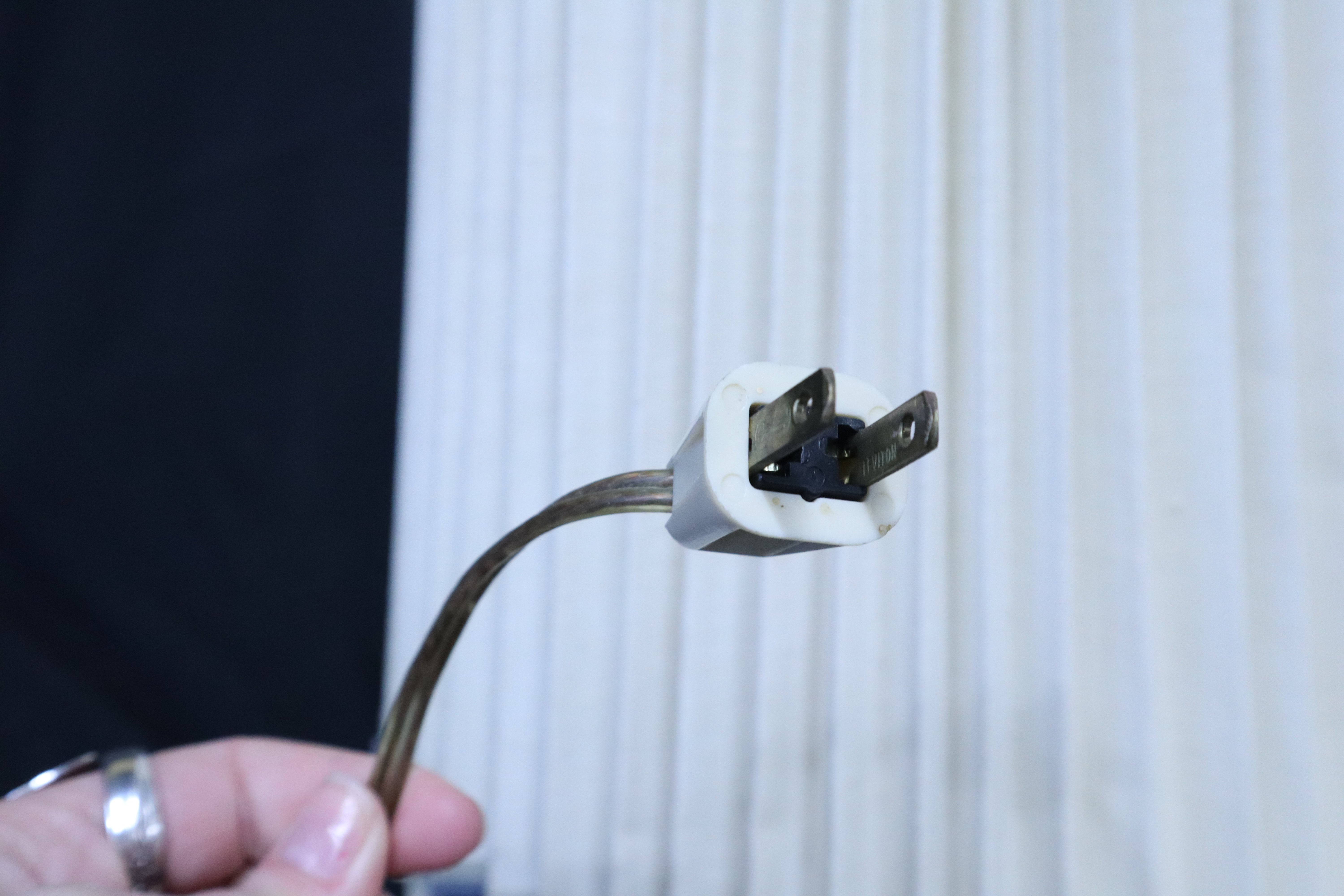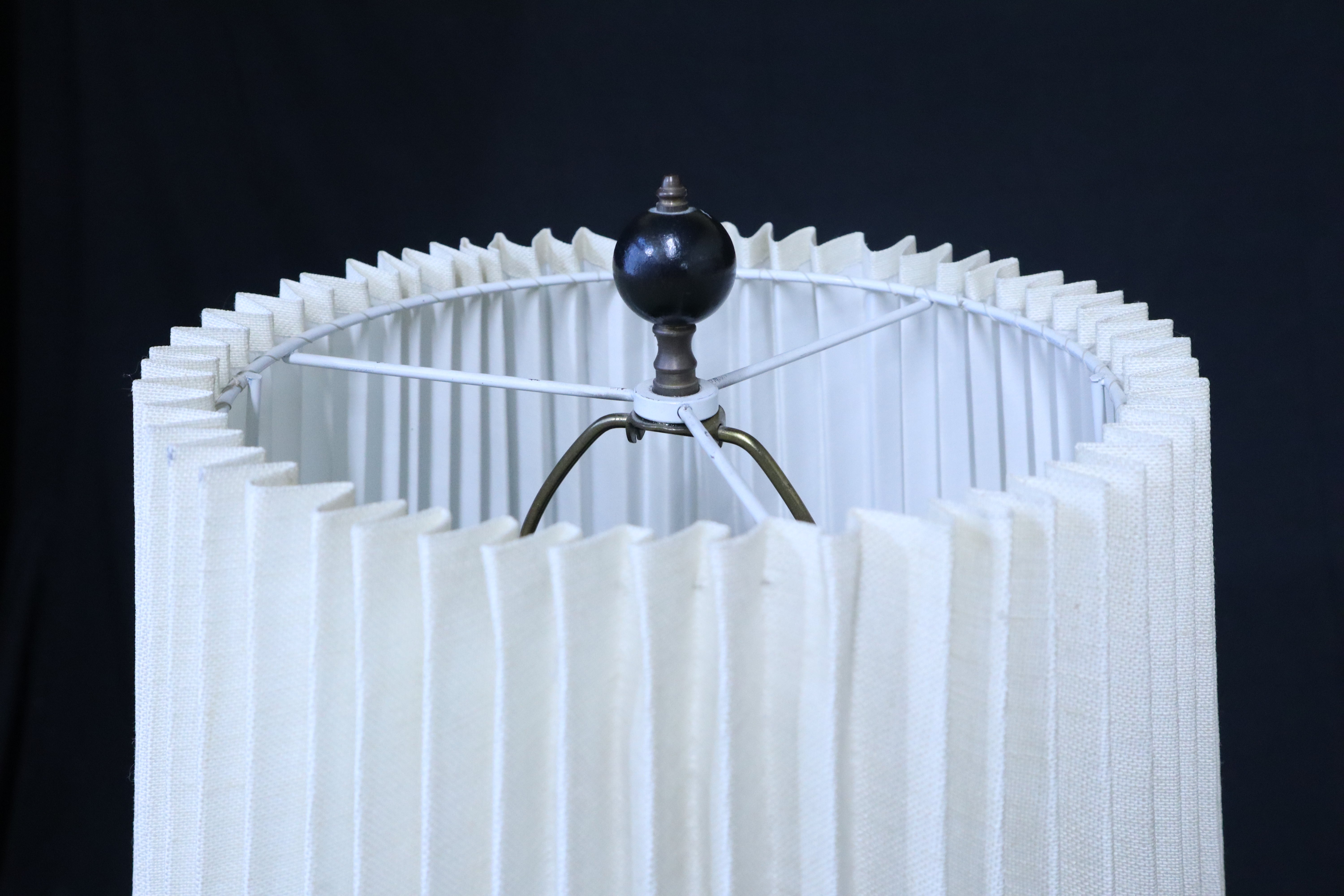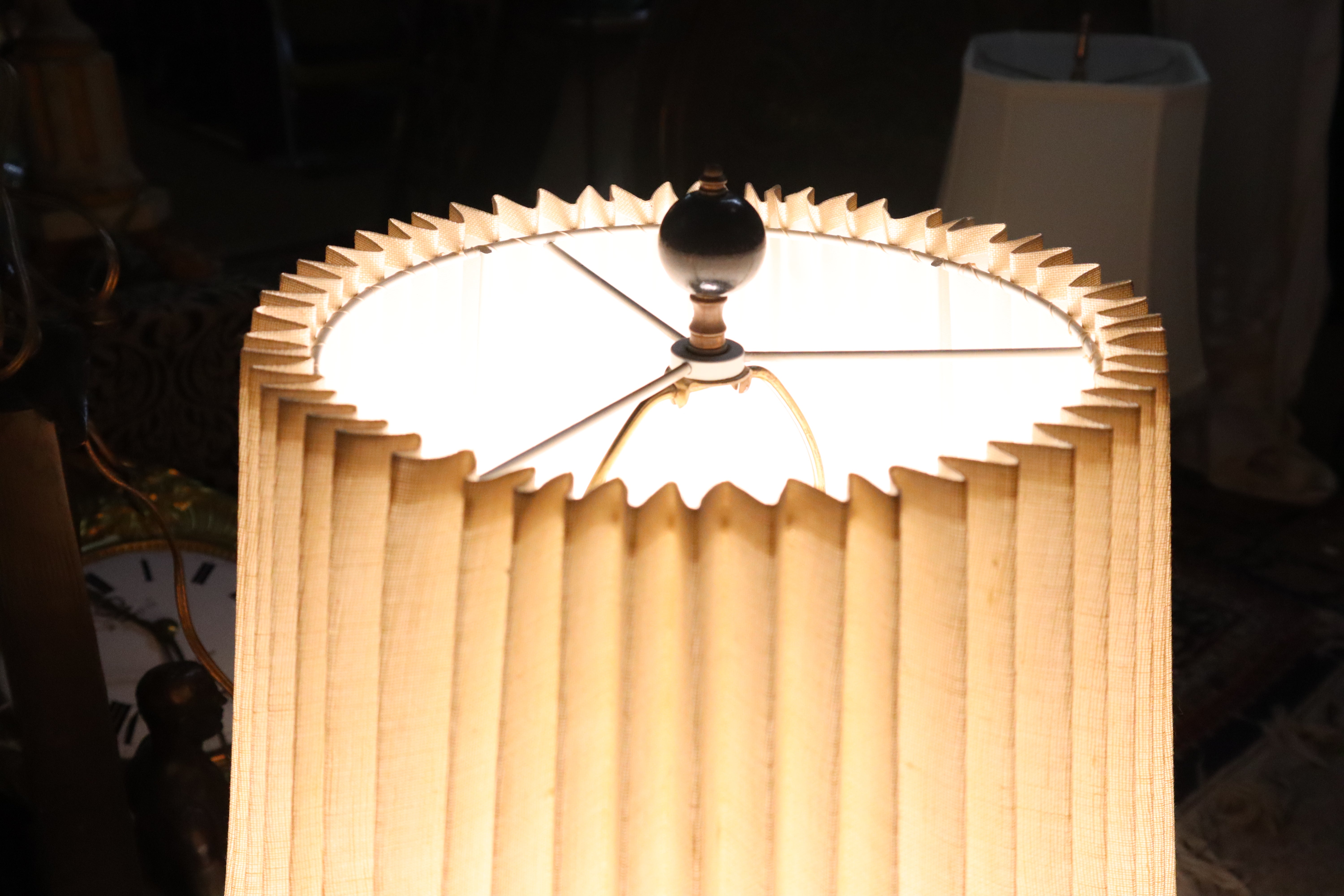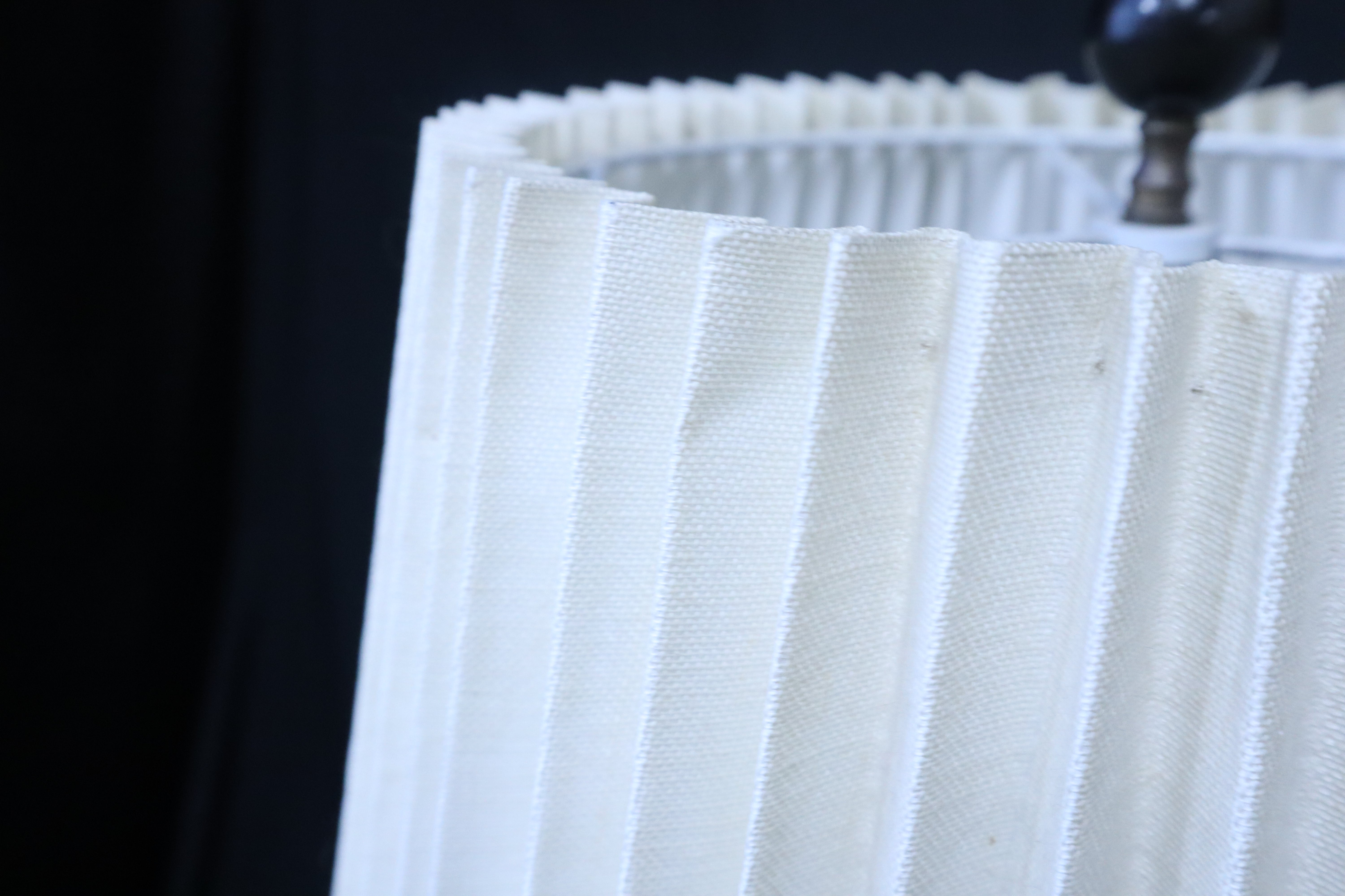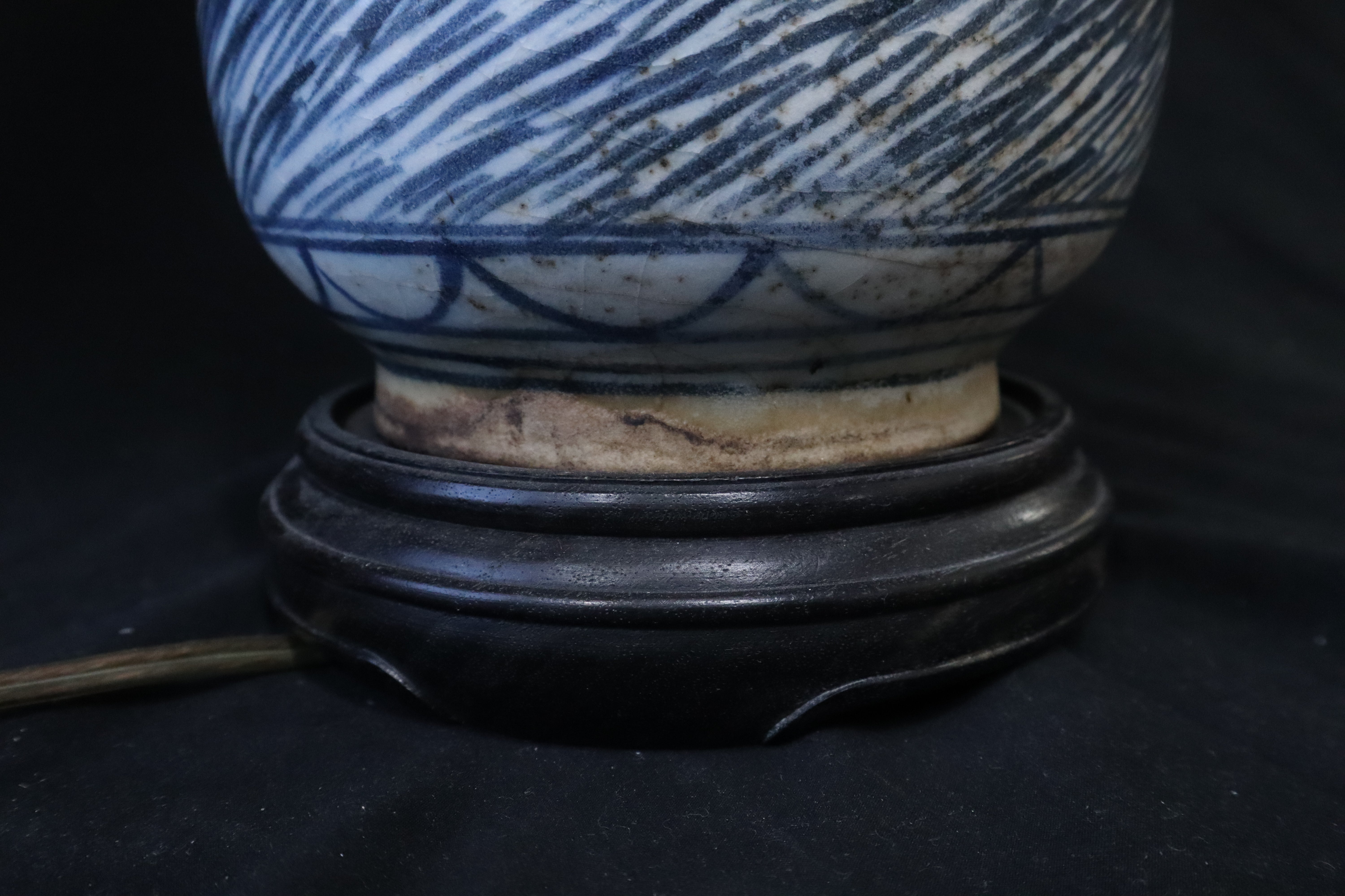 Antique Chinese pottery vase that has been reconditioned and hardwired into a gorgeous table lamp. The base is artistically decorated in a hand drawn sketchy pattern that depicts leaves around the top base and little birds near the base. It has a sloped pleated shade that has the sweetest velvet blue ribbon around the bottom edge to tie them together nicely.