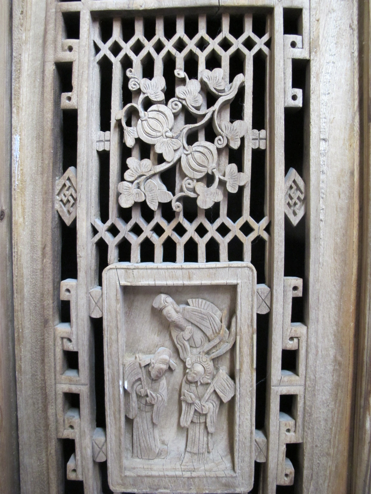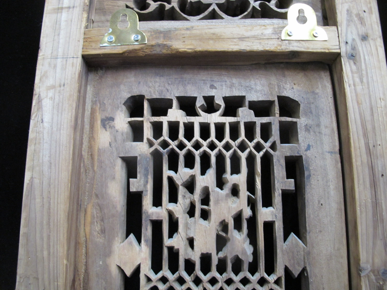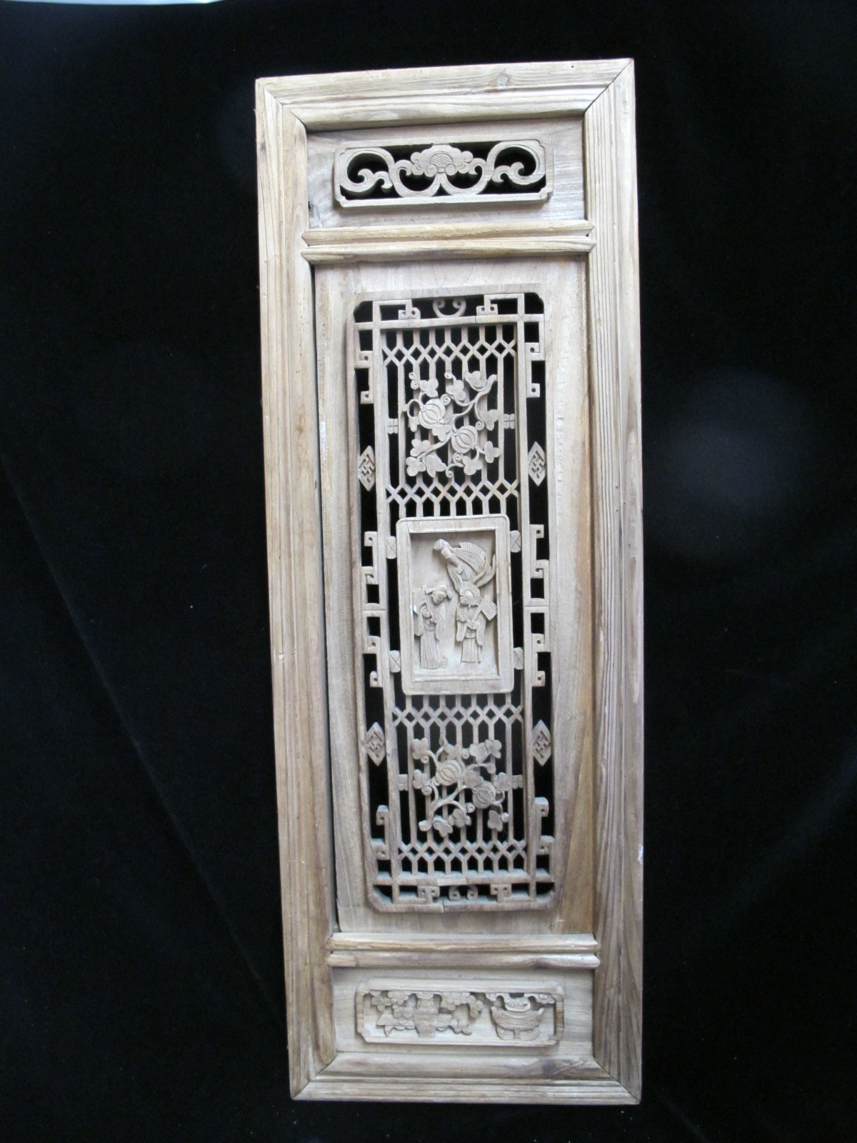 Chinese carved wood window screen or art panel. Pierced wood with floral figural carvings. Shows 3 figures, possibly scholars in traditional motif.