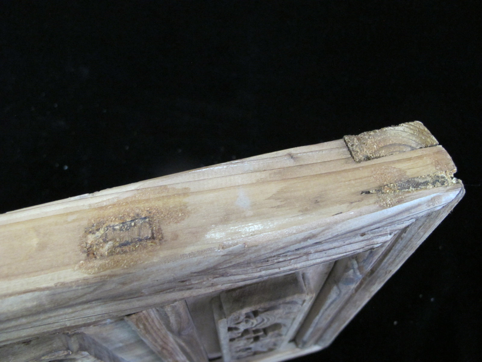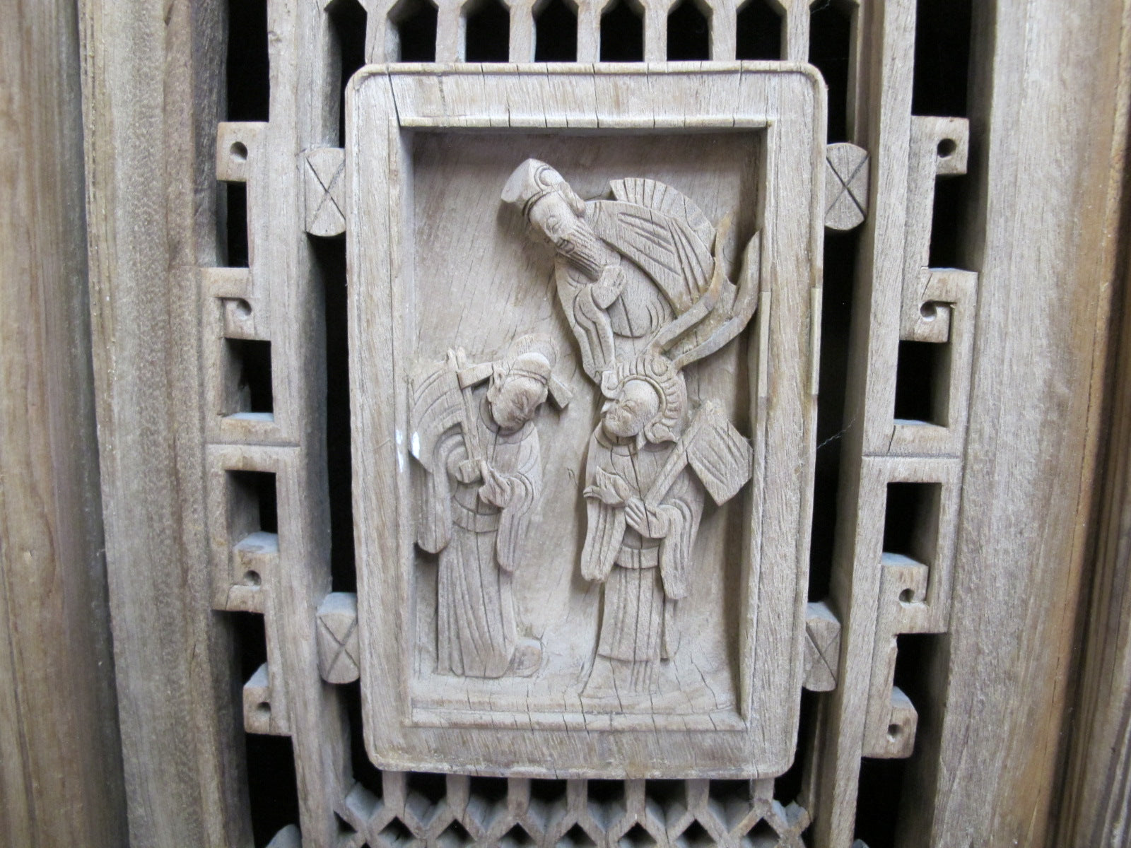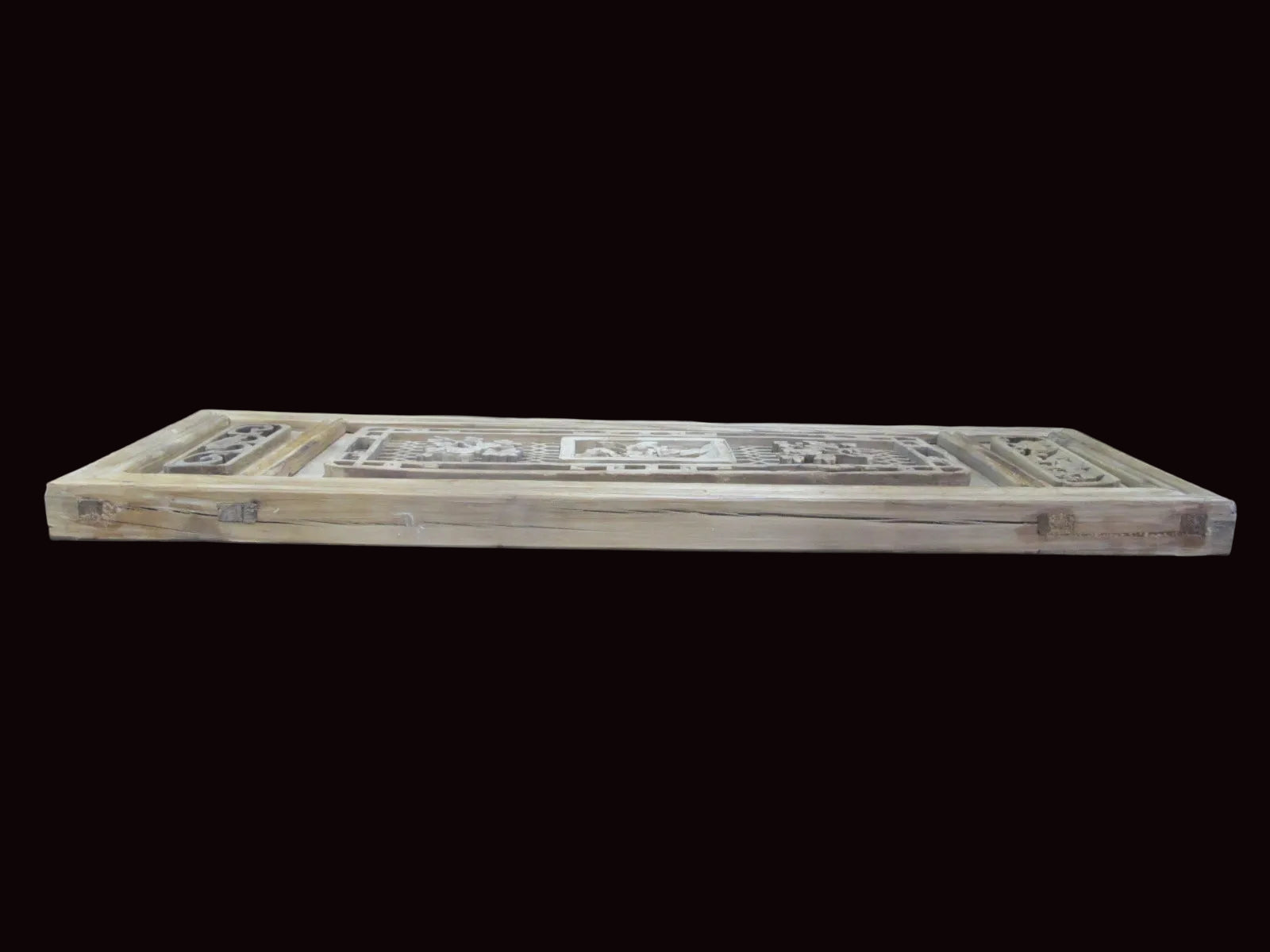 Chinese carved wood window screen or art panel. Pierced wood with floral figural carvings. Shows 3 figures, possibly scholars in traditional motif.